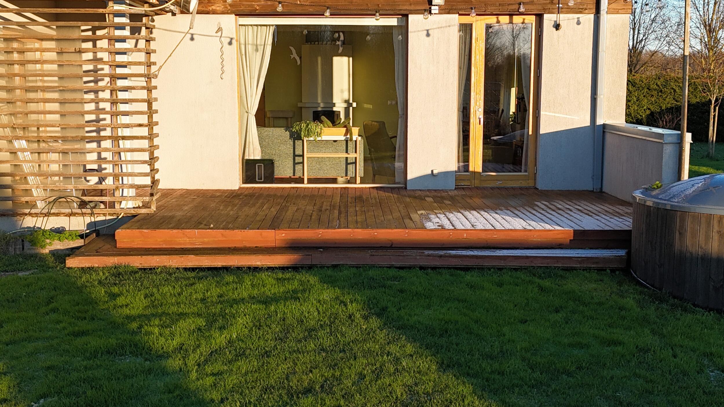 Praegune terass on ehitatud liiga õhukesest lauast ja suure akna poolses servas on lauad nõgusad, toetuvad fibole. Kogu tasapinda tõsta ei saa siis ei avane vasakul rõdu all olev uks. Suure akna juures tuleb laudade otsad ühemaks saagida.