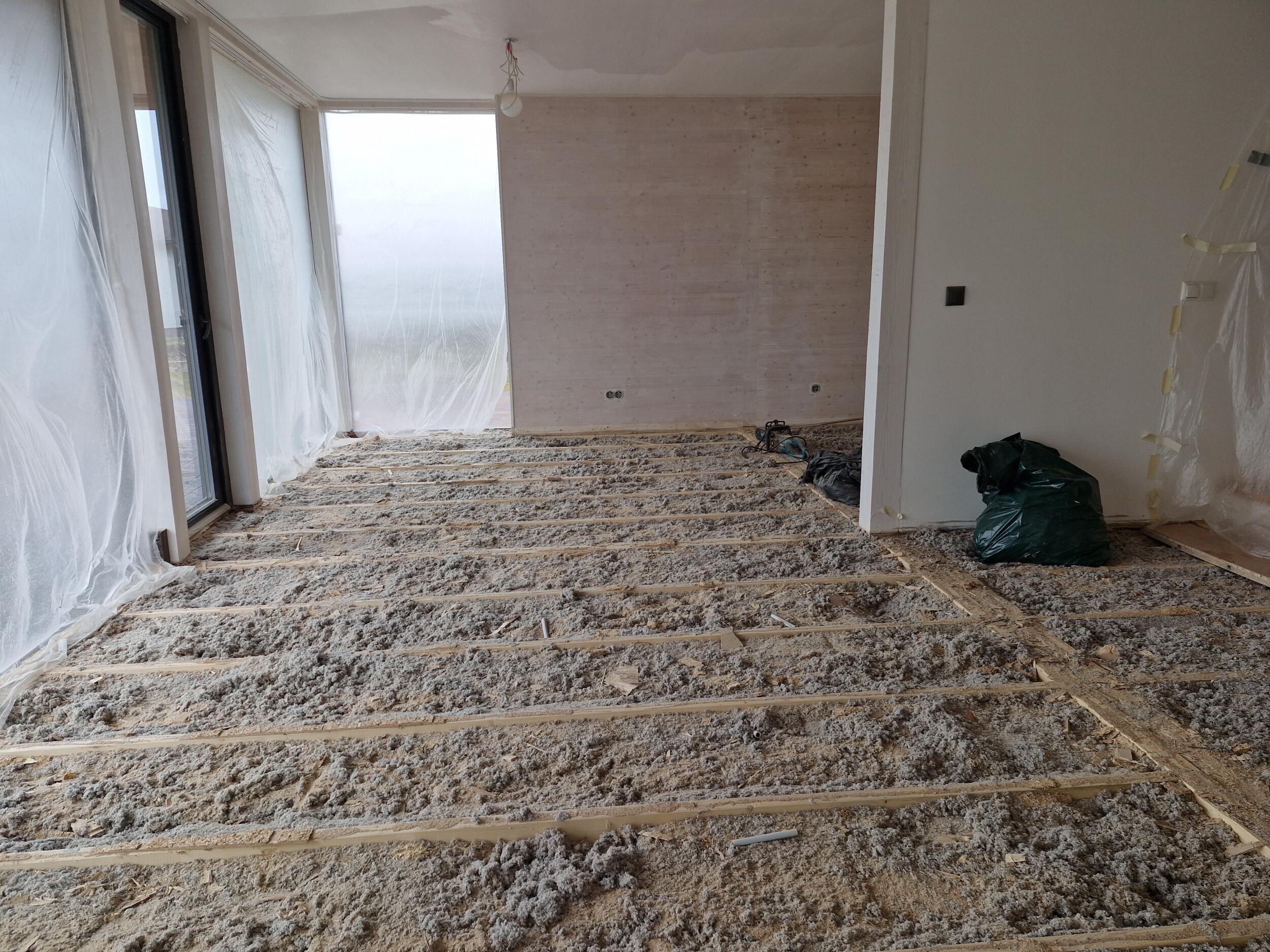 Punni ja soonega puitlaastplaadi paigaldus puittaladele liimi ja kruviga.