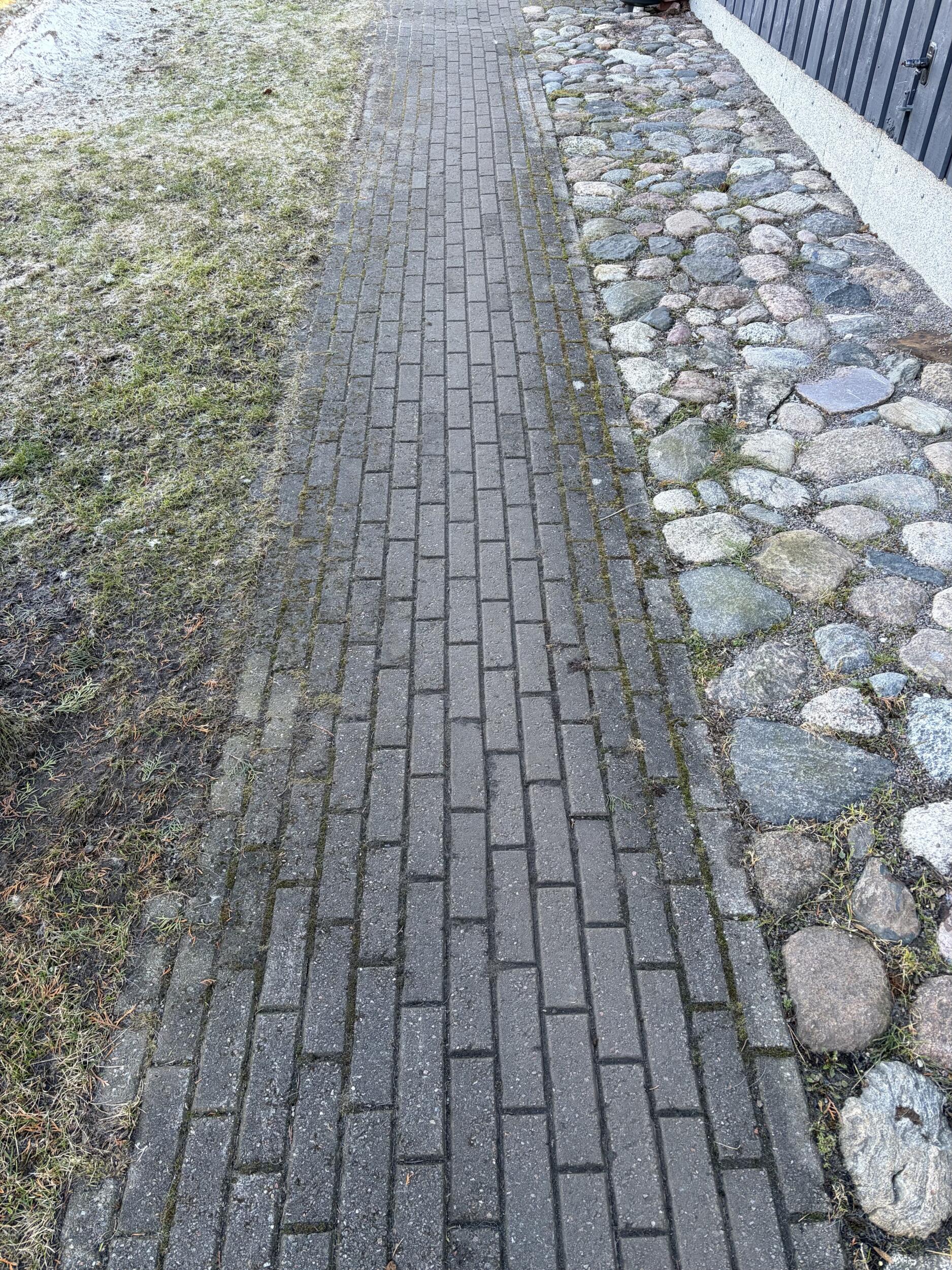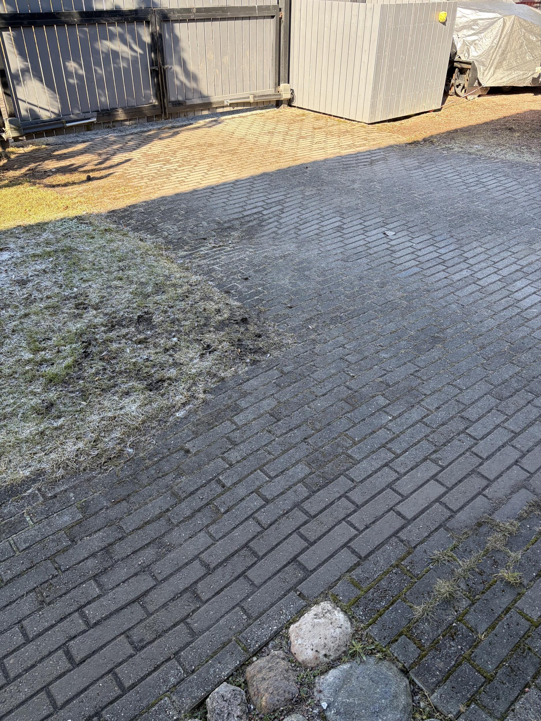 (B) Tänavakivi ala kõrval on 76m2 suur ala, mis on paar aastat tagasi kaetud graniidisõelmetega. Samuti korralik põhi alla tehtud. Otsus ala graniitsõelmetega katmiseks ei olnud õige otsus. Ala ei ole visuaalselt ilus, pikapeale kasvavad taimed läbi. Selle ala sooviks katta seda tyypi tänavakiviga, milles aukudes saaks kasvada muru. See ala pole aktiivses kasutuses (seal pargivad haagised, murutraktor).