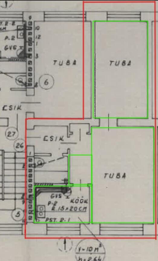 Köögi mõõdud on 5 m2, elutuba 14,2 m2 (v.a esiku ja köögi vaheline väike osa, selle mõõte hetkel ei tea), tagumine tuba 13,3 m2.