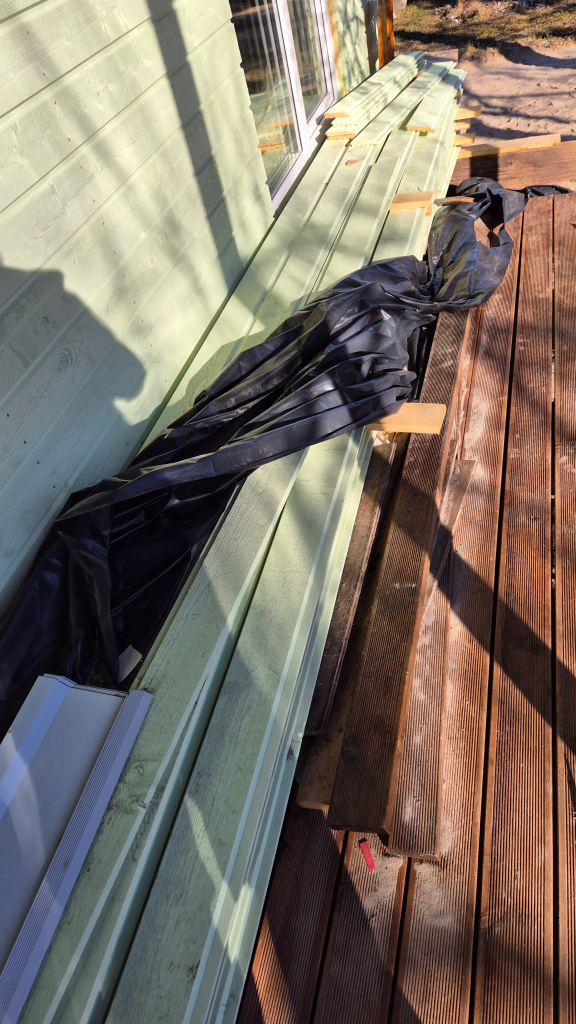 Värvitud voodrilauad olemas. Tuulekati ja katusealuse lauad (Värvitoon RAL7040) ja muud vajalikud materjalid töövõtja poolt