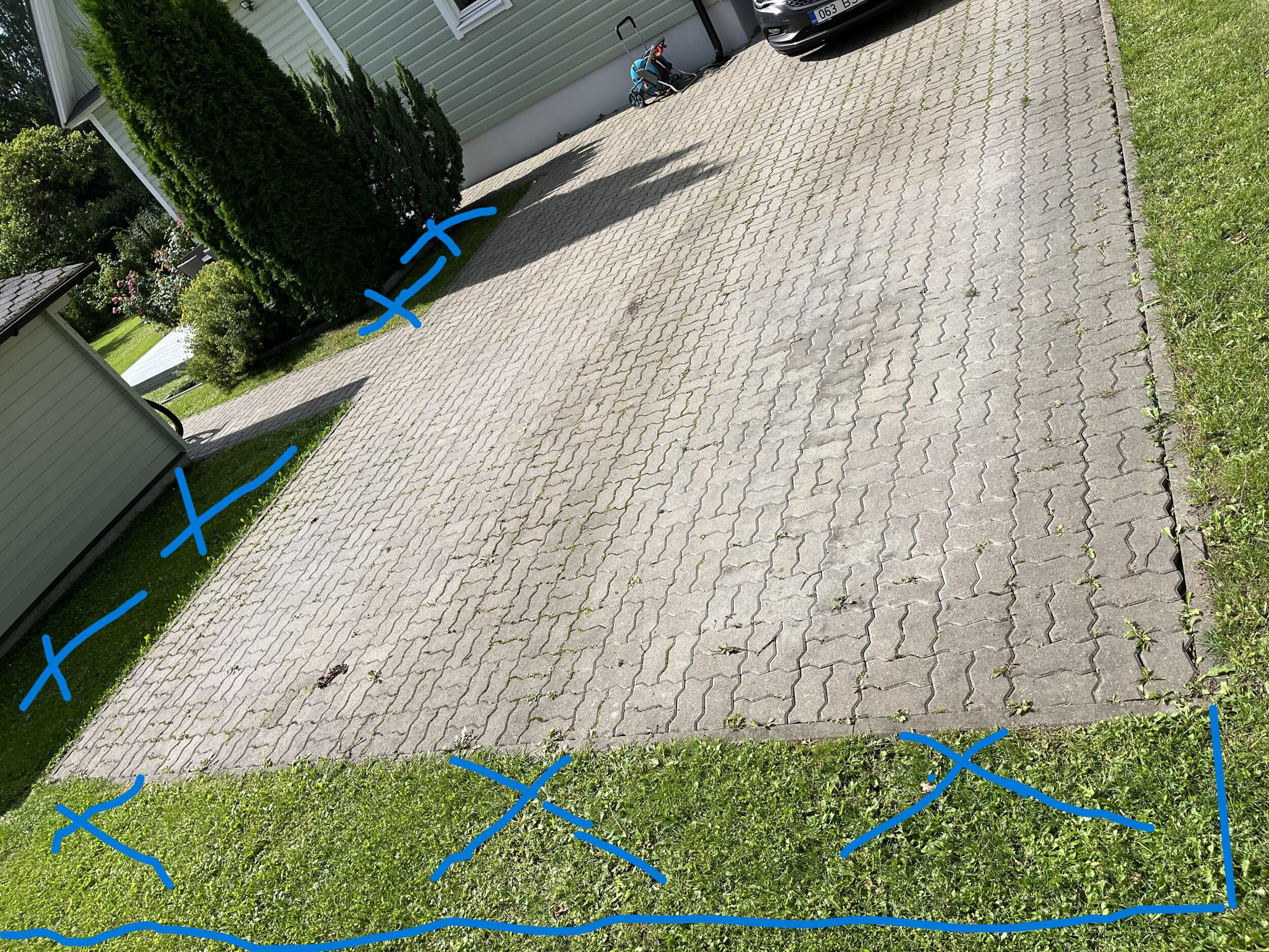 Muru eemaldamine, muru all on suures osas jäme killustik. Kogu täitematerjali ja aluspinna ettevalmistusega tööd, koos kivi paigaldusega ja äärekivi liigutamisega, et parkla saaks suuremaks hoovis.