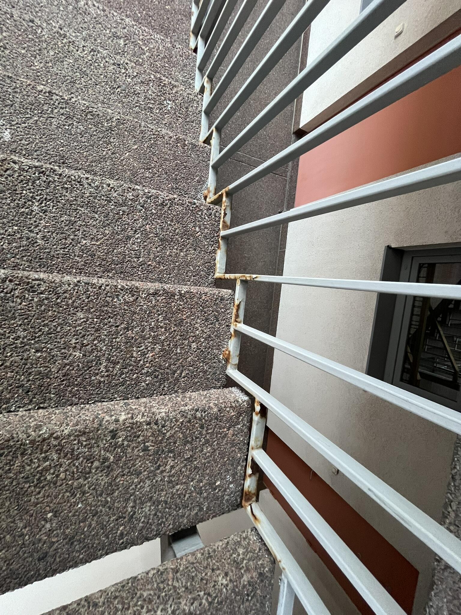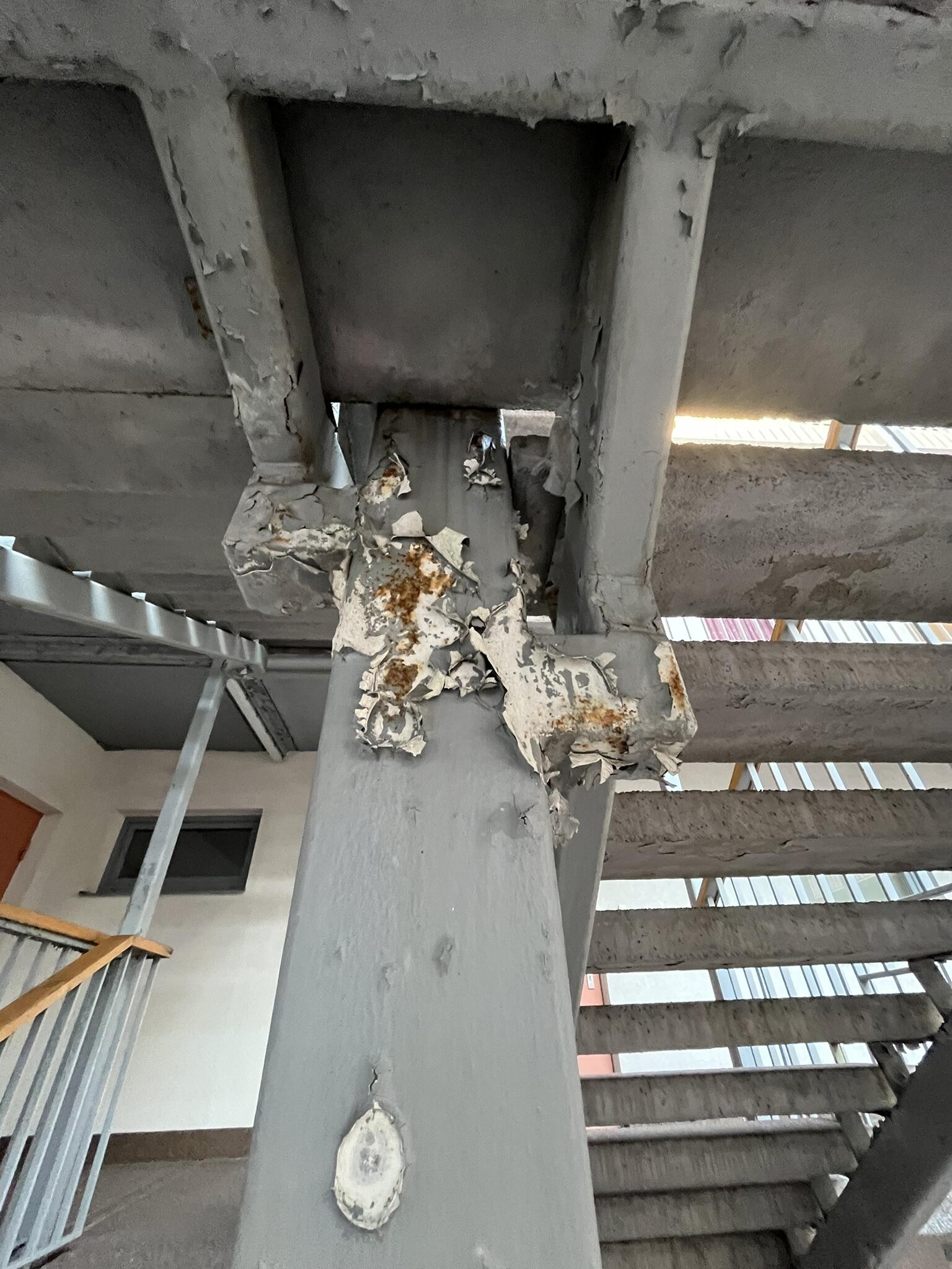 Ol. ol olukord: 2003 aastal valminud kortermaja aatriumi ja trepi teraskonstruktsioonide värv on amortiseerunud ja vajab värskendust.