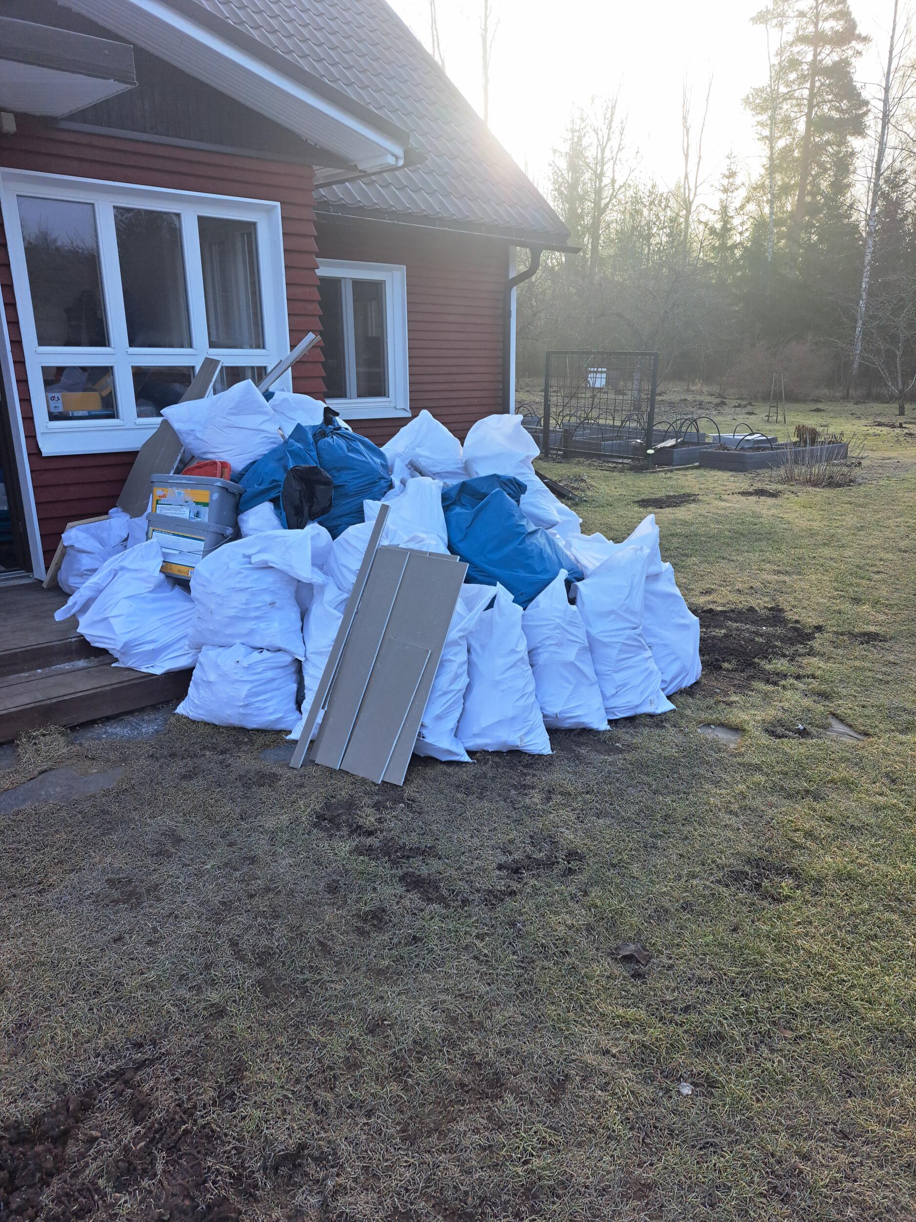 Pesuruumi lammutusjäätmed. 60% betoonpõrand 6 m2 , peale selle kipsplaat koos keraamilise plaadiga. Mõned kotid ka segajäädet. Asuvad linnamehe puhkekeskuse lähedal. Autoga täitsa ligi ei pääse seega vaja vedada kuskil 50 meetrit