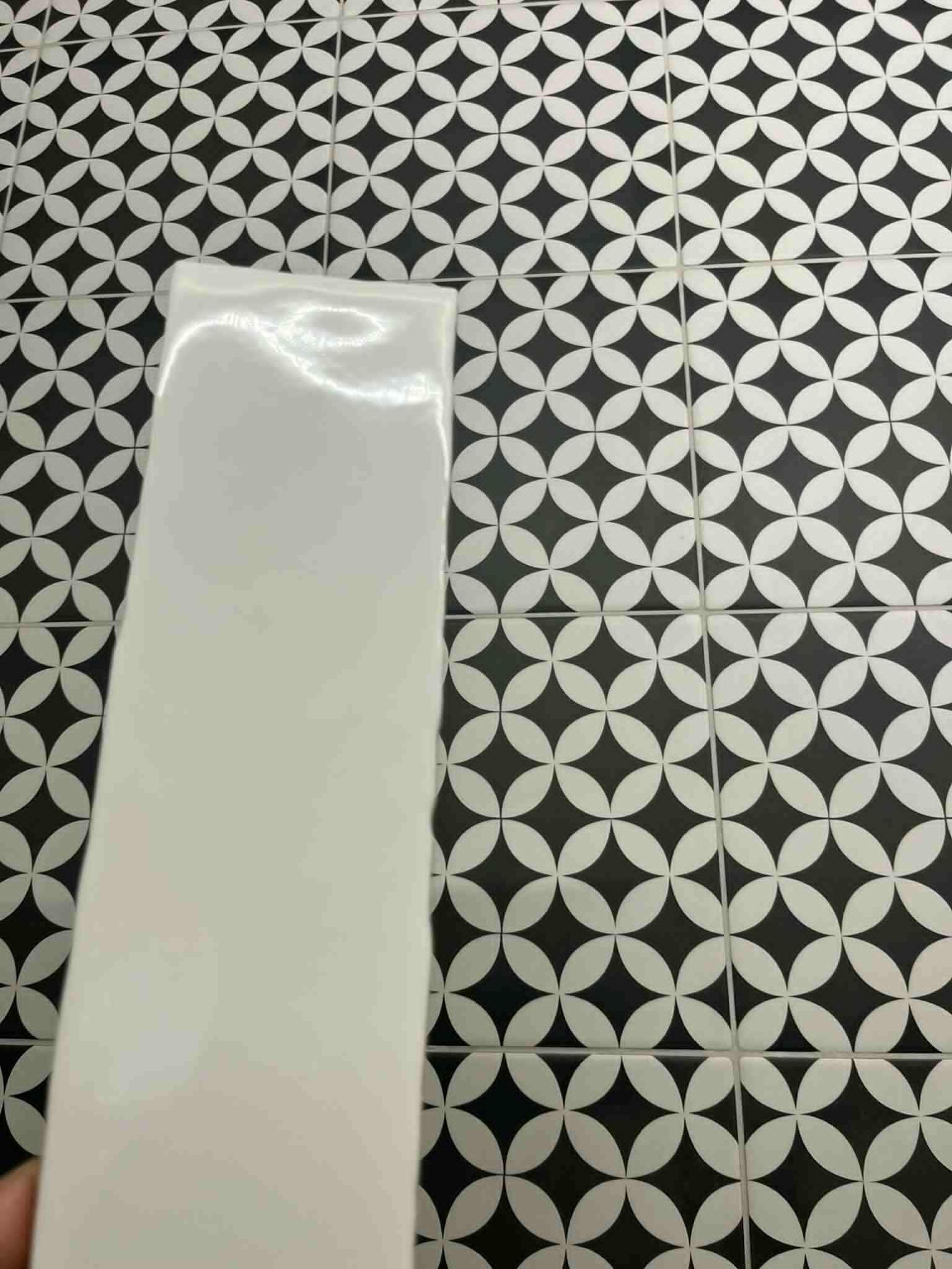 Seina läheb püstiselt valge plaat 75x300mm ja põrandale mustriga plaat. Välised nurgad nurgaliistuga.