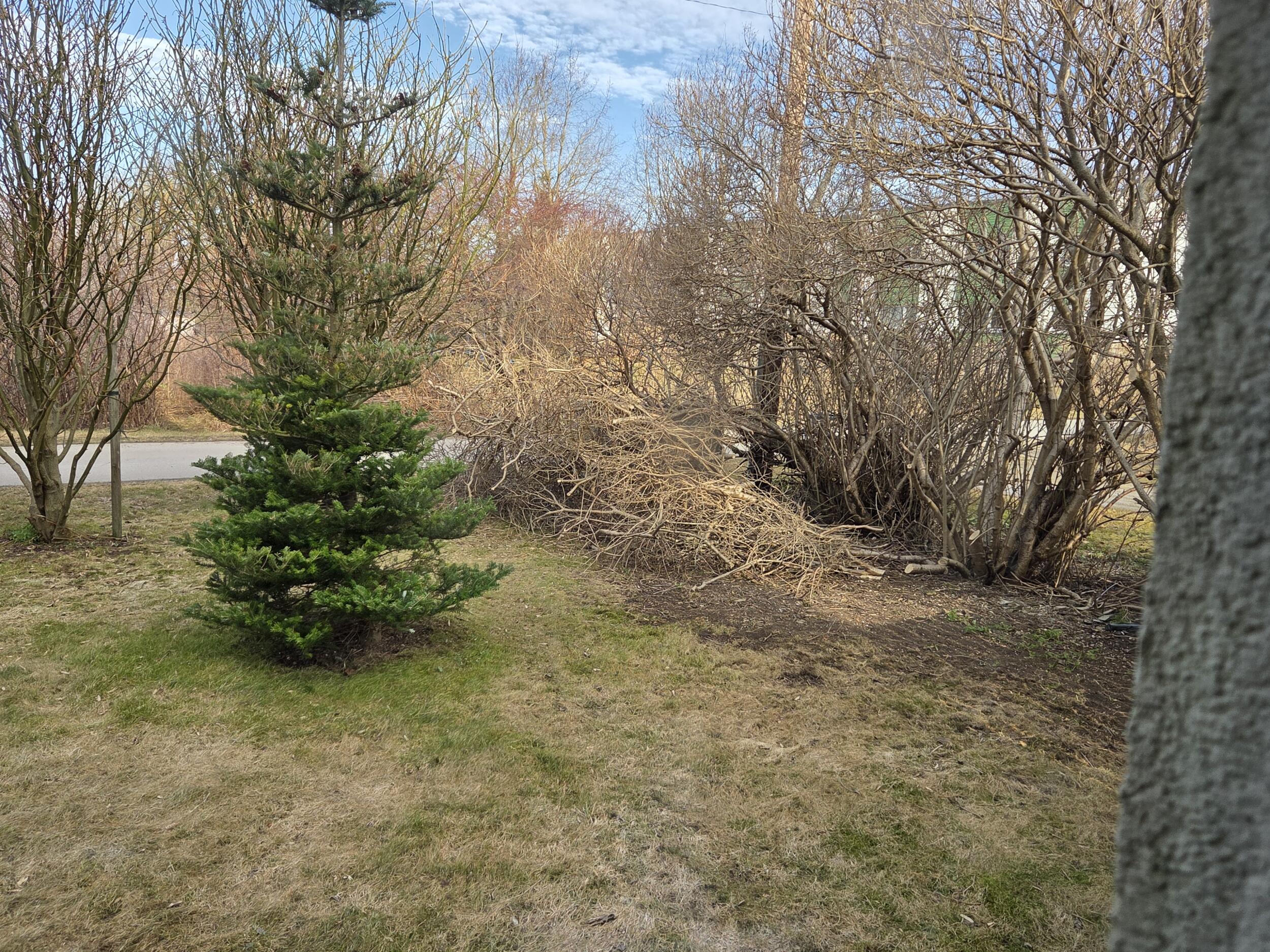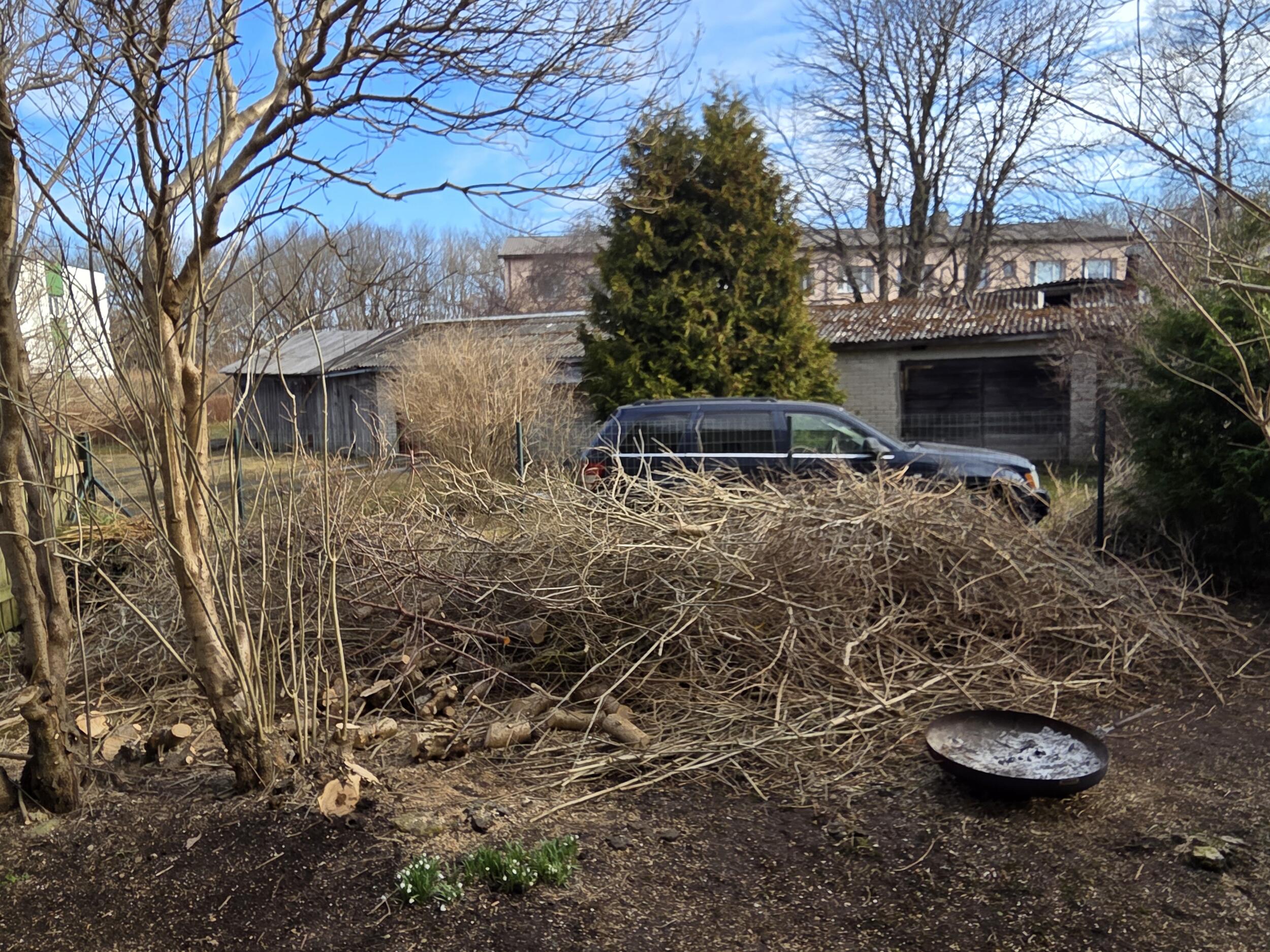 Piltidel nähtav väike kogus, üsna peenike oksamaterjal vaja kinnistult utiliseerida. Ligipääs hea, see kogus mahub suurema kaubiku peale, saab ligi ka haaratsiga tehnikaga. Suurem hunnik on vaja üle 1.5m aia tõsta. Võib ka kohapeal hakkida/purustada, kui hakkur on olemas.