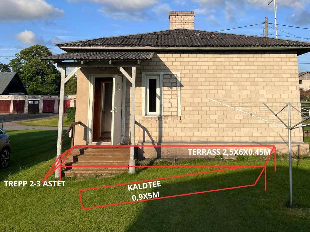 Terrass- 2,5x6m, kõrgus 0,45m (nii, et välisuks käiks lahti.) Terrass ehitada nii, et ei jookse mööda fassaadi, vaid vastu olemasolevat soklit või väikse varuga.
