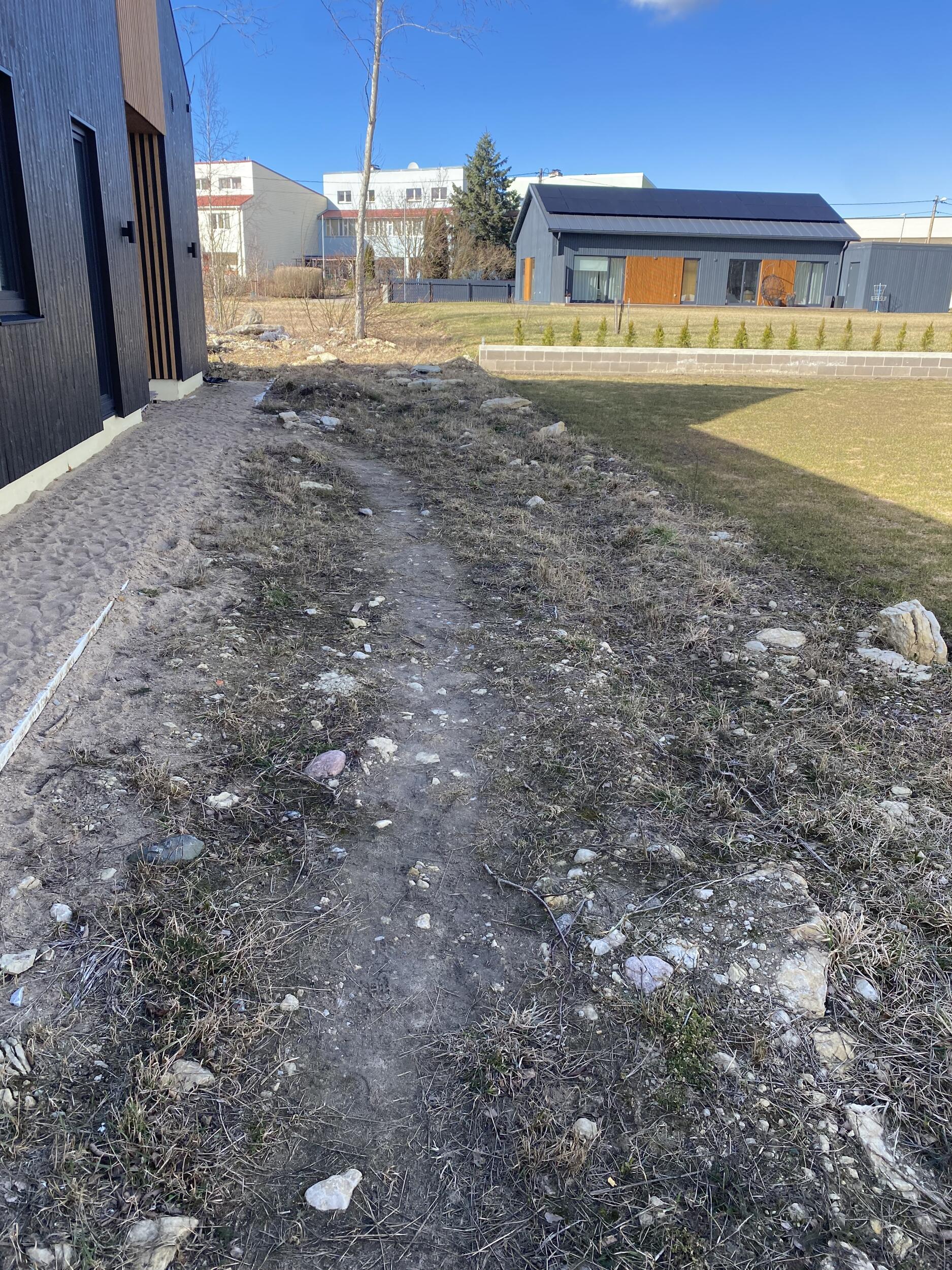 1) Pinnase koorimine ja tasandamine – koguala ca 600m2. Hetkel on krundil suur kõrguste vahe ca 80 cm. Kõrgemad kohad tuleks koorida, madalamad kohad täita. Tegemist on peamiselt vanema täitepinnasega – muld, paas (suured tükid), asfaltjäätmed (piltidel).