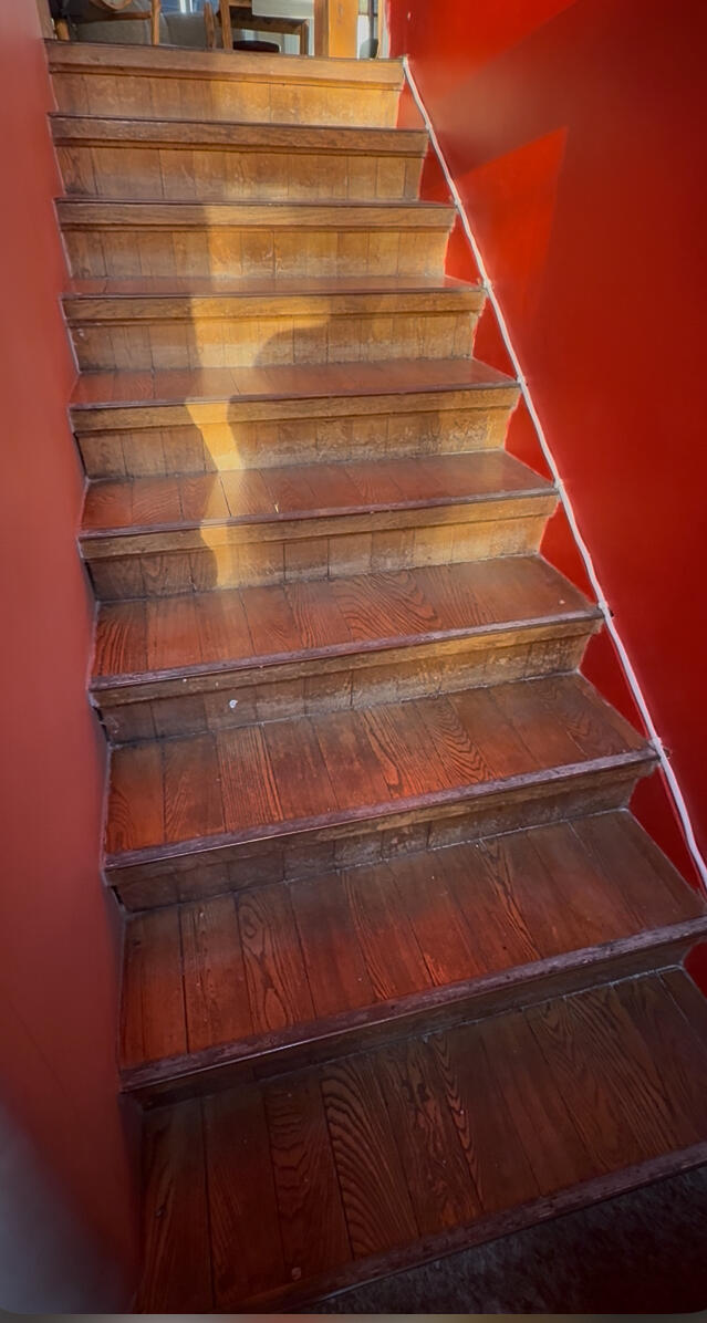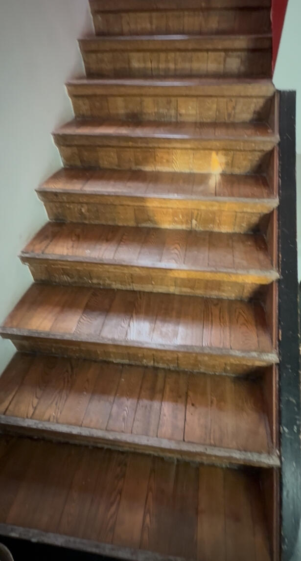 Kaks treppi ja nende vahele jääv trepimade vajavad taastamist.