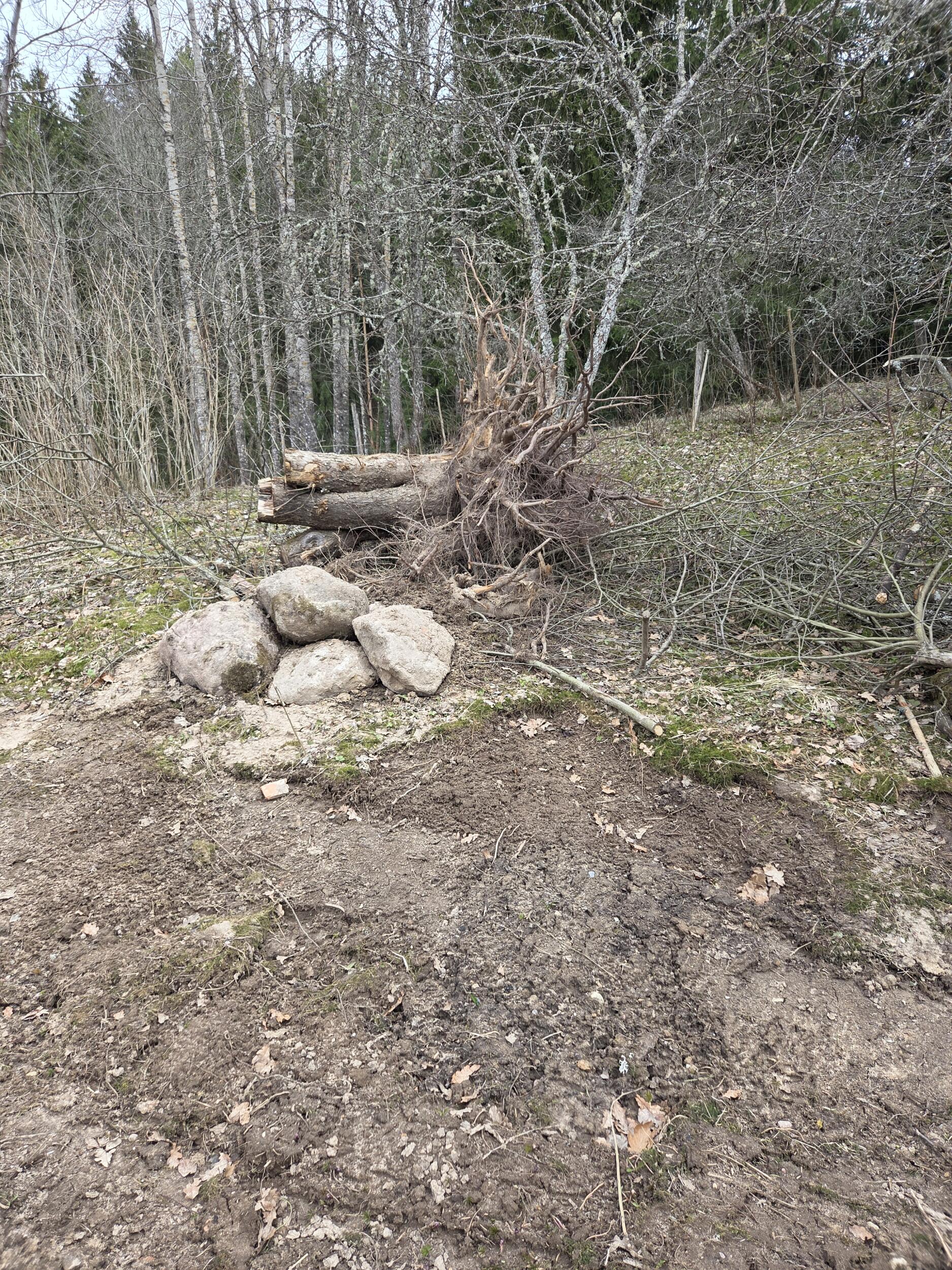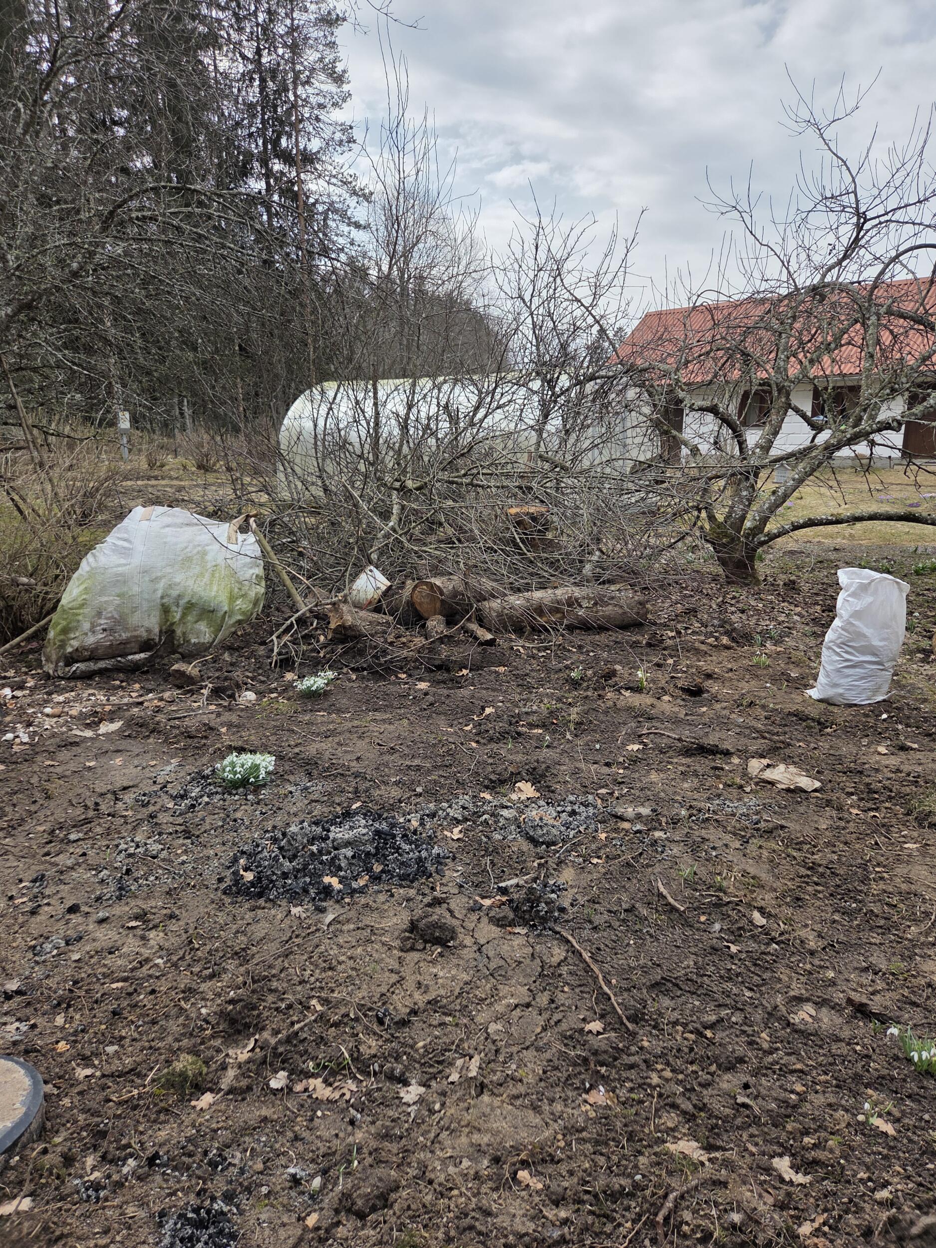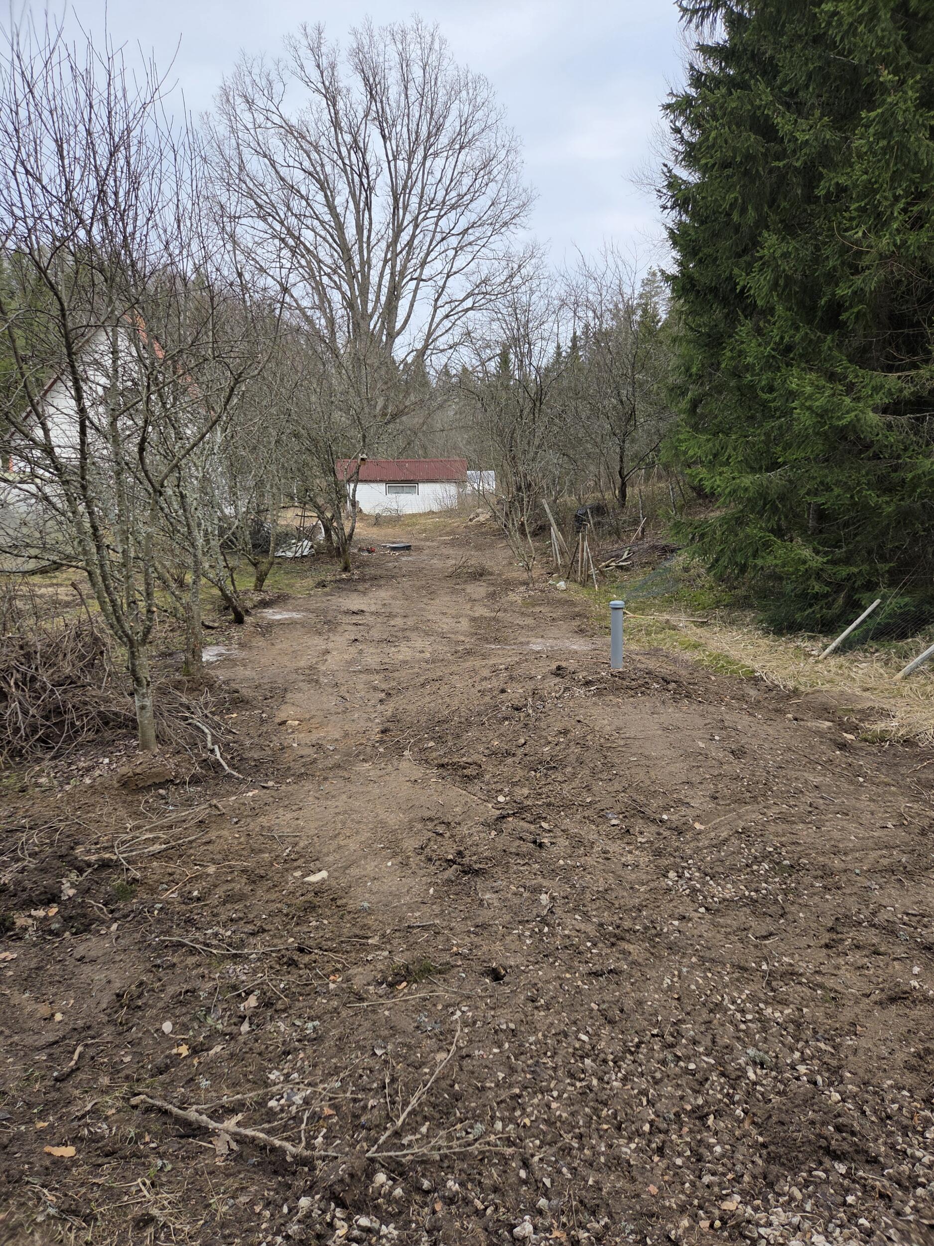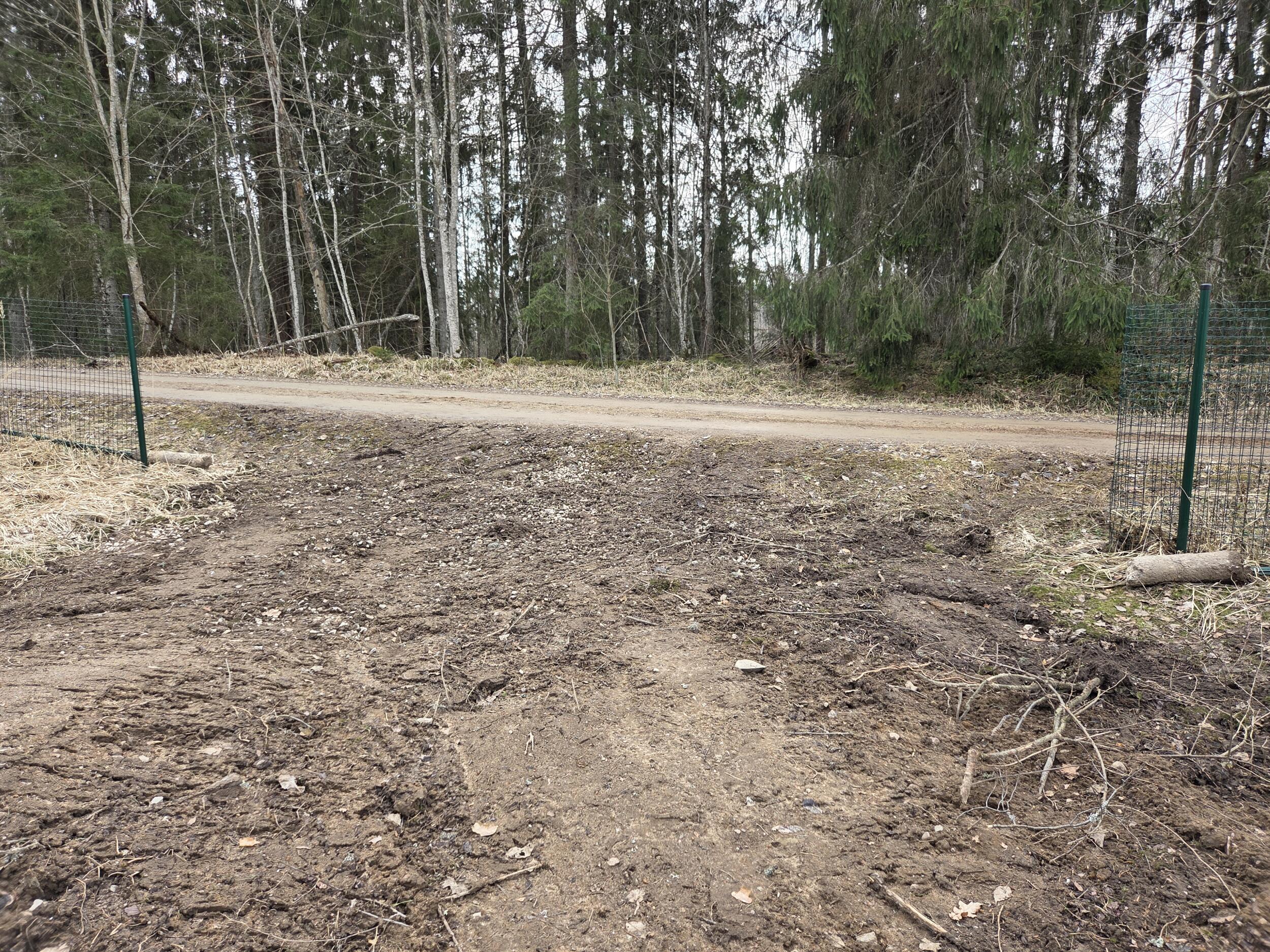 Vajalikud tööd: 1) ehitustöödeks lahti võetud võrkaia taastamine (tagasi panna kaks posti, lappida ühes kohast lahti lõigatud võrk, paiga jagu võrku on olemas); 2) kaevetööde jälgede silumine u 250 m2 alal (eemaldada pinnasesse jäänud oksad ja praht, siluda pind muru külvamiseks); 3) prahi äravedu (välja juuritud känd, kahe langetatud õunapuu ja mõne marjapõõsa puitmaterjal ja oksad. Fotol olevad kivid äraviimisele ei kuulu).