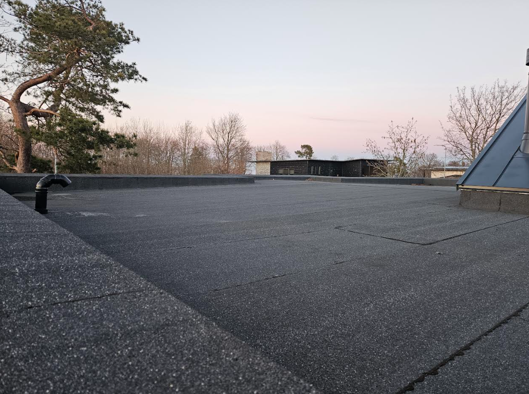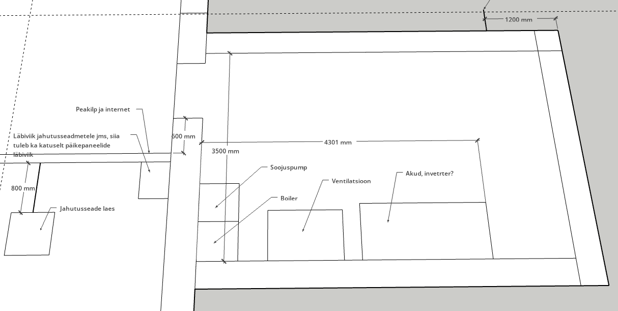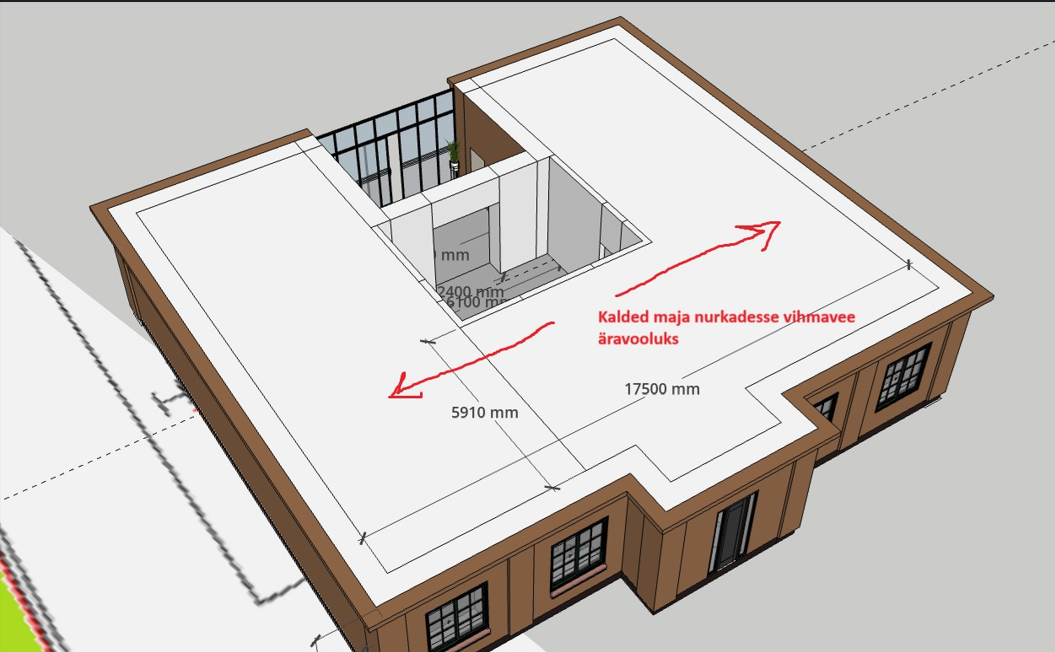 Manuses joonis tehnoruumist, katuse skeem ja pilt katuselt, kus näha ka läbiviik esiplaanil.