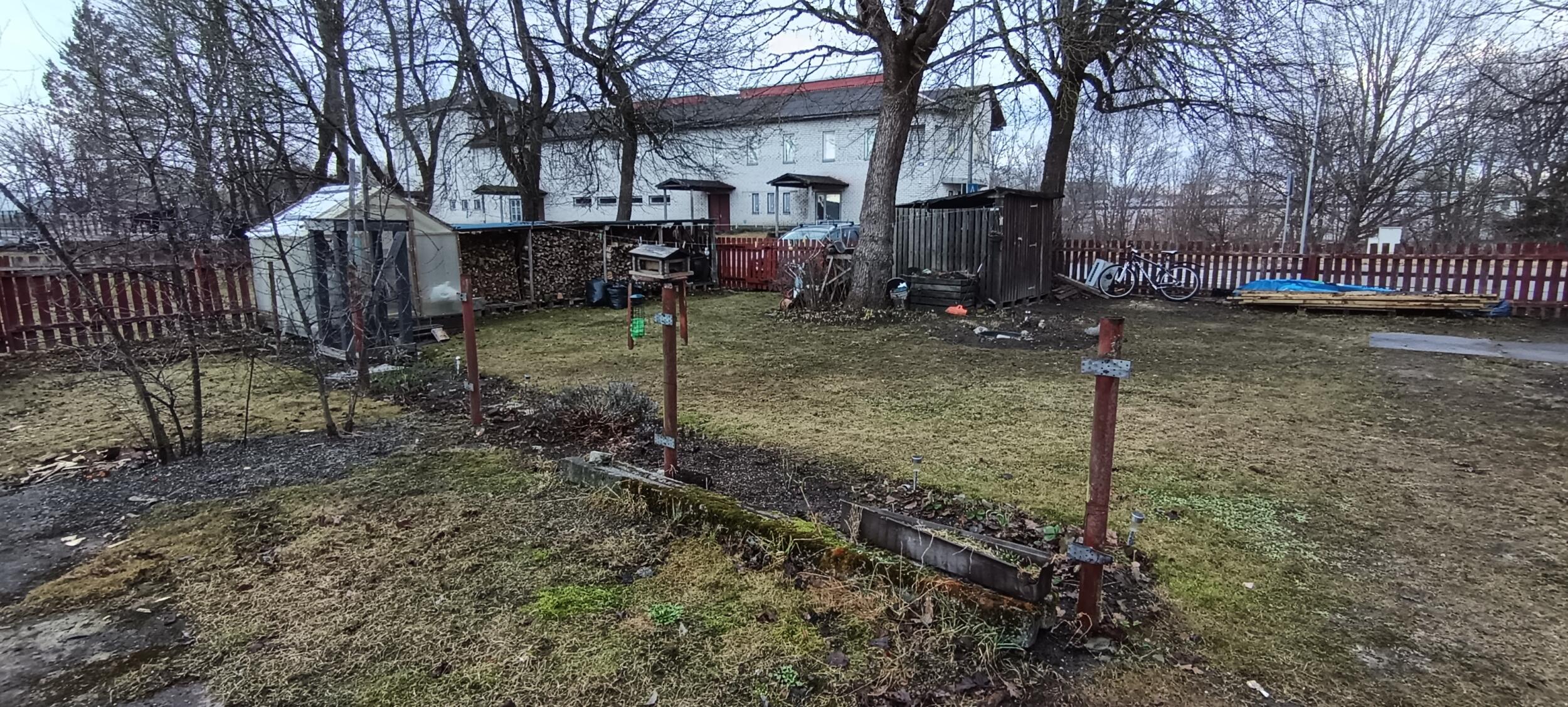 Aia pikkus 17 meetrit. Puitaed, mille kõrgus 1.10-1.20 m. Aiapostid olemas. Aed on lippidest.