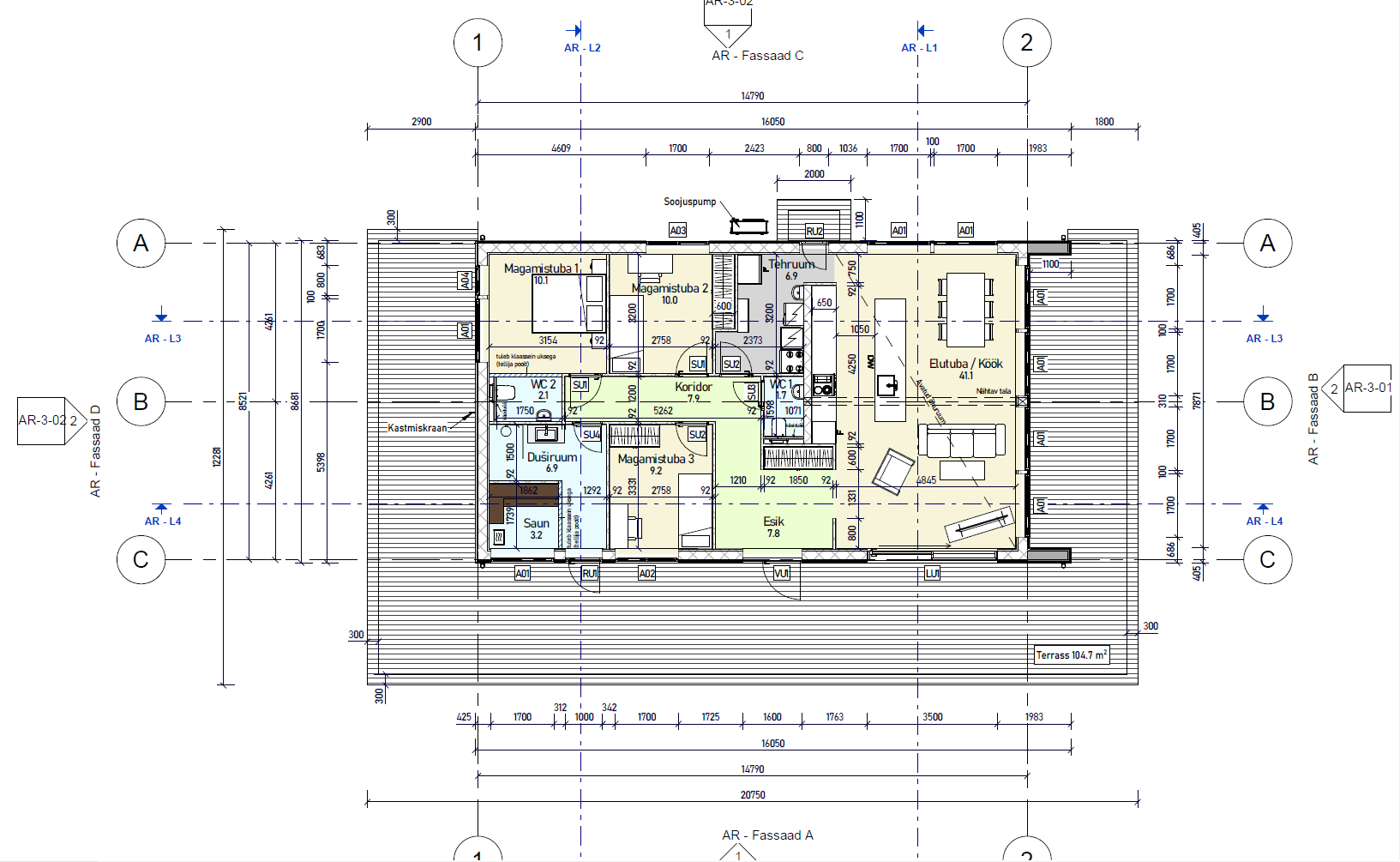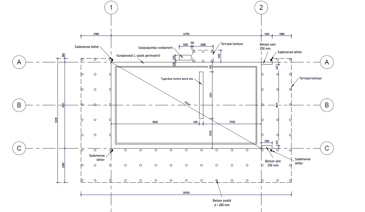 Soovitud terrassi mõõdud erinevad joonistel kujutatud mõõtudest. Hoone mõlema külje puhul võiks terrass ulatuda seintest välja 3 meetrit pluss aste ning hoone ees 5 meetrit pluss aste.