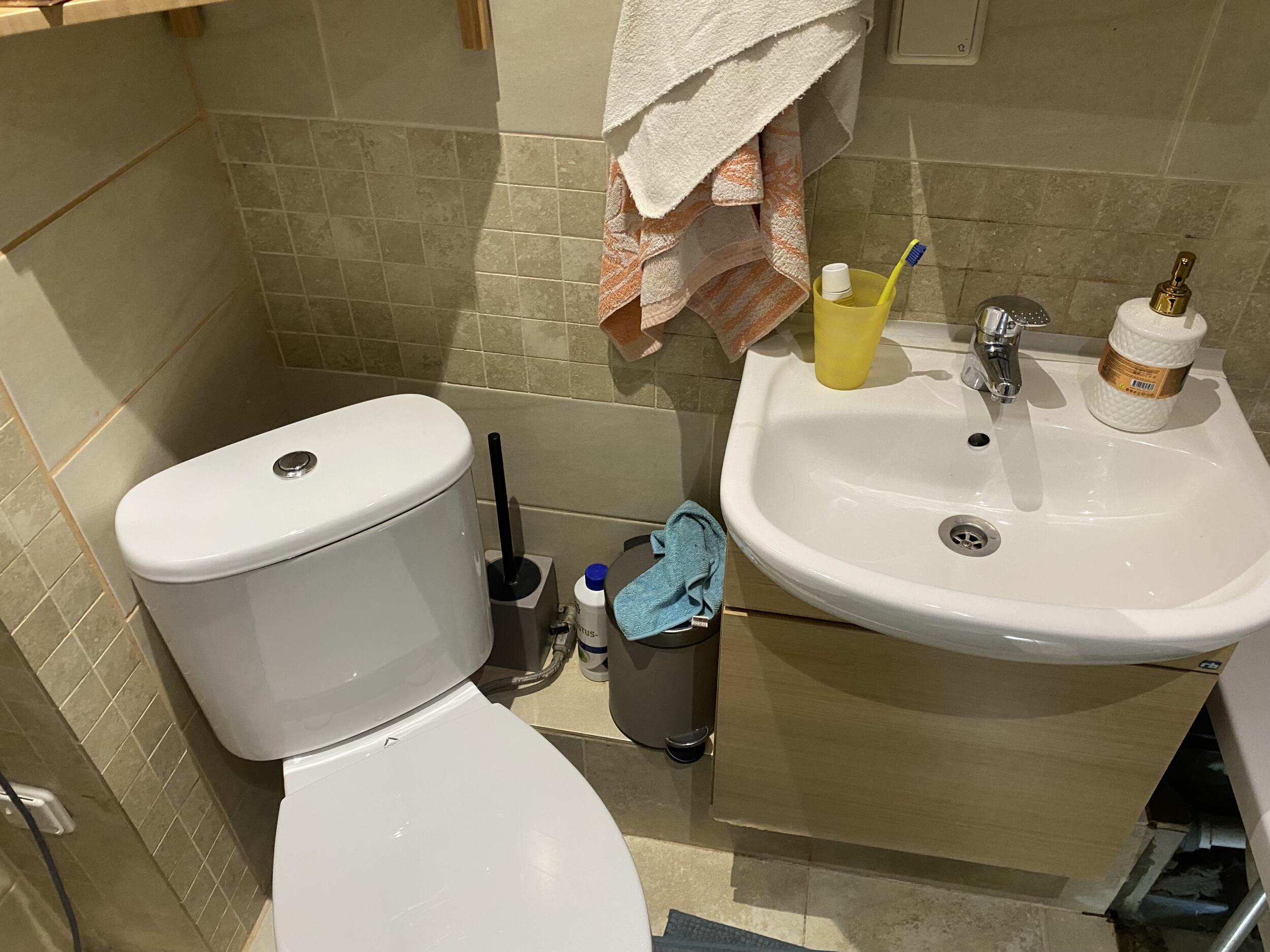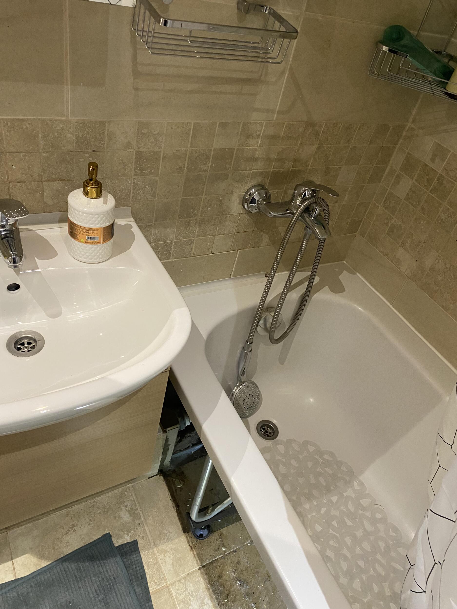 Vannitoas vann välja ja dušikabiin asemele. Vanni alt ja tagant plaatida. Kraanikauss ja kapp teise seina, uus äravool. Wc pott ja pesumasin jäävad paika. Inimene elab sees. Korter on Õismäel, 9 korruselise maja 1 korrusel.
