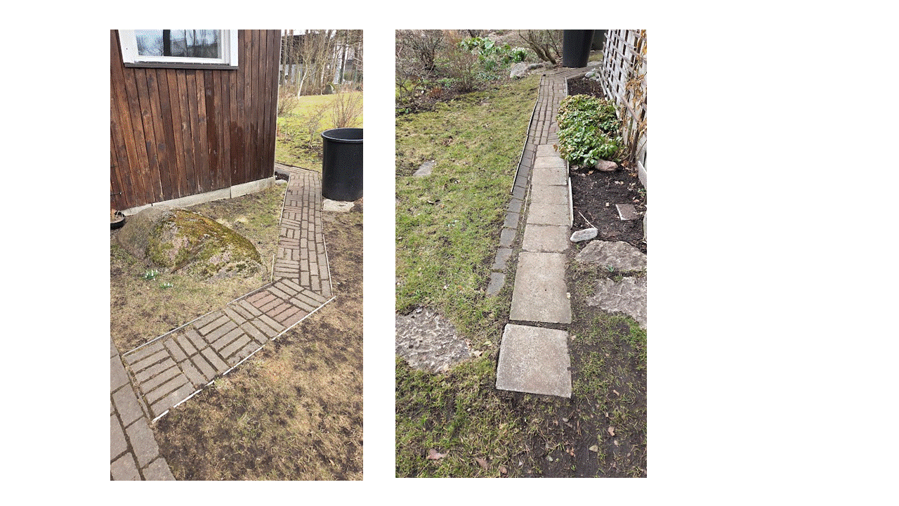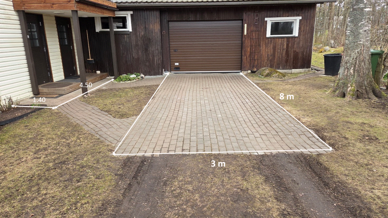 Korrastada garaažiesine plats ja ukseesine - tasandada ja puhastada platsi ja ühendusteede tasapind, katkised kivid asendada. Maja taha viiv kõnnitee - uuendada ja/või eemaldada - otsuse teeme koos tegijaga tööde käigus.