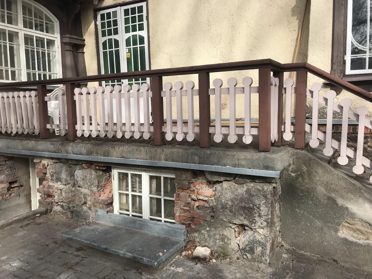 terass on plaaditud umbes suuruses 4X 3 meetrit, see asub sokli peal, mis on osalt maakividest , opsalt tellistest. Murenenud soklit tuleb ka parandada ja selle all võlvide konstruktsioon üle vaadata. Ka pehkinud aken vahetada.