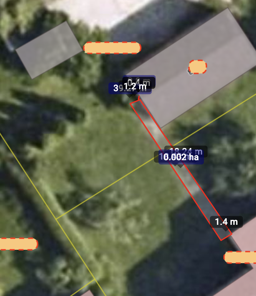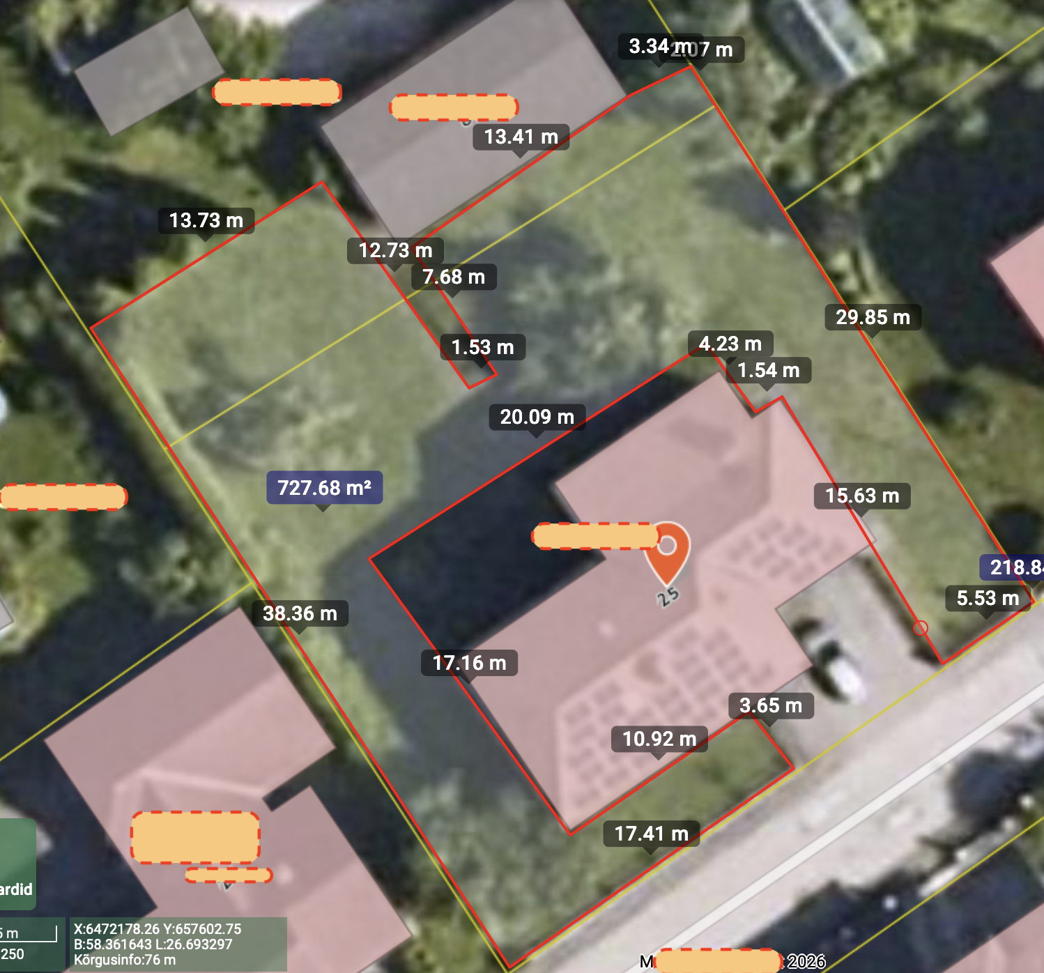 Murupind maja ümbruses ära vajunud (5a tagasi paigaldatud maakütte kontuur). Vaja vajunud kohad ühtlustada, täita, kogu murupind tasandada. Murupind ca 700m2 (joonisel).