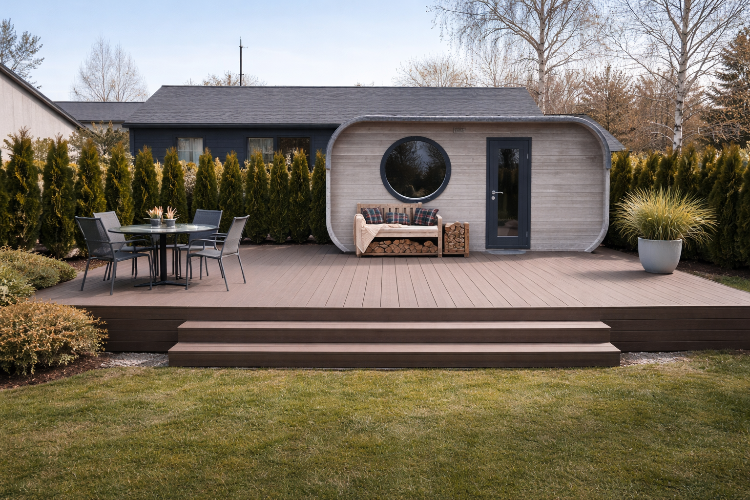 Terrassi mõõdud oleks 6,5m x 5m . Terrass peaks olema tehtud nii, et hiljem oleks võimalik sinna saun paigaldada ( näidispilt).