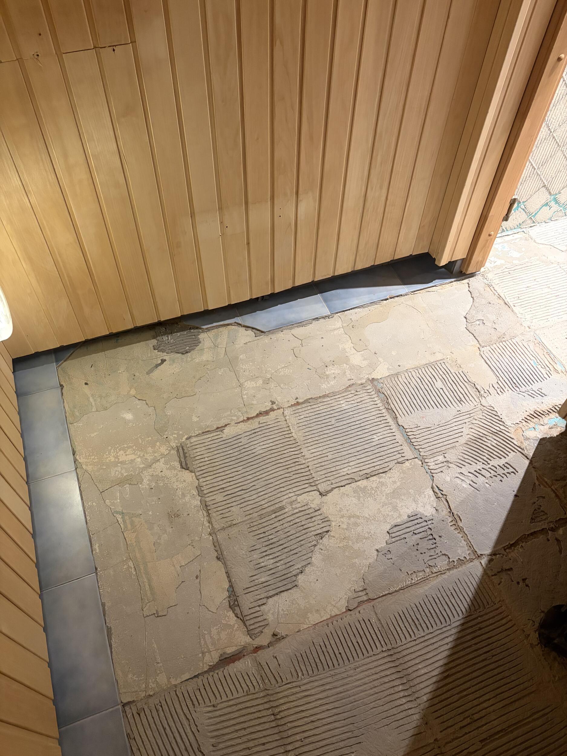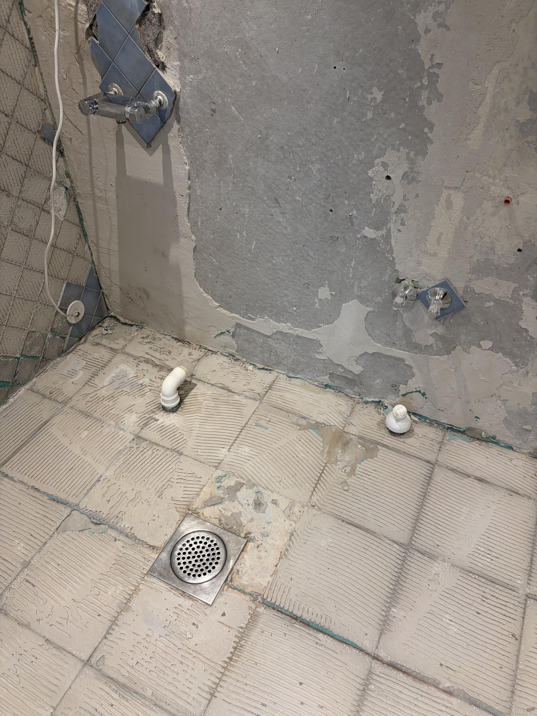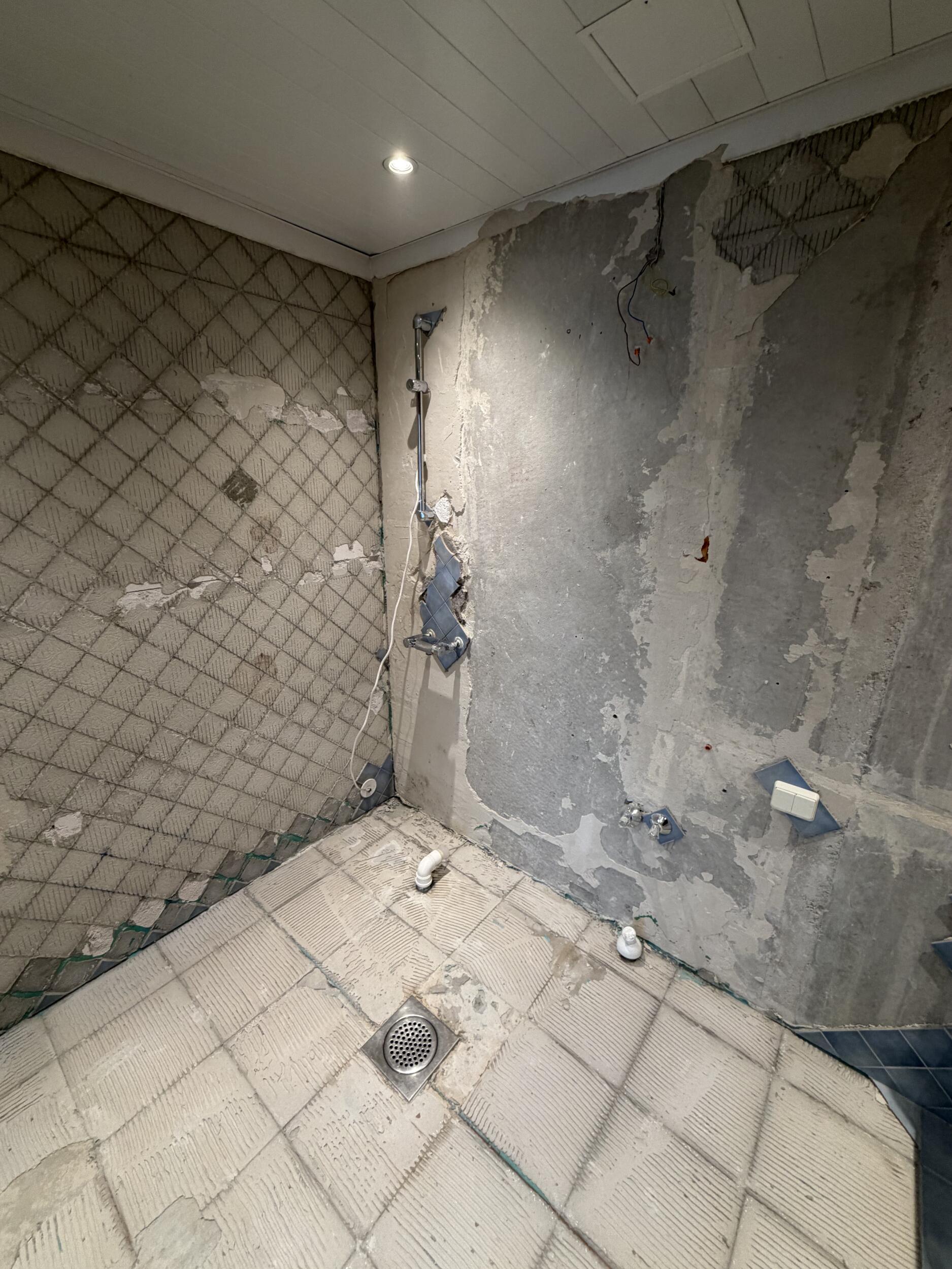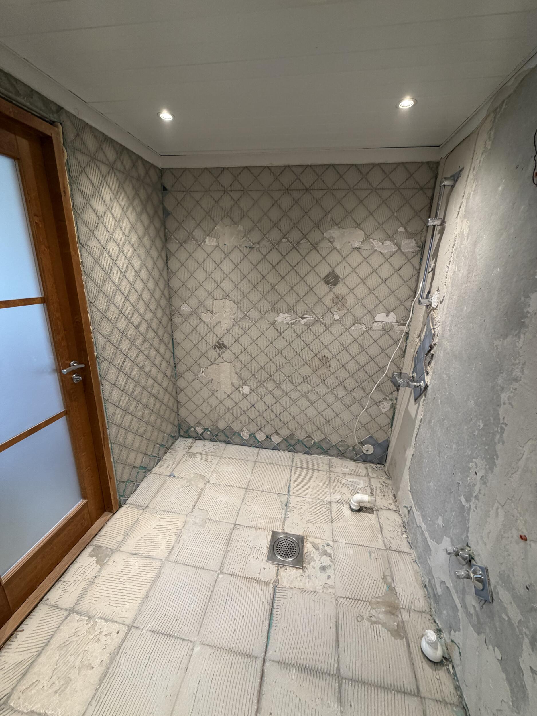1. Pindade ettevalmistus: plaatide aluse segujääkide eemaldamine, puhastamine ning kahe dušširenni paigaldus koos aluspindade ettevalmistusega.