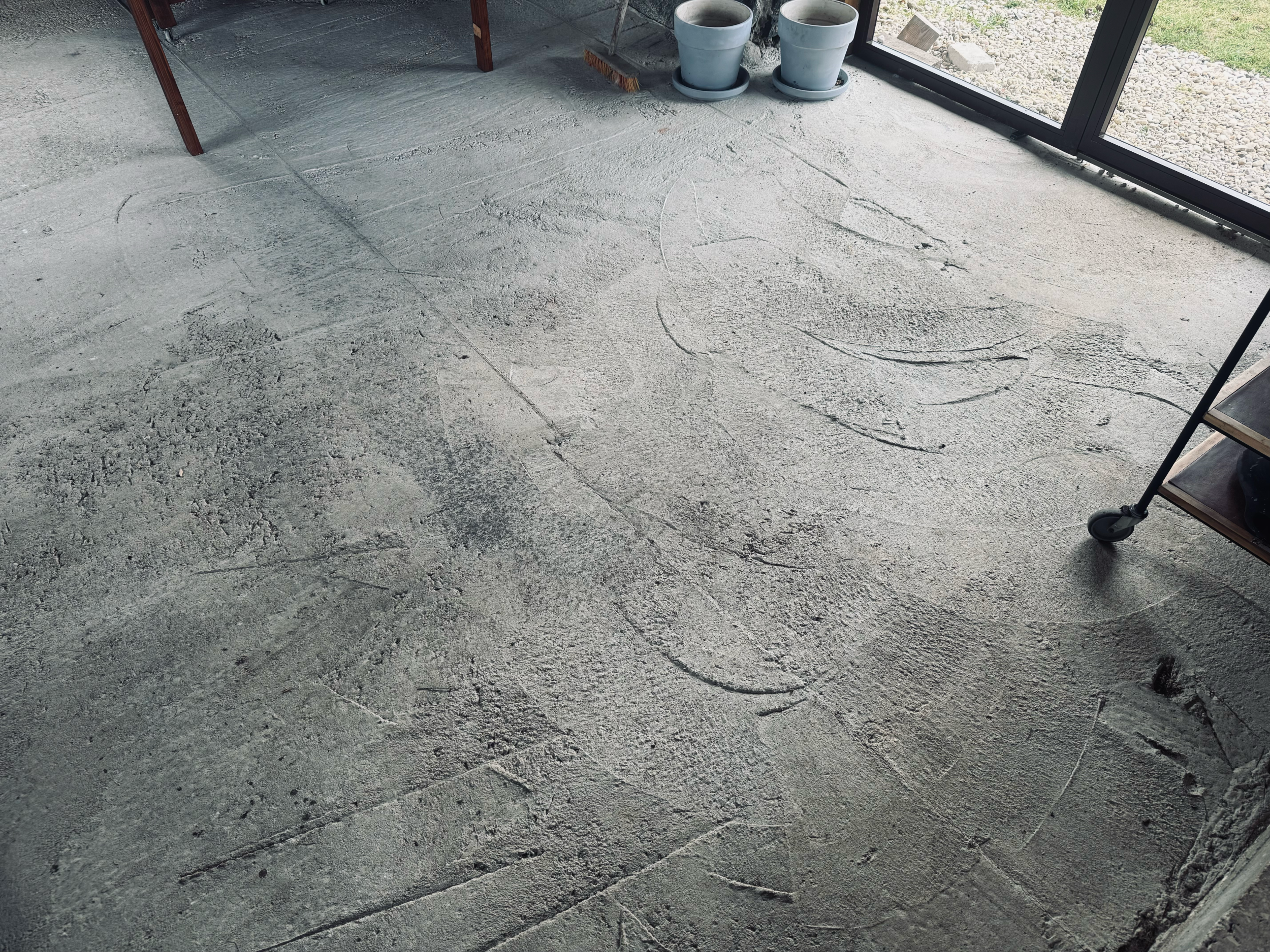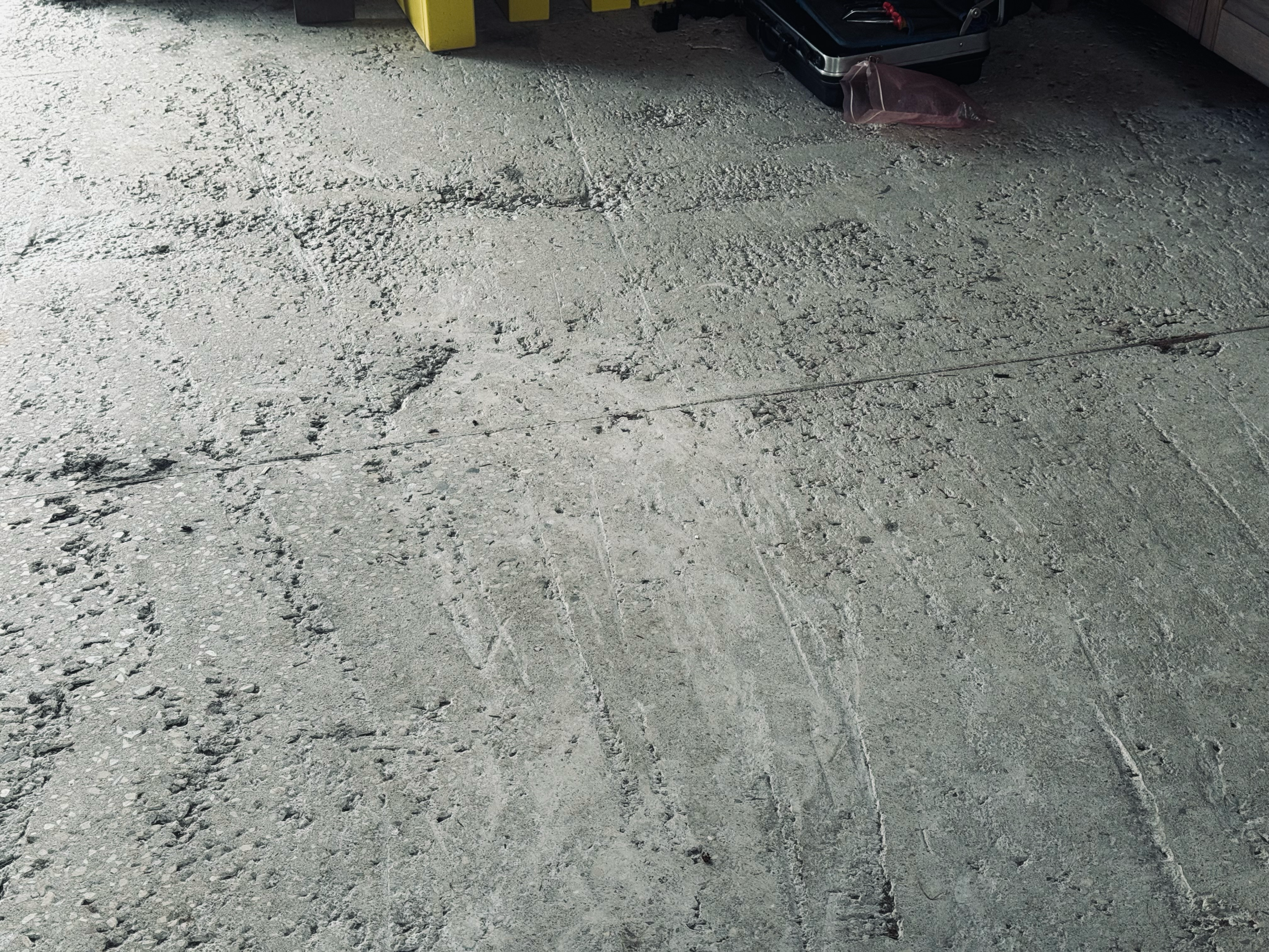 Põrand on hetkel ebaühtlane ja konarlik (vt pildid). Kohati esineb kõrguste erinevusi hinnanguliselt kuni ca +-3 cm. Soov on saada visuaalselt korrektne, ühtlasem ja vastupidav põrand, mis ei oleks märja jalaga peale astudes libe.