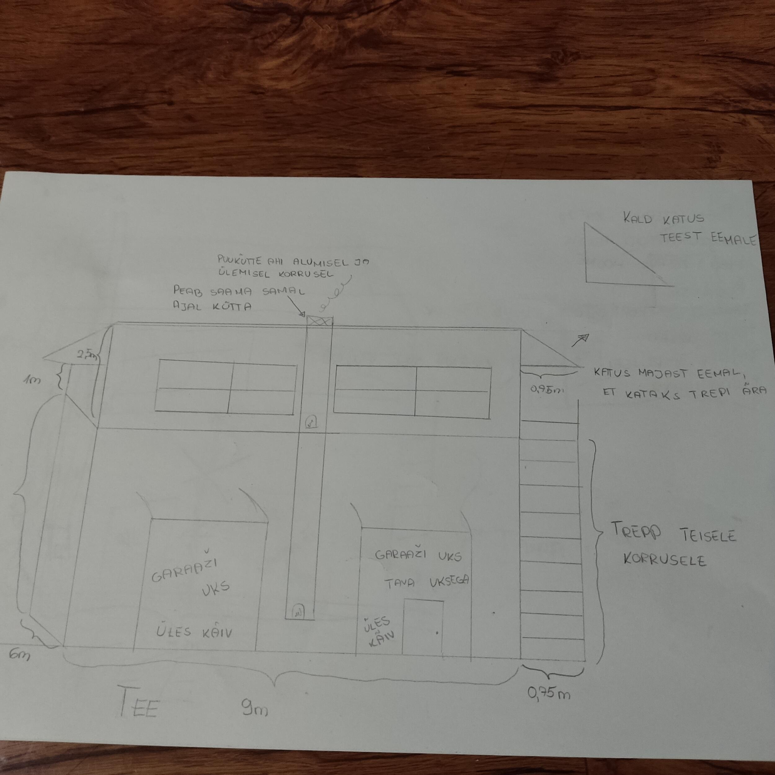 Kahekorruseline hoone, alumisel korrusel garaaž kahele autole, teisel korrusel töökoda/stuudio. Katus on kas plekk või eterniit, hoone peab olema soojustatud, lisaks puukütte ahi mõlemal korrusel (võimalus kütta mõlemat korrust korraga). Fibo/aeroc hoone. Esimesele korrusele tuleb tõstuk, seega korralik vundament ja põrand. Tõste uksed. Teisele korrusele tuleb kaks suurt akent tee/maja poole. Tööstusvool.