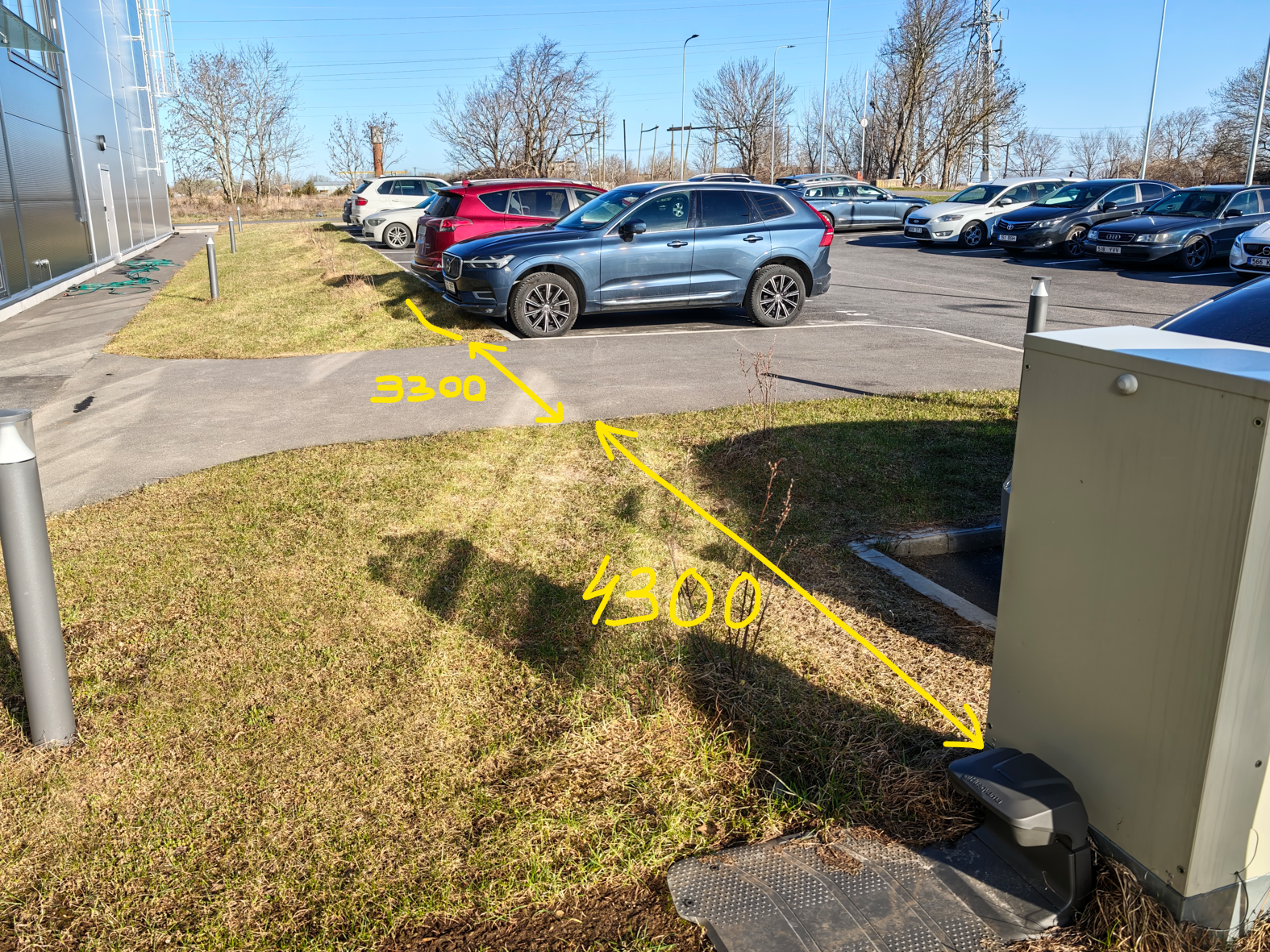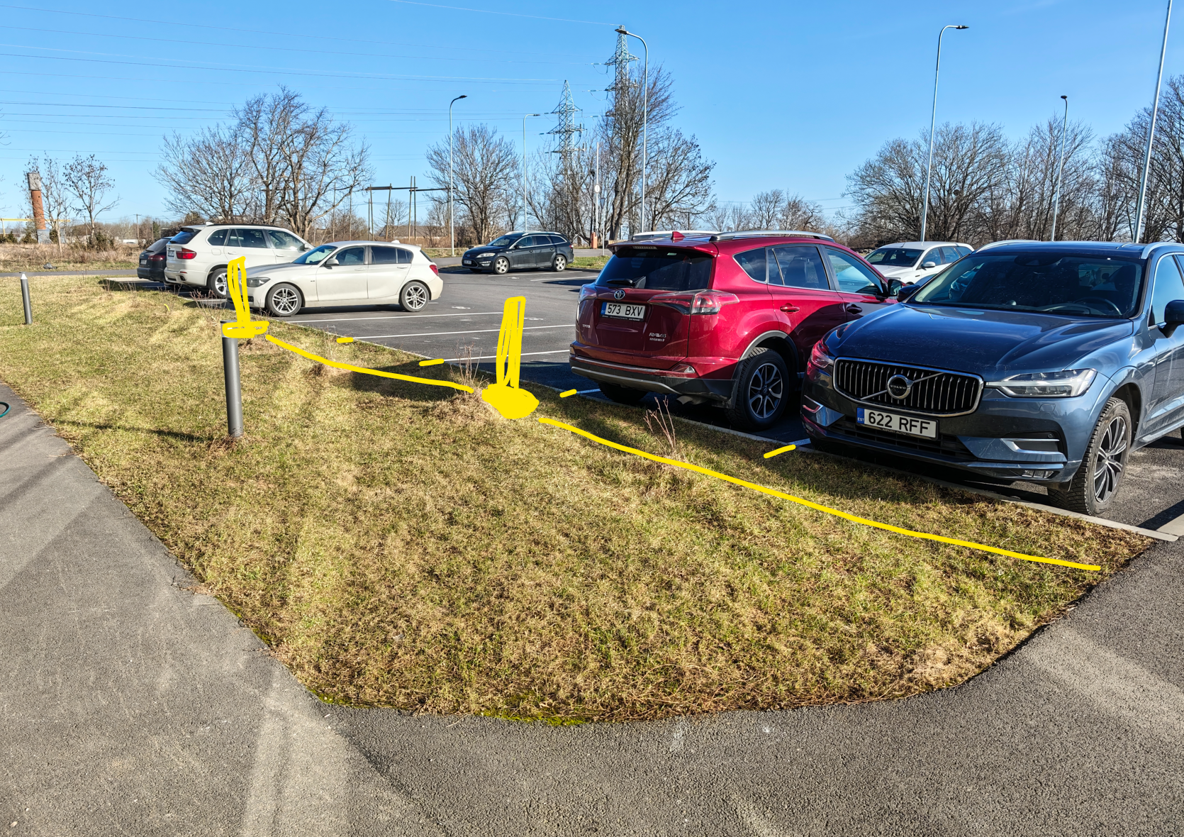 Edasi murupinna alt laadijapostide paigaldus kas valmis stabiilsele betoonalusele või kohapeal valatavale betoonalusele. NB! Postide paigaldus pildil nähtavatele kohtadele murupinnal - alates asfaldist lugedes 2.-3. ja 5.-6. parkimiskoha vahele. Palun pakkumises ka lisada oma ettepanek, et millise betooni lahenduse ja mis suuruses teha plaanite.
