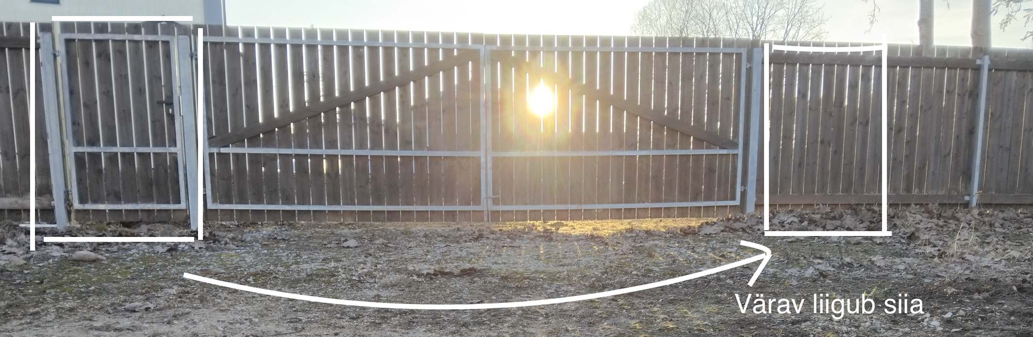 Paigutada jalgvärav teisele poole autoväravat. Vaja on ühte, võib-olla ka kahte lisaposti. Värava koha täidaks teiselt poolt samade lippidega, kui ei õnnestu ümber paigutada, olemasolevaga sarnaste lippidega.