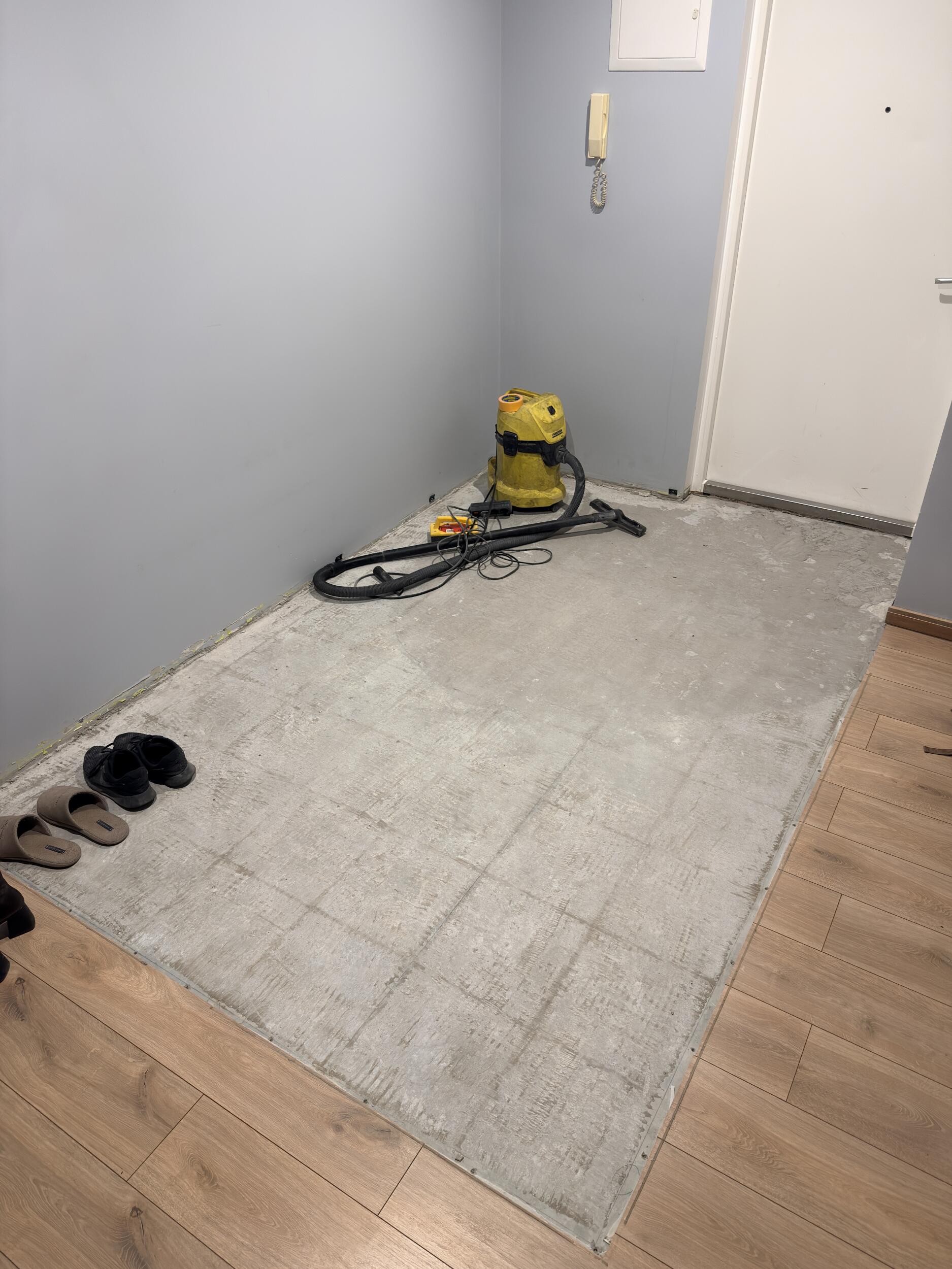 Kolm rida plaate on täislaiuses, seina äärde tuleks teha ~15cm 2tk 120cm ja 1tk 60cm ribad. Hiljem tuleb sinna peale sisseehitatud garderoob, seega eelistatult kasutatavat põrandapinda tahaks täissuuruses plaatidega. Ukseaugus vaja ühele plaadile teha L-kujuline sisselõige. Muus osas suhteliselt tavaline.
