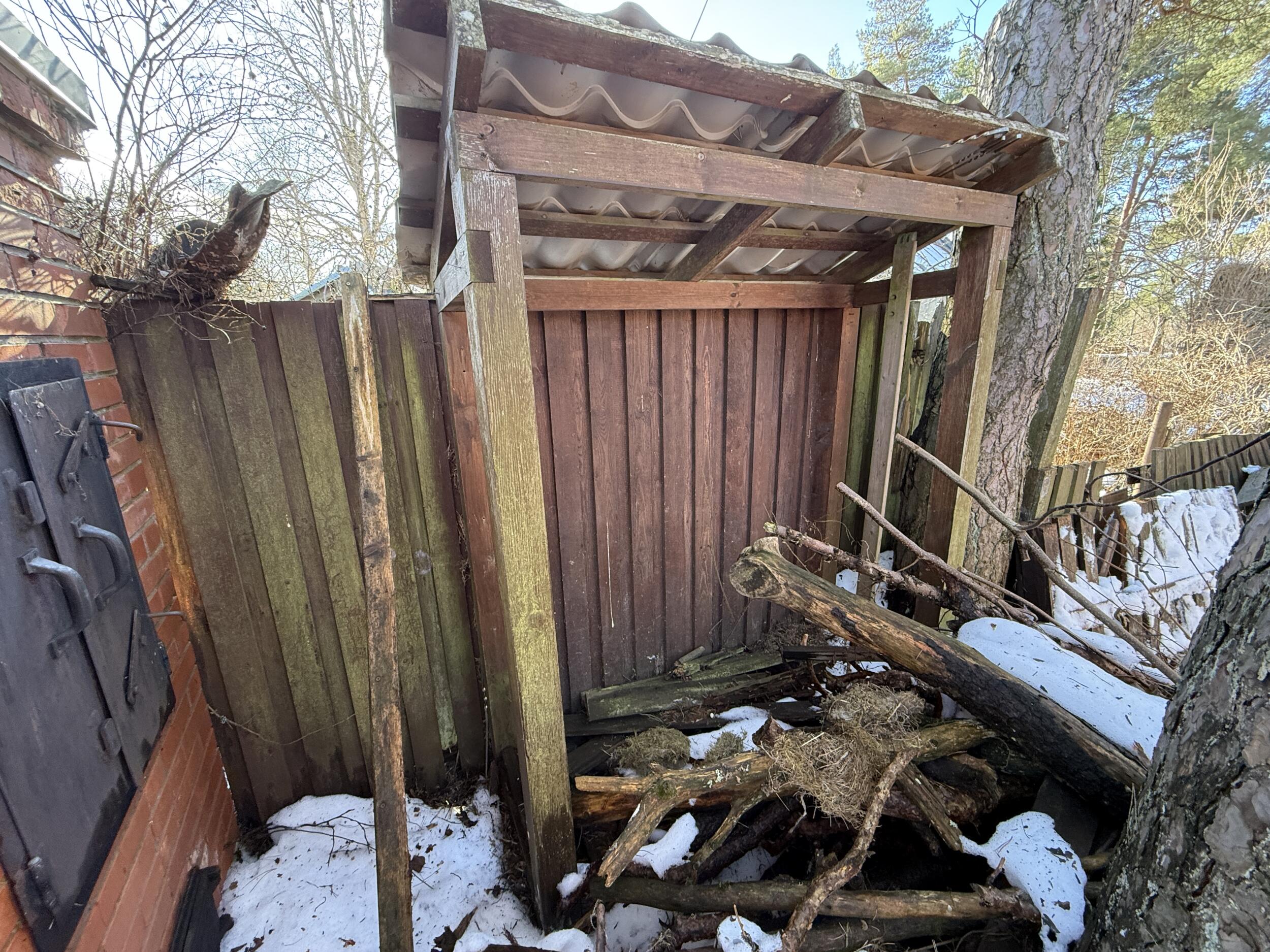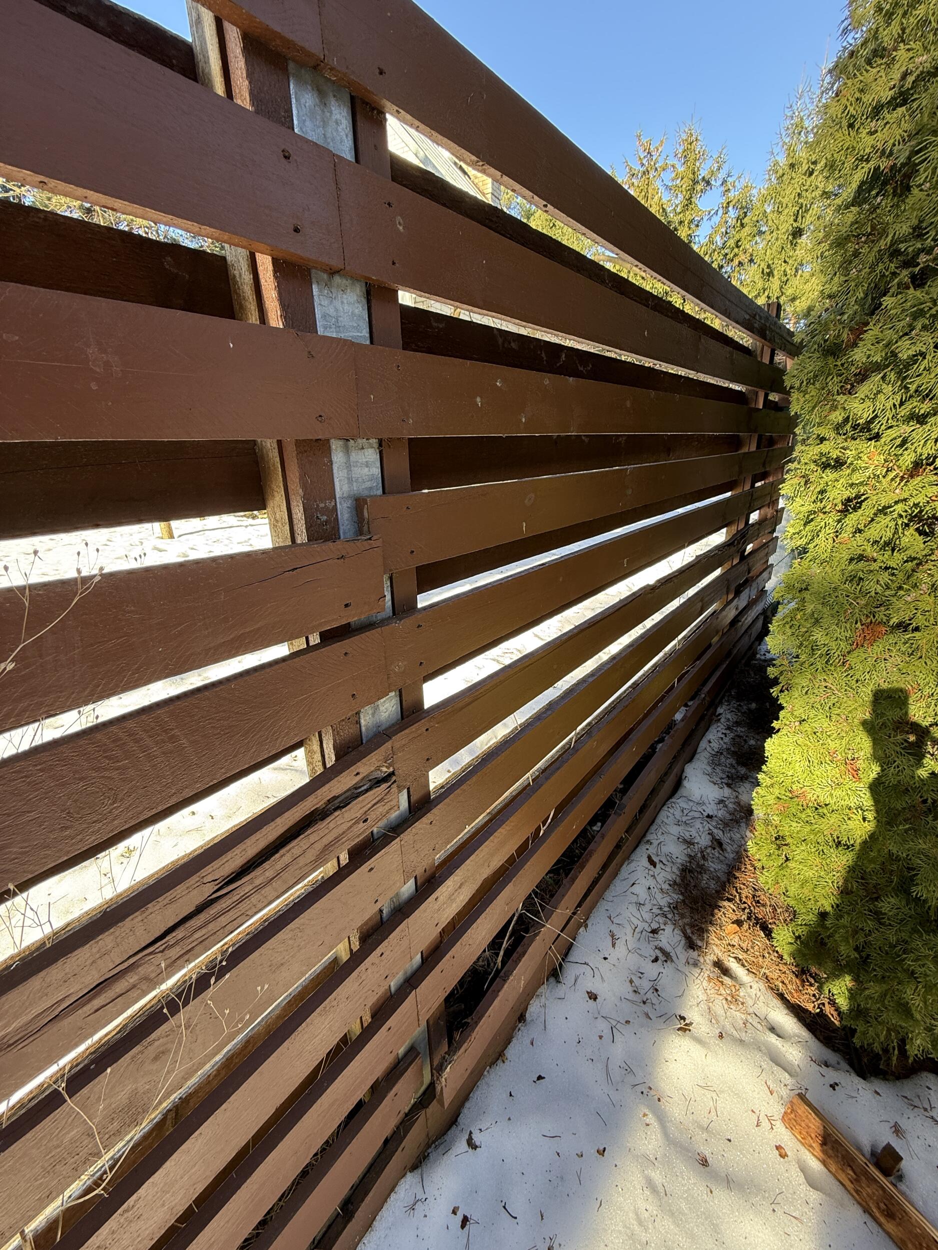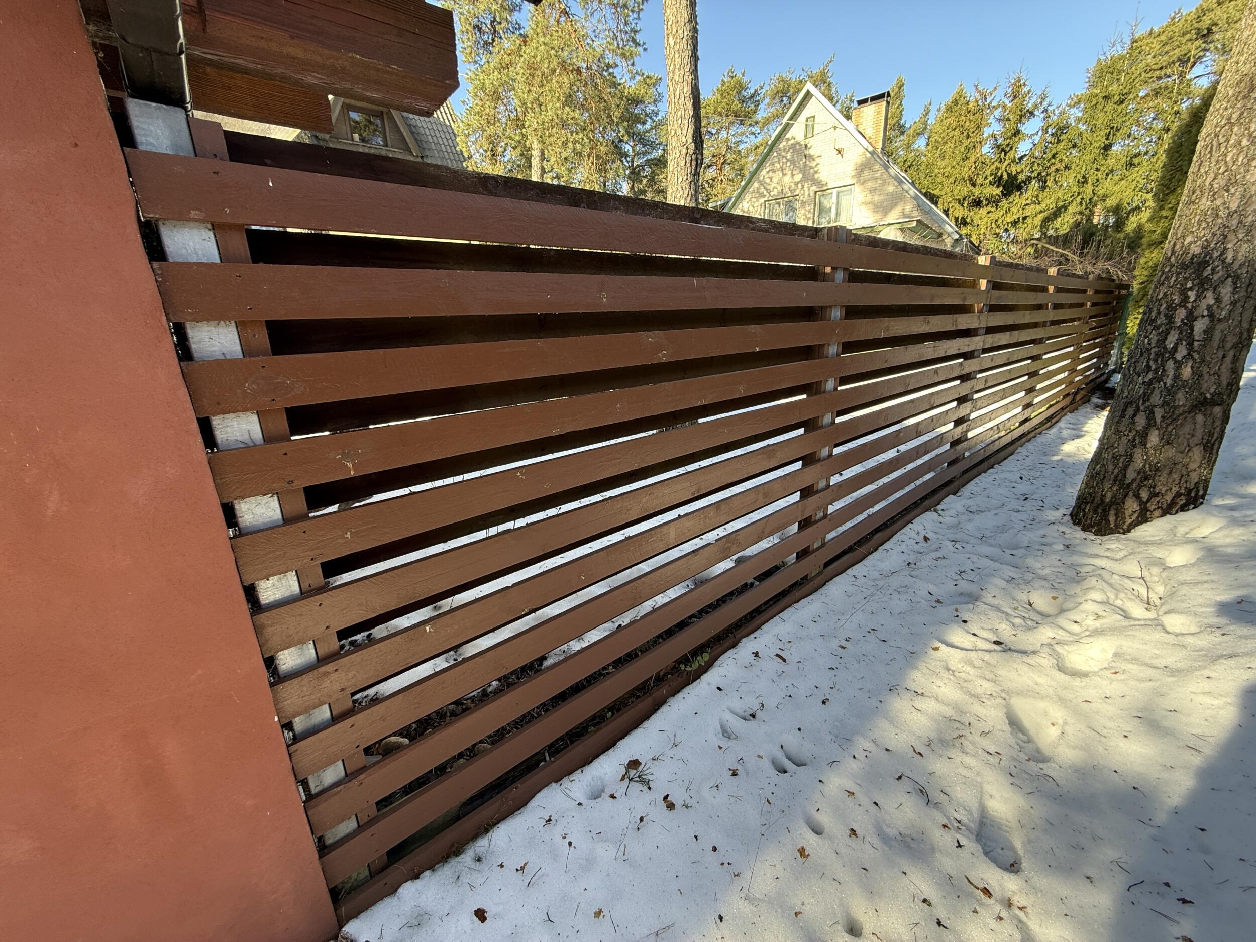 1) 13m pruuni topeltlaudisega aia puitosa vahetus ja postide värvimine. Postide vahe ligikaudu 250cm. Kõrgus 2m. Laudis: 10cm peensaagimata laud. Sõltuvalt naabri kooskõlastusest tuleks vahetada kas kogu või ainult üks pool aia puitosast.
