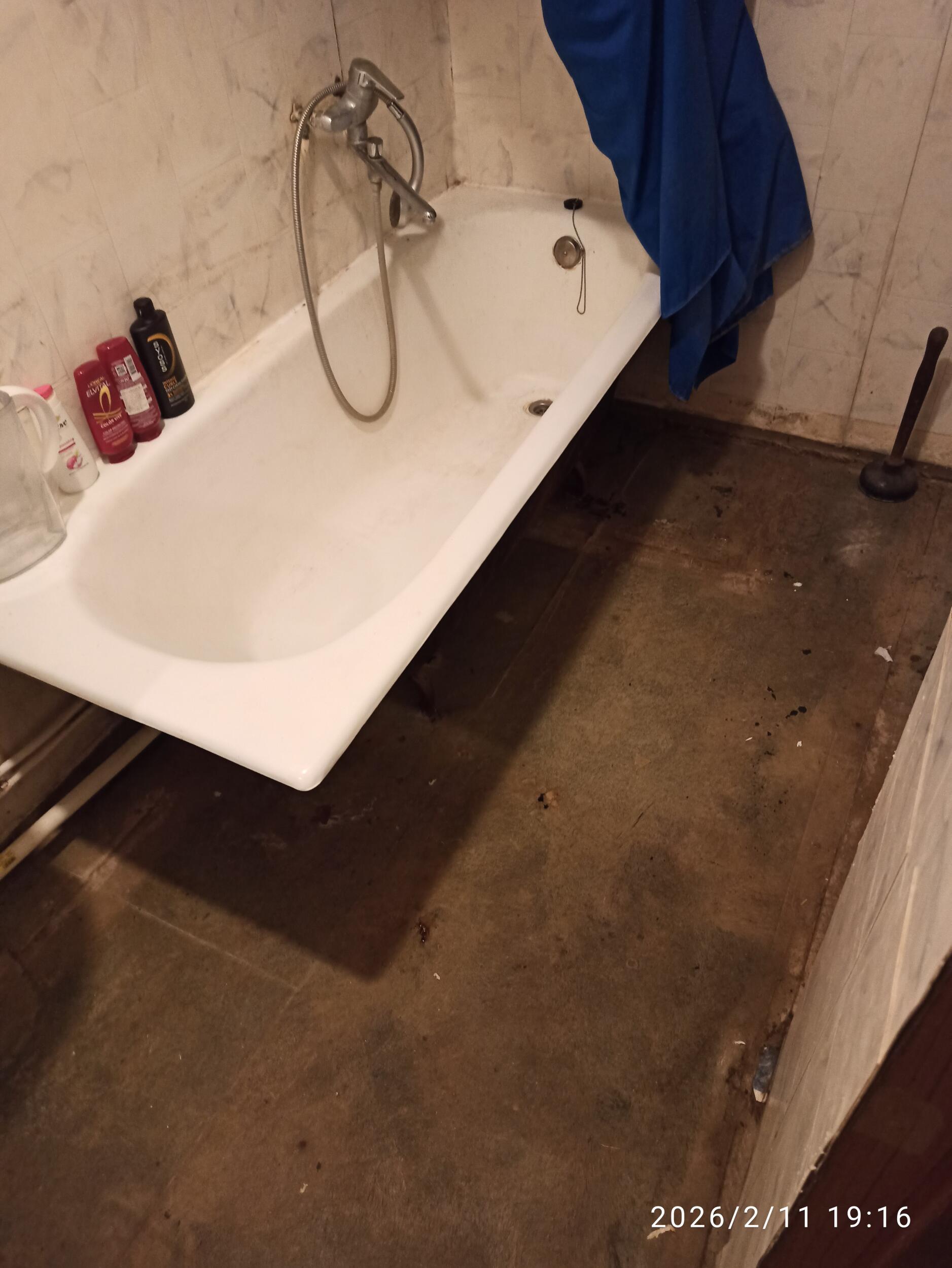 Vanni äravoolutoru lekib, põrandaplaat tuleks lahti võtta ja siis saab otsustada, kas saab toru parandada või tuleb see välja vahetada. Kuna ma pole seda kunagi lahti võtnud, ei tea, mis täpselt teha tarvis on. Vannituba on plaatimata, lihtne puitlaastplaat on põrandal.