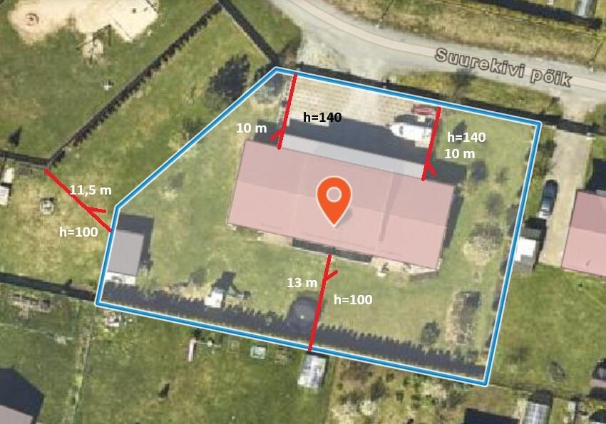 Soovime ehitada paarismaja hoovialade eraldamiseks piirdeaiad. Lisatud pildil näidatud punasega ligikaudsed mõõdud ja väravate paiknemised.