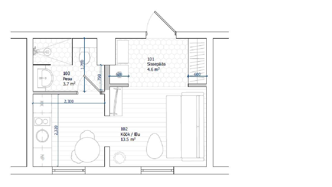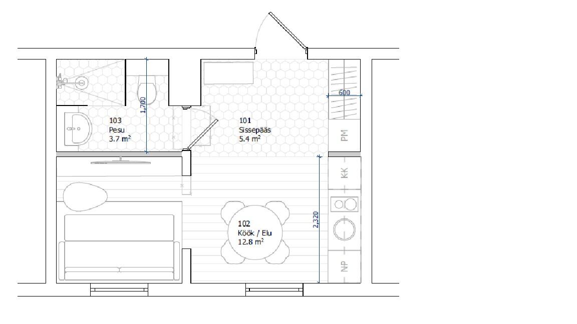 Põhja-Tallinnas esimesel korrusel paikevas mikrokorteris uus korteri planeering käsil. Selle kohta on olemas kaks võimalikku varianti: 1. Ahju asemele tuleb ukseava ja olemasolev vahesein tuleb uuesti ehitada; 2. Ahju ja vaheseina asemele tuleb uus sein ning ukseava tuleb uude kohta koos kergseinaga.