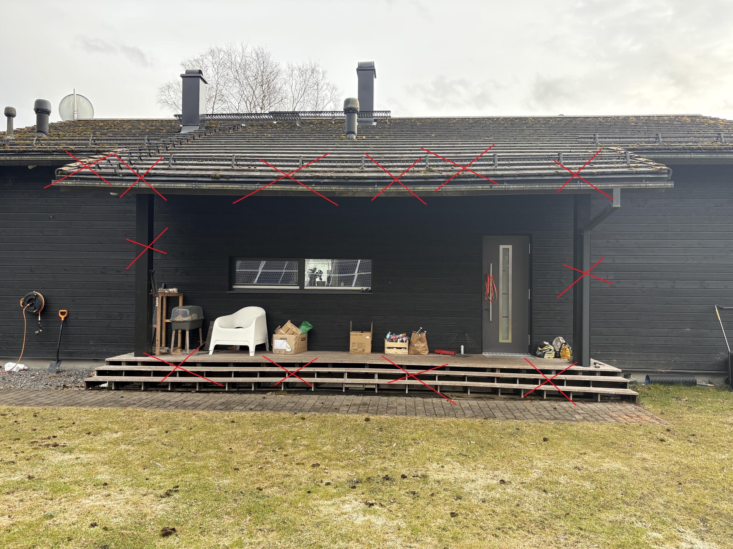 Olemasolevate varikatuste ja terasside demontaaž, katuse korrastus - korrastada kogu räästa sõlm, sh räästakasti lahendus ning viimase katusekivi korrektne lõpetus. Lumetõkke tõstmine katusele. Vihmavee süsteemi korrastamine ja asendamine.