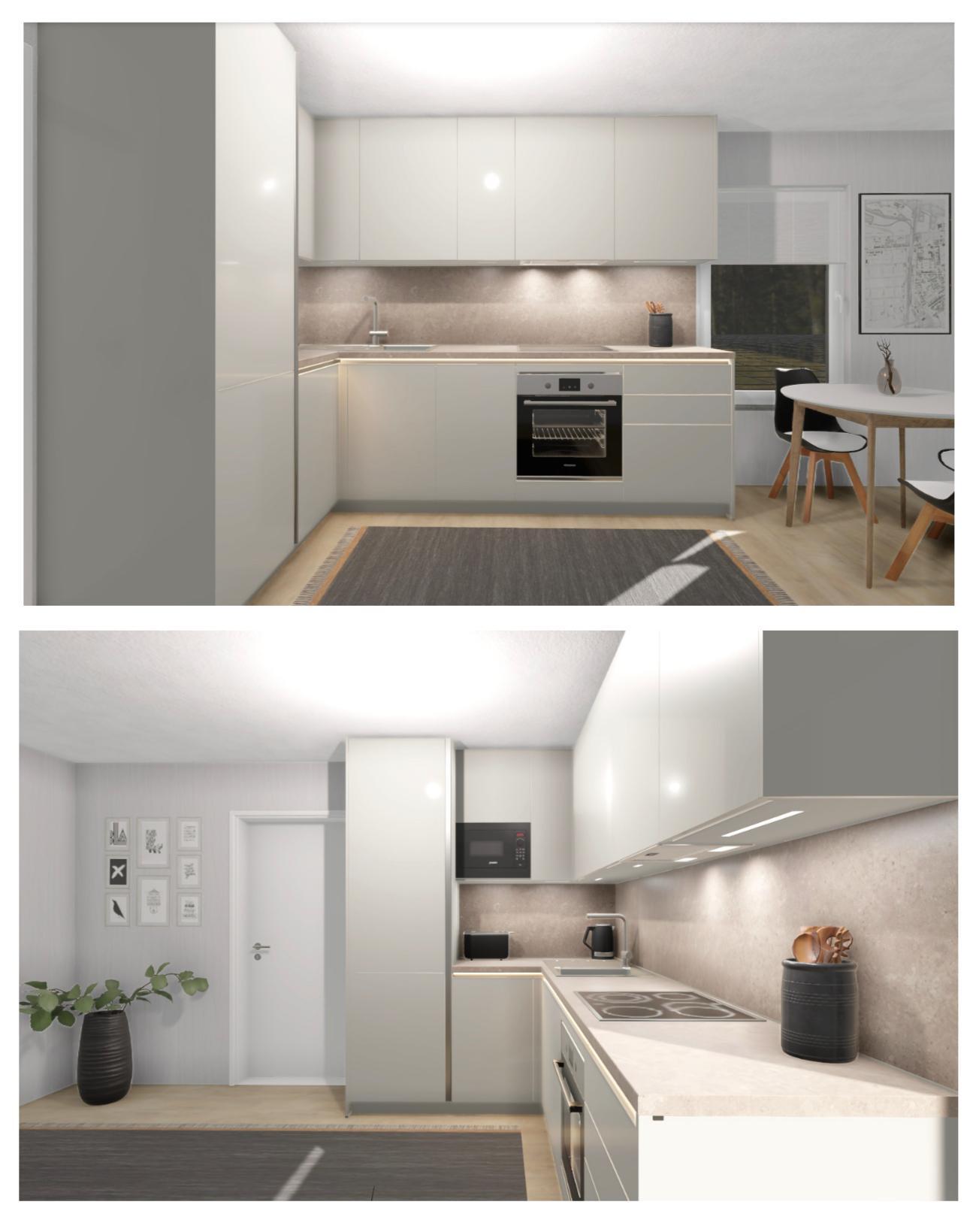 Kööginurga pikkus 2850mm x laius 1830mm ja kõrgus 2350mm. Integreeritaud ahi, mikrolaine ja kubu. Töötasapind tume puit/mdf. Kappide värv tumesinine.