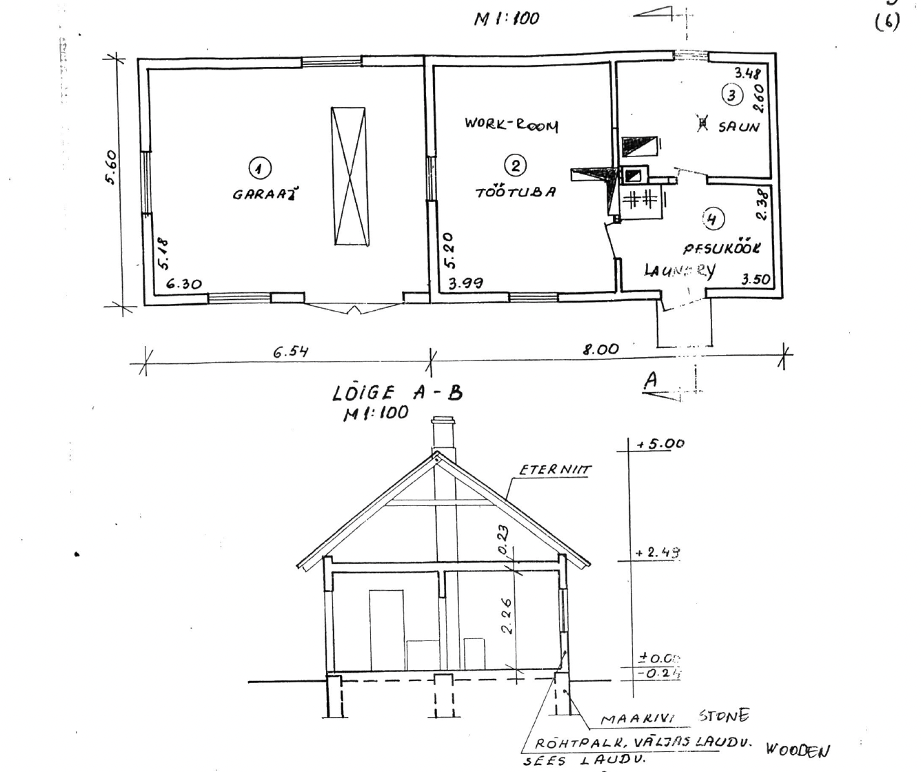 garaažist (32,6 m², tuhaplokkidest 1990ndatest), saunast (6,6 m²),