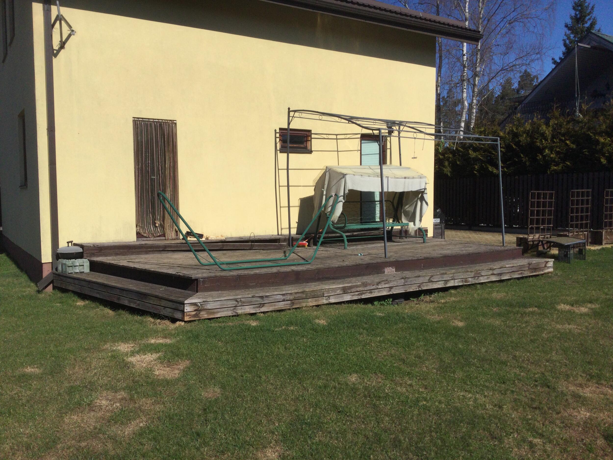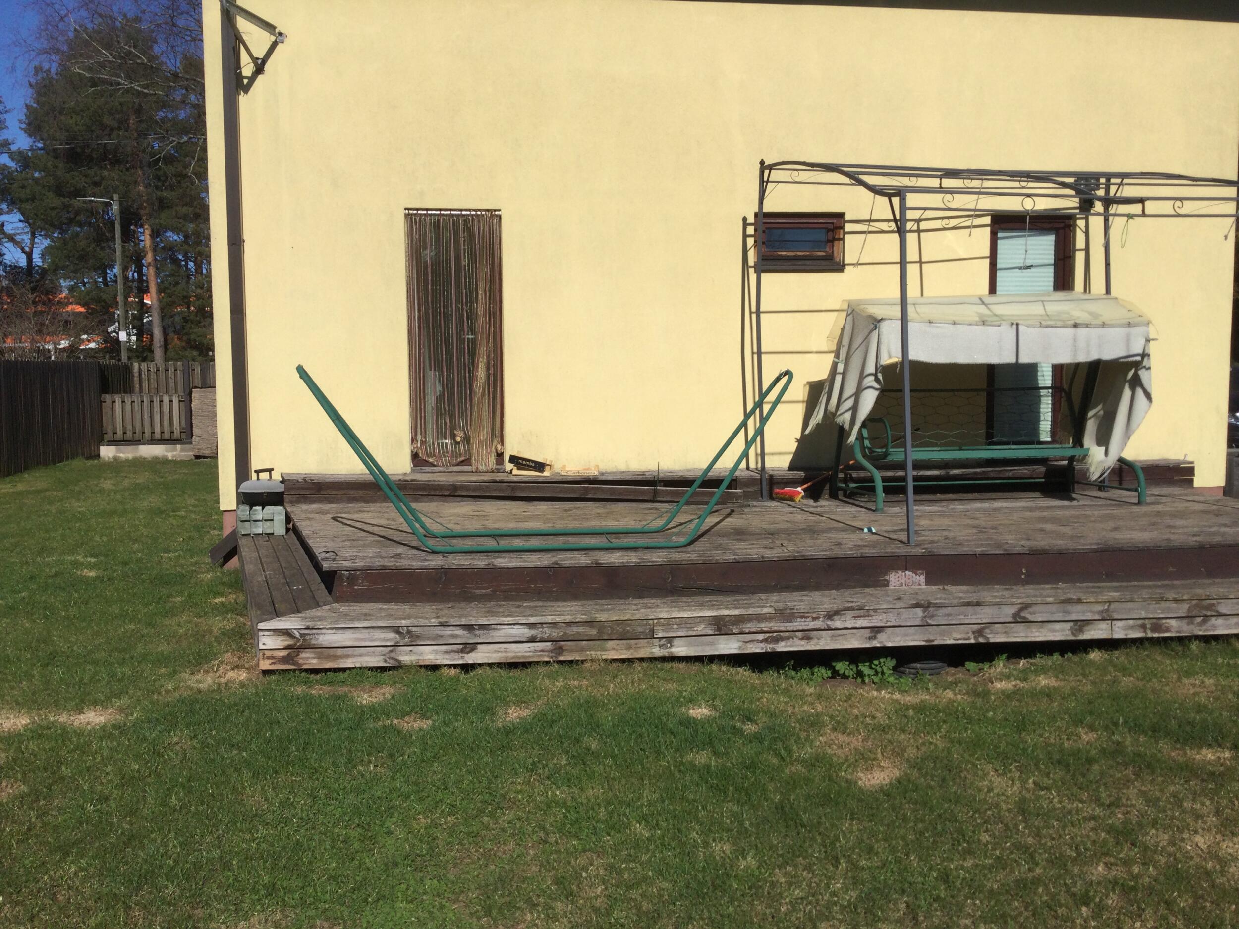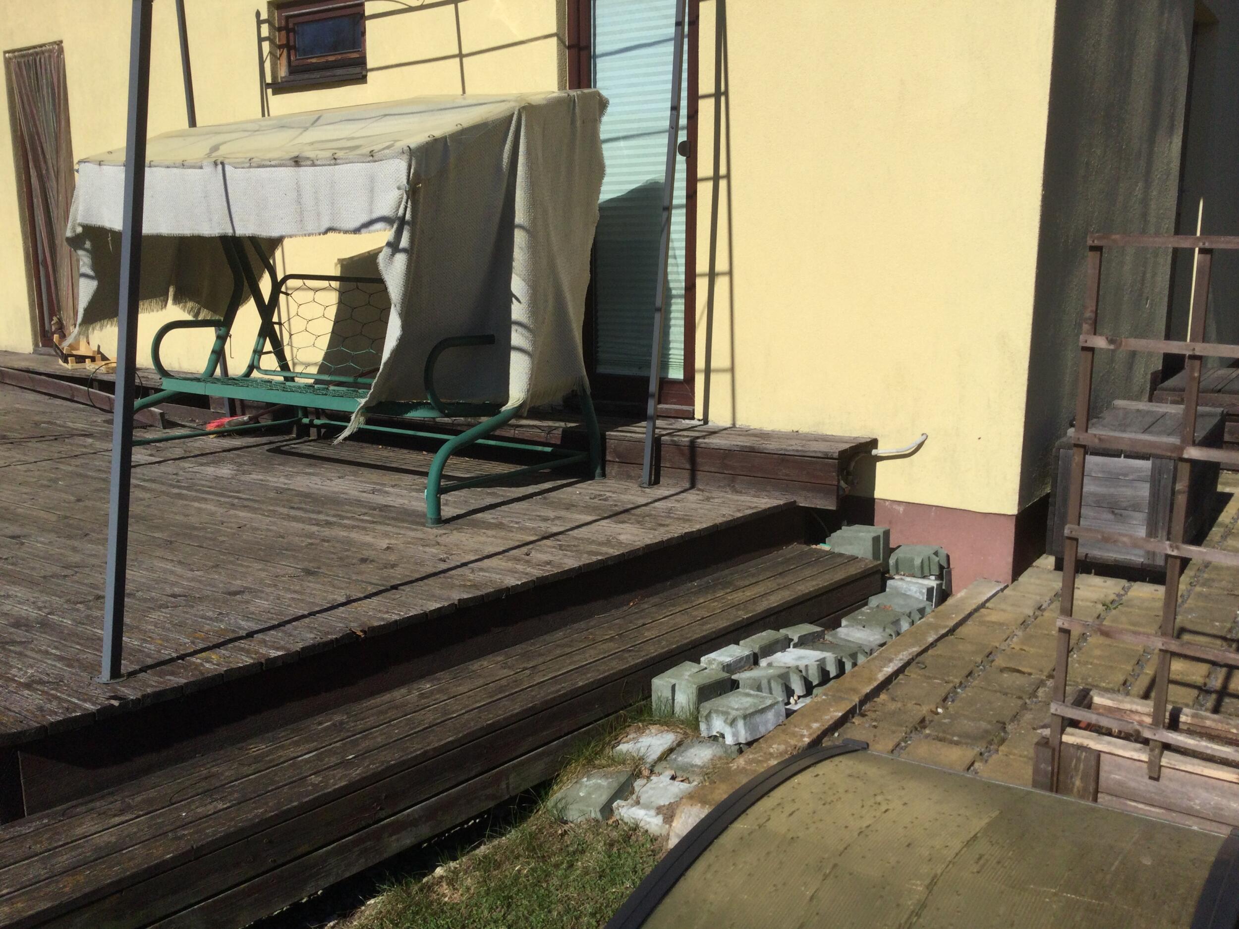 Terrass on betoonvaiadel, mida ei ole vaja vahetada. Terrassi ligikaudsed mõõdud 7,7x3,7 m, 2+1 astet, ühe astme kõrgus ca 22 cm. Materjaliks eelistatud immutatud mänd.