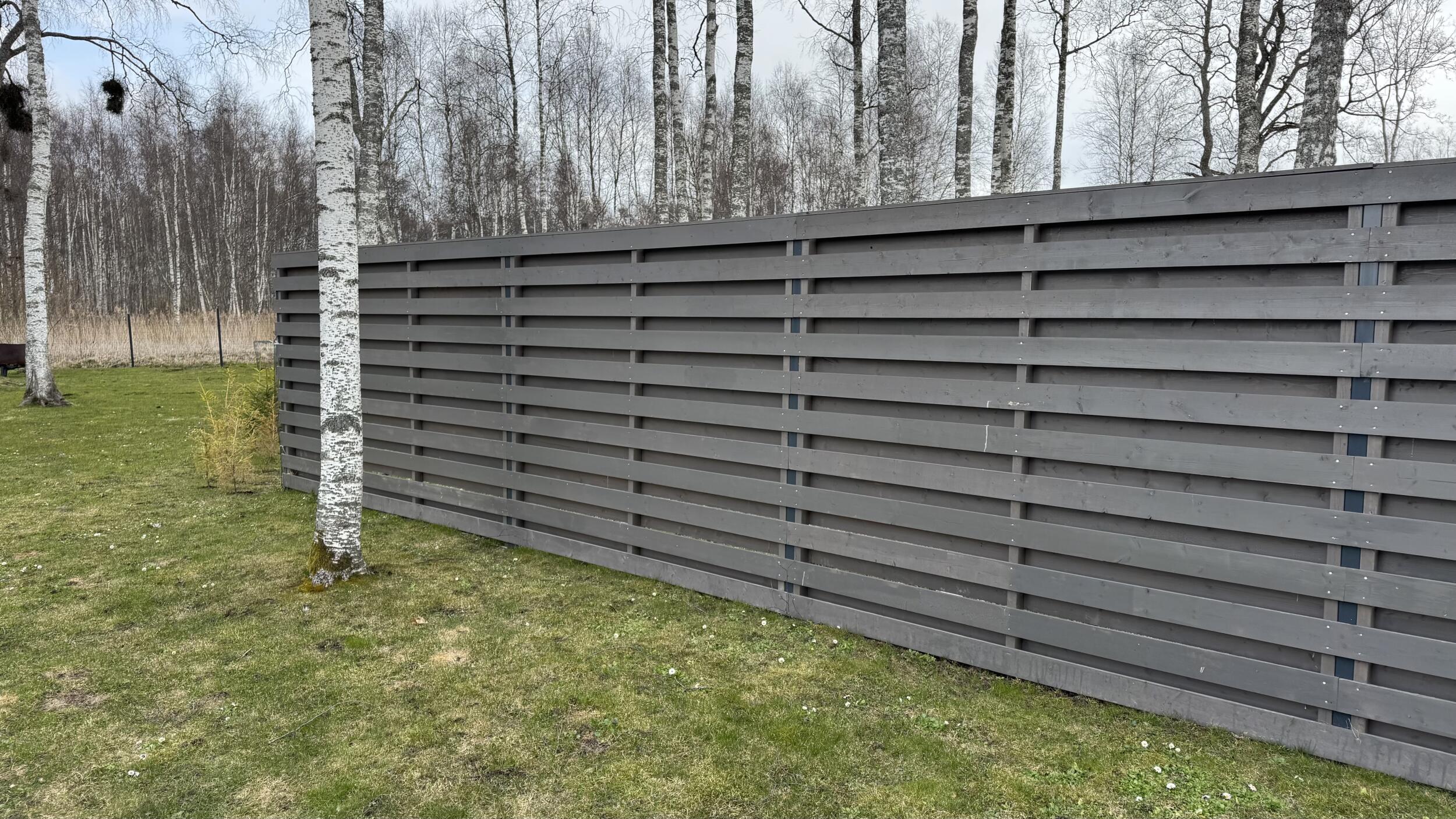 Stiil: horisontaallauad paigutatud mõlemale poole posti vaheldumisi — "põimitud" efekt, minimaalsed pilud laudade vahel (vt lisatud pilt)