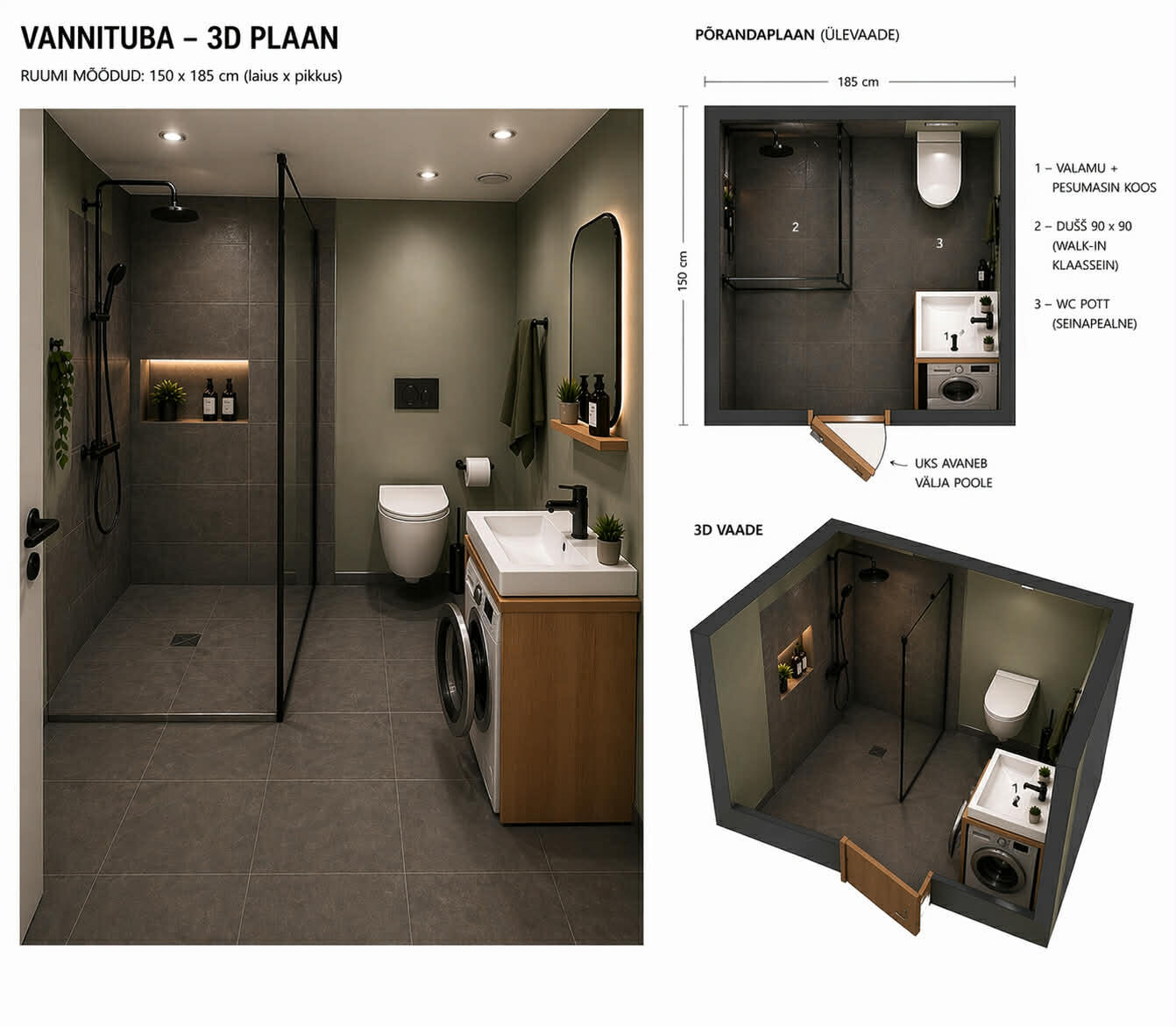 * Kogu ruum: 185 × 150 cm