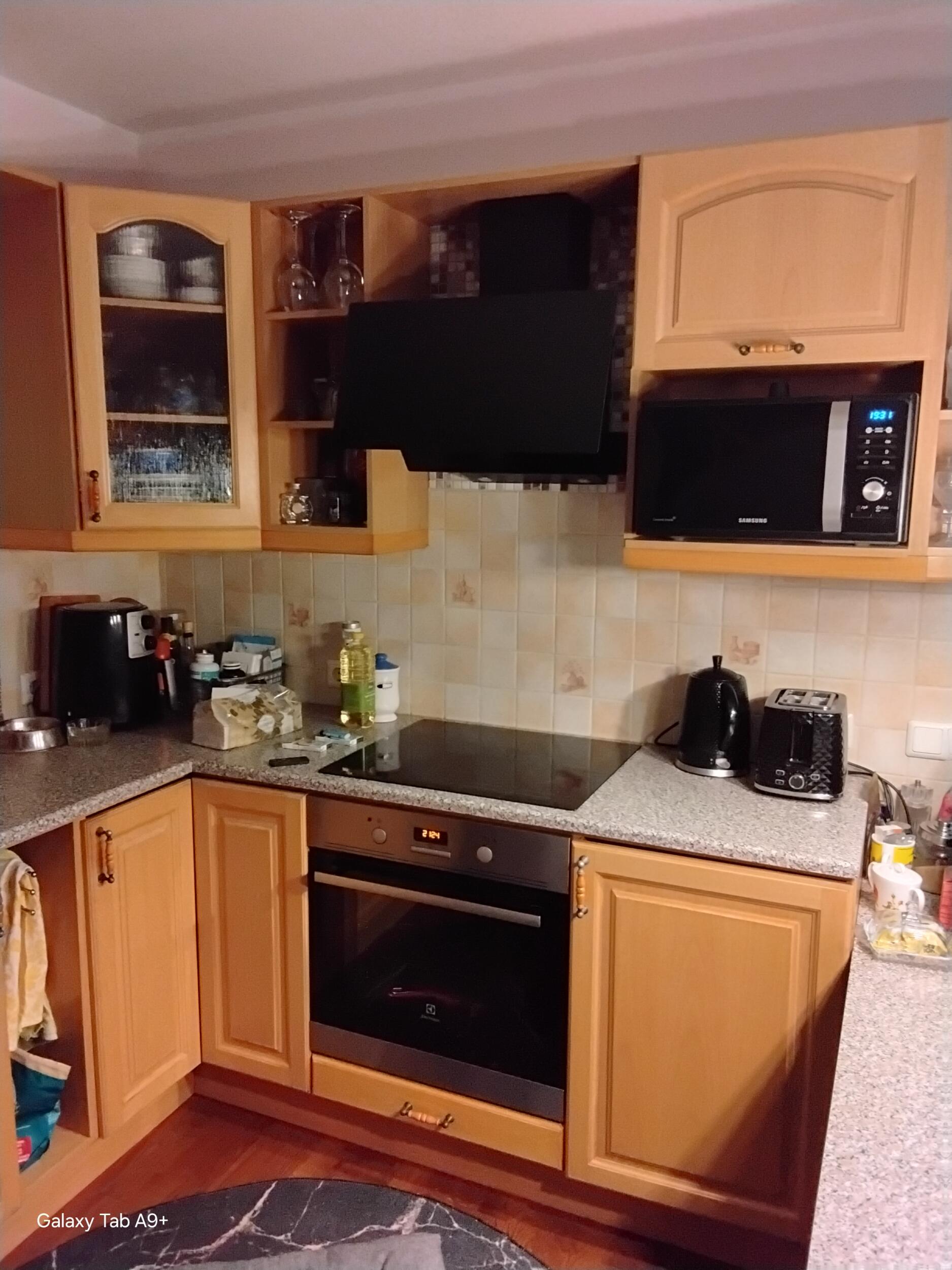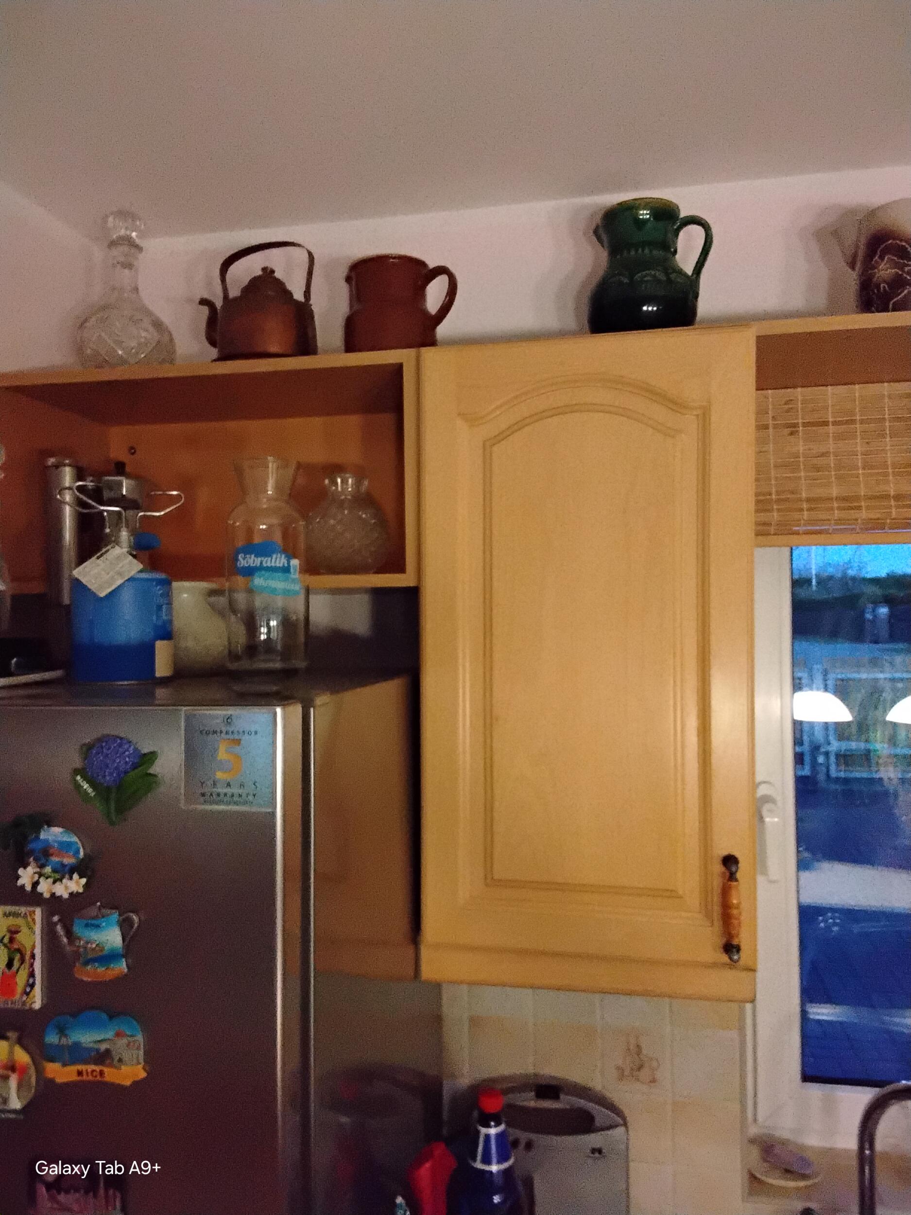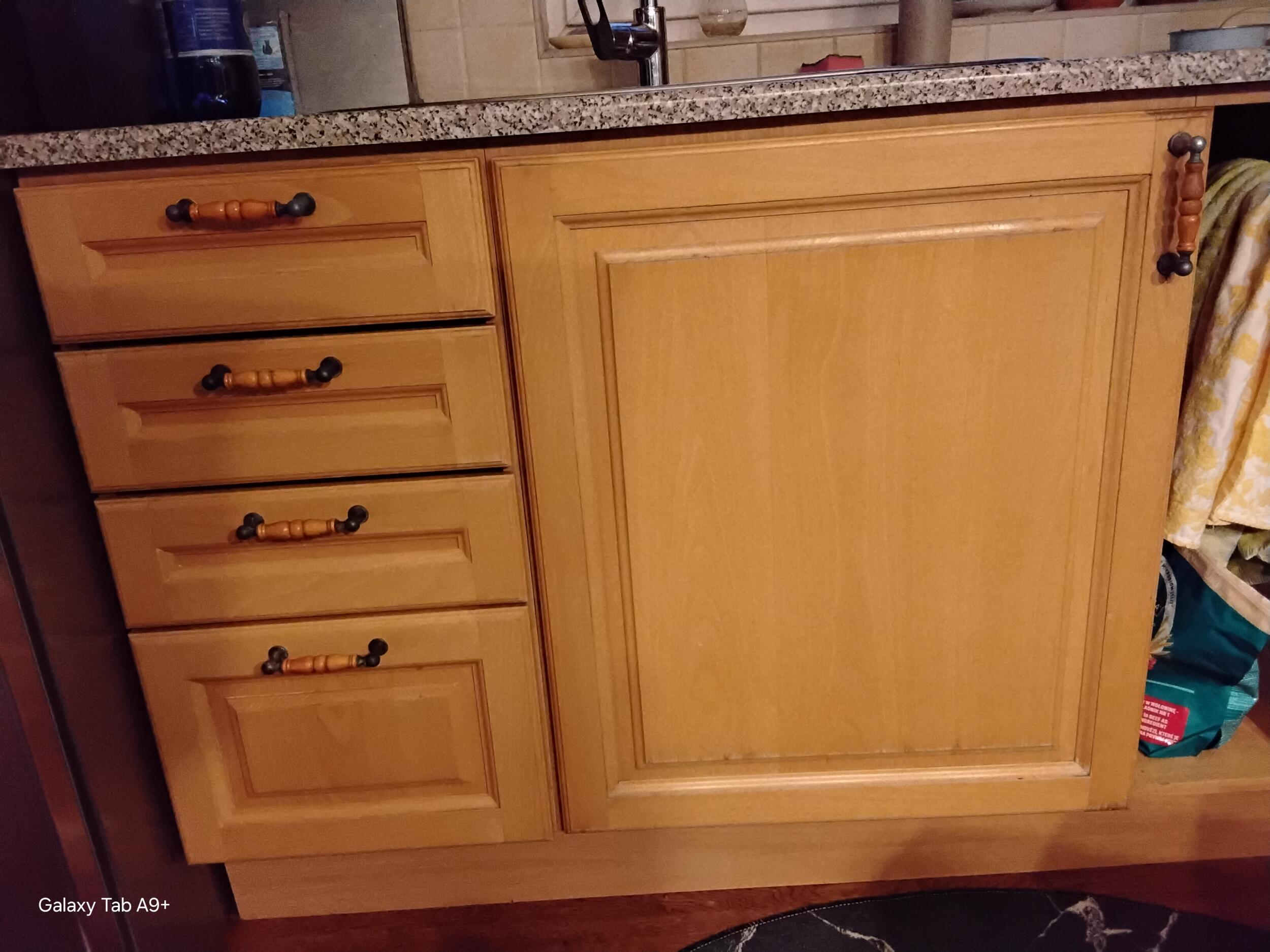 Köögimööbel puidust ,mis tuleks puhastada ja uuesti lakkida.
