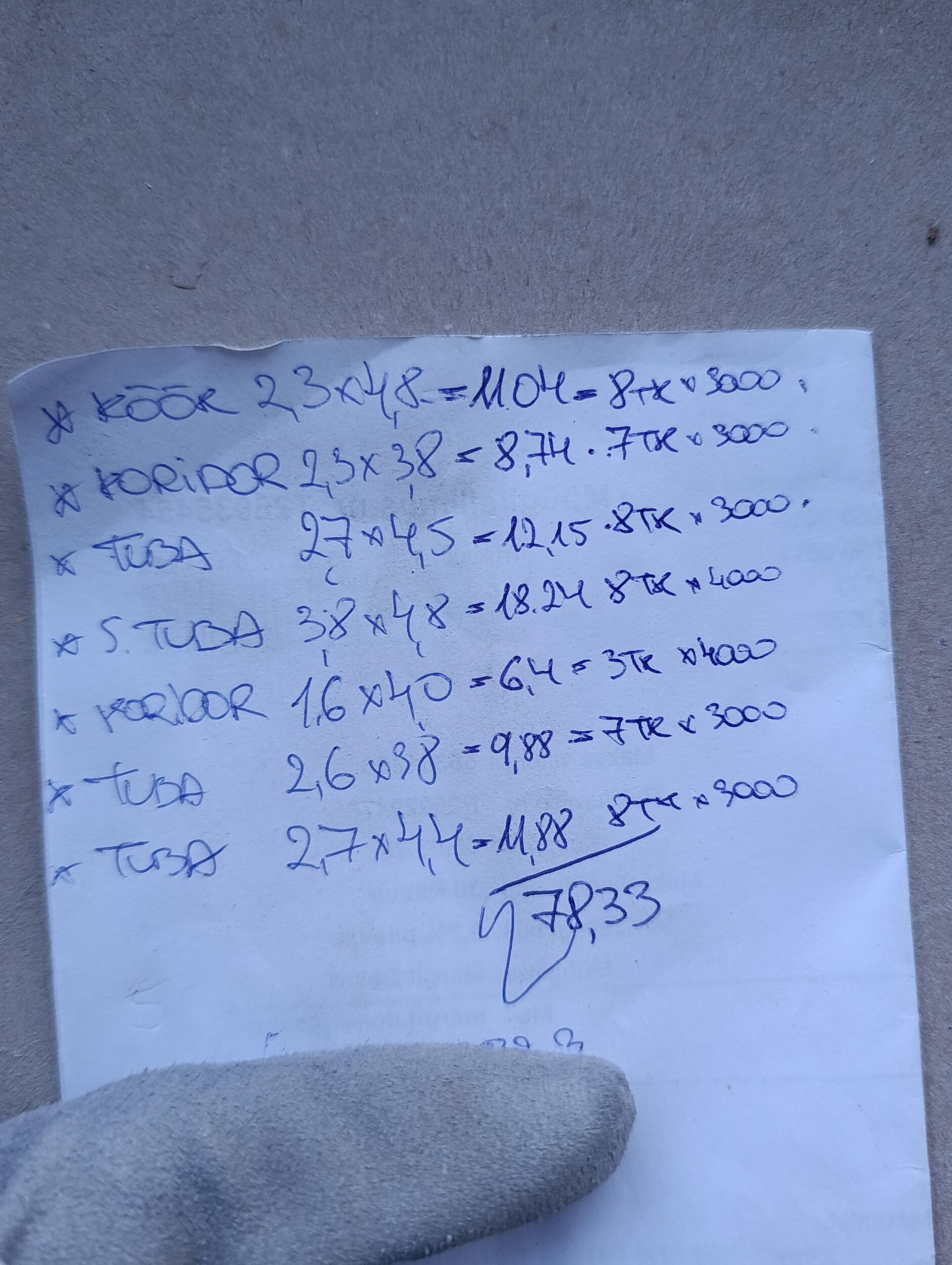 Korteri põrandad ca 80 ruutmeetrit. 3 magamistuba, avatud köök- koridor- elutuba. Esialgu sooviks karkass, vill, osb mille peale läheks parkett.
