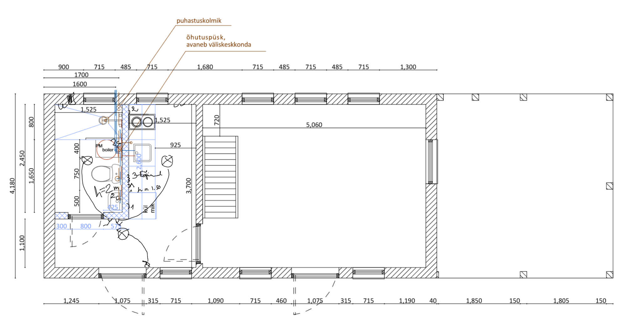 Plaan on sellesse eesruumi ehitada vaheseinad selliselt, et tekib eraldatud sanruum (u 4-5m2) ja köök-esik. Kirjale on lisatud väljavõte korruseplaanist, millele on elektrisoovid vabas vormis peale märgitud (olen valmis täpsustama, kui arusaamatu).