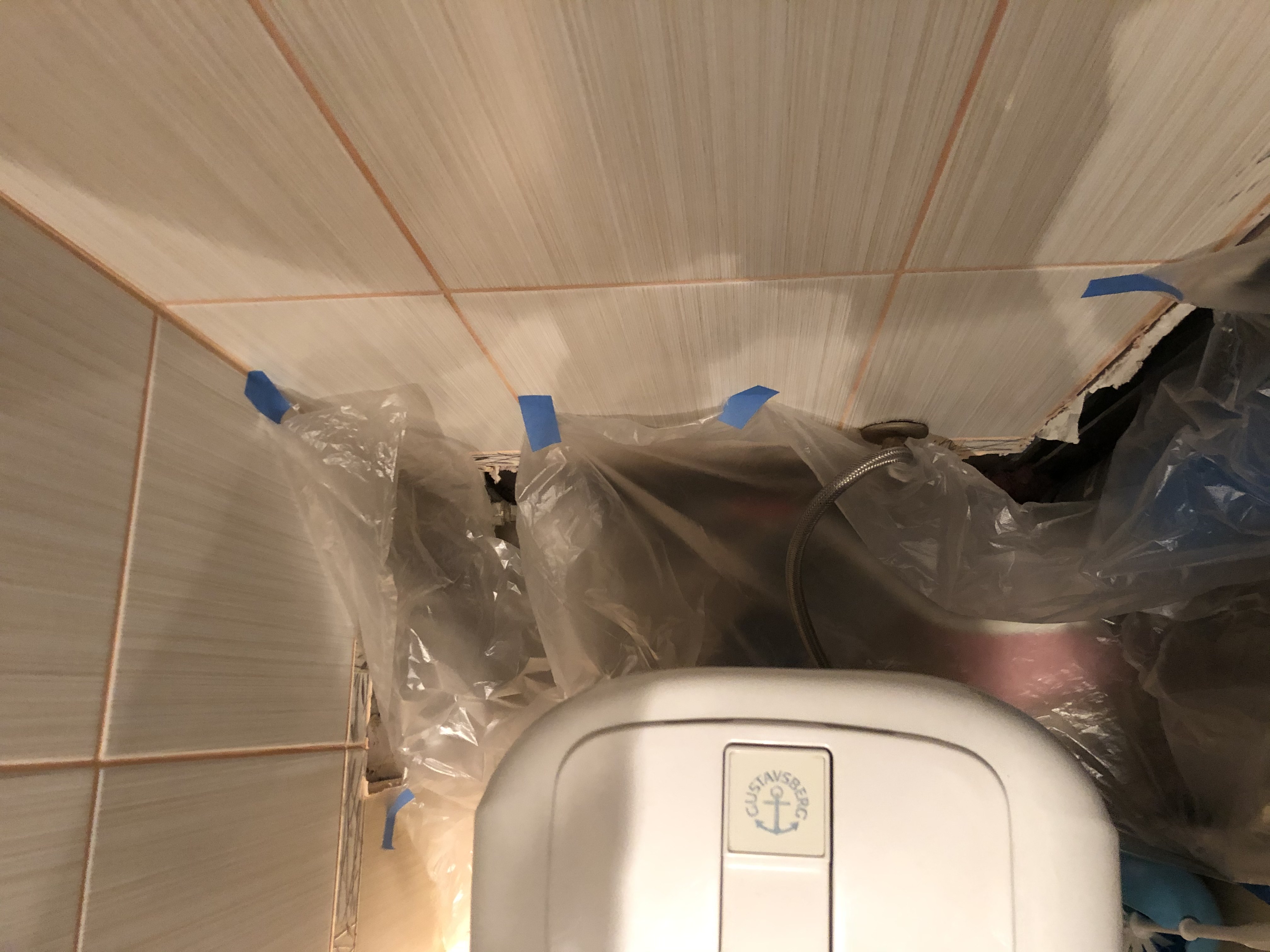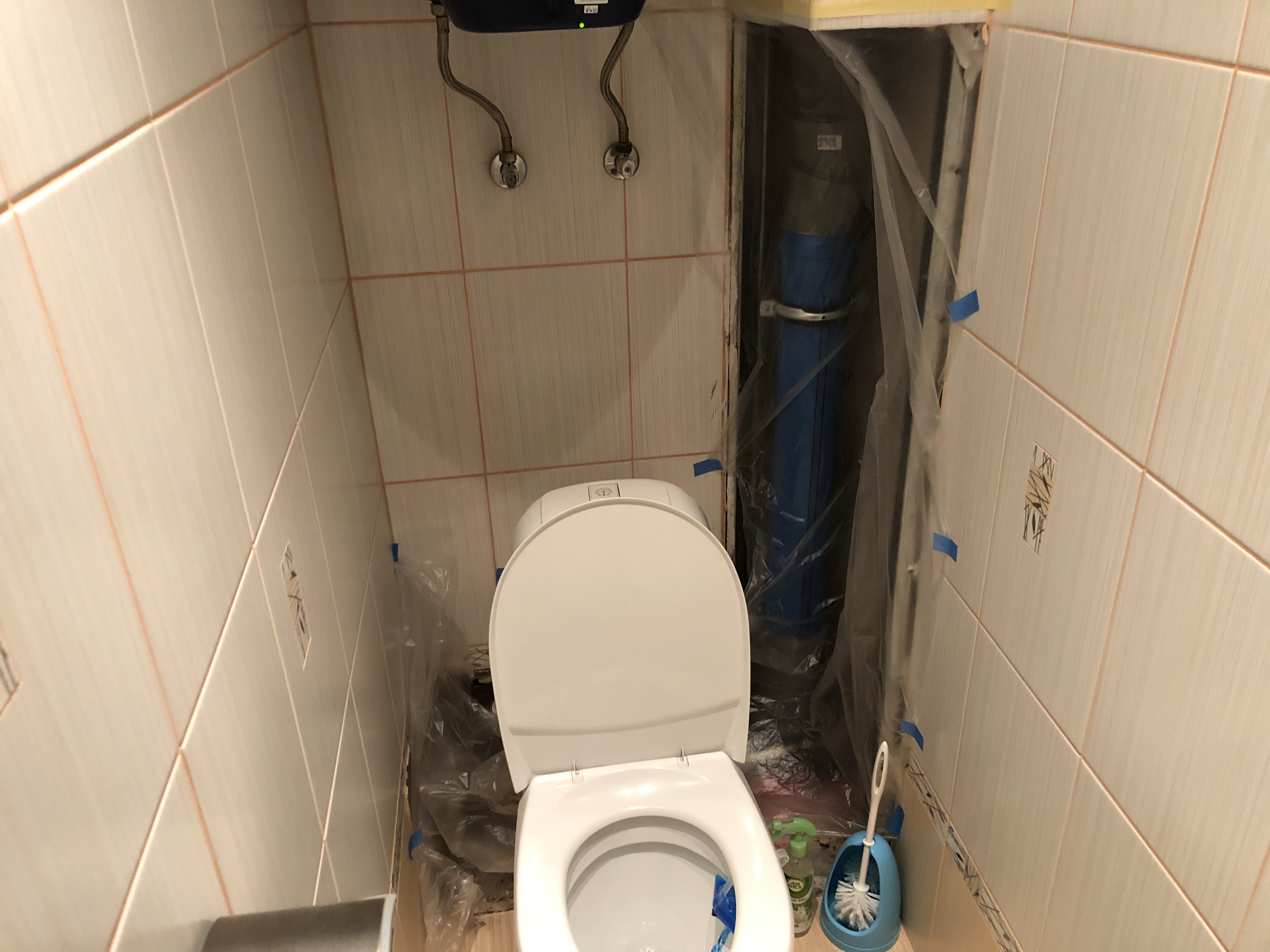 Teostada oleks vaja tualettruumis nö "restaureerimistöö", mida tegid torumehed torude vahetamiseks. Omalt poolt tulevad plaadid, silikon ja nurk. Kui võimalik, võiks taaskasutada vanu plaate, mis on ühe tüki küljes.
