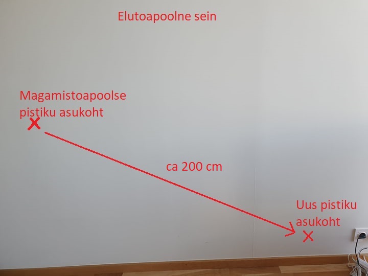 Kaabli vedu planeeritud järgnevalt: magamistoast alla tõmmata ja siis elutoast liistu alt välja tuua. Siis süvistada põranda ja kipsivahele ja siis õigest kohast elutoa poolses seinas üles tuua ning liist tagasi paigaldada. |