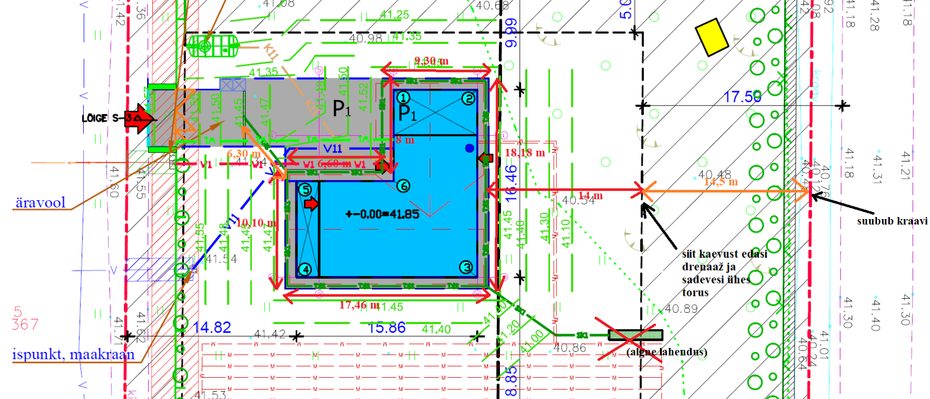 Sadevee ja drenaaži torud liituvad õuekaevus ja sealt edasi suundub ühes torus ca 14,5 m kaugusel olevasse kraavi. Lisaks 110 mm sadevee- ja drenaažitorule (võib pakkuda nii auguga kui ka filterkangaga kaetud toru) vaja paigaldada 5 sadeveelehtrit, igasse nurka drenaažikaev, õuekaev, mis on varustatud tagasivooluklapiga, materjali eraldav geotekstiil ja vajadusel liiv, (killustik hankija poolt).