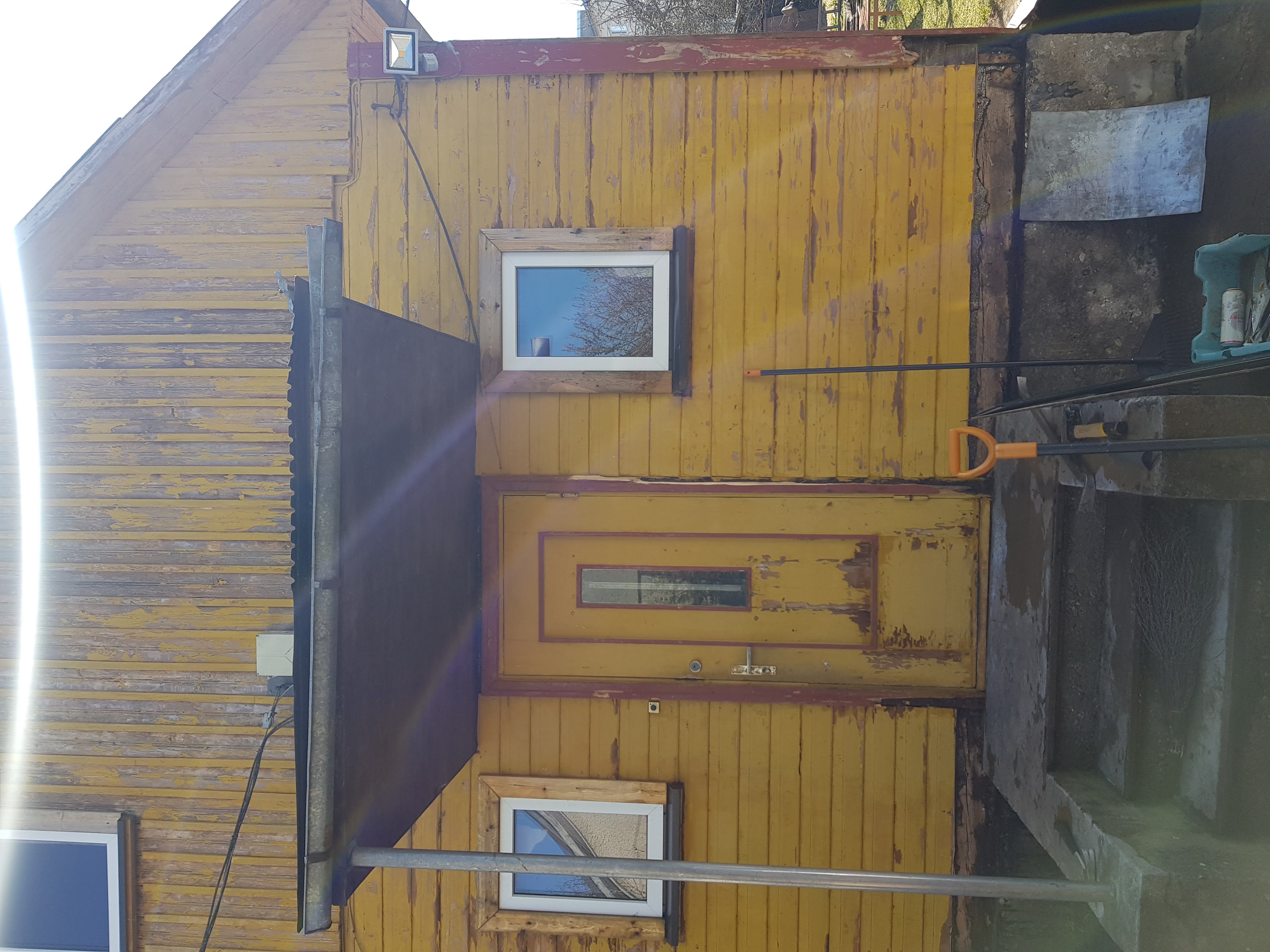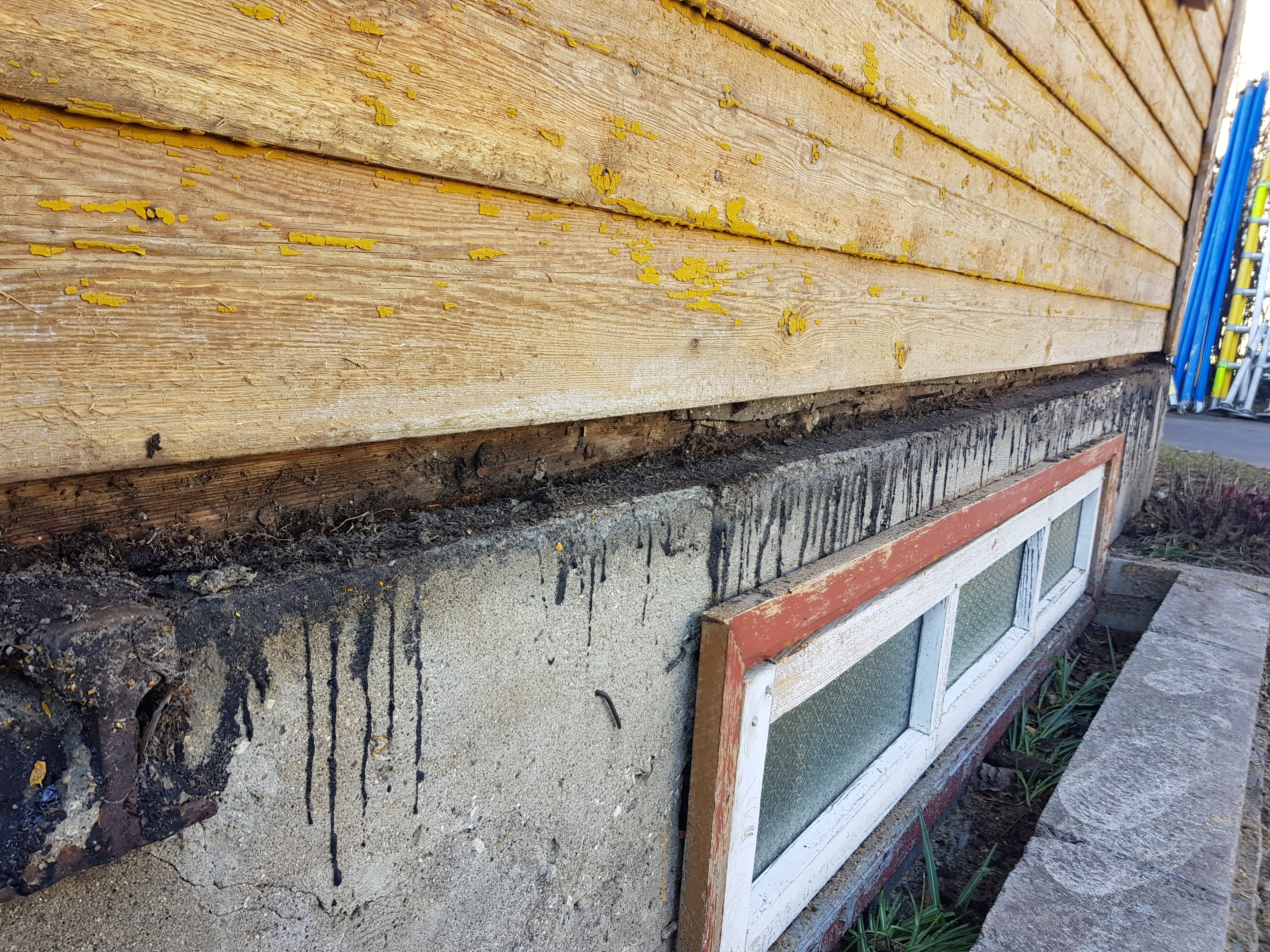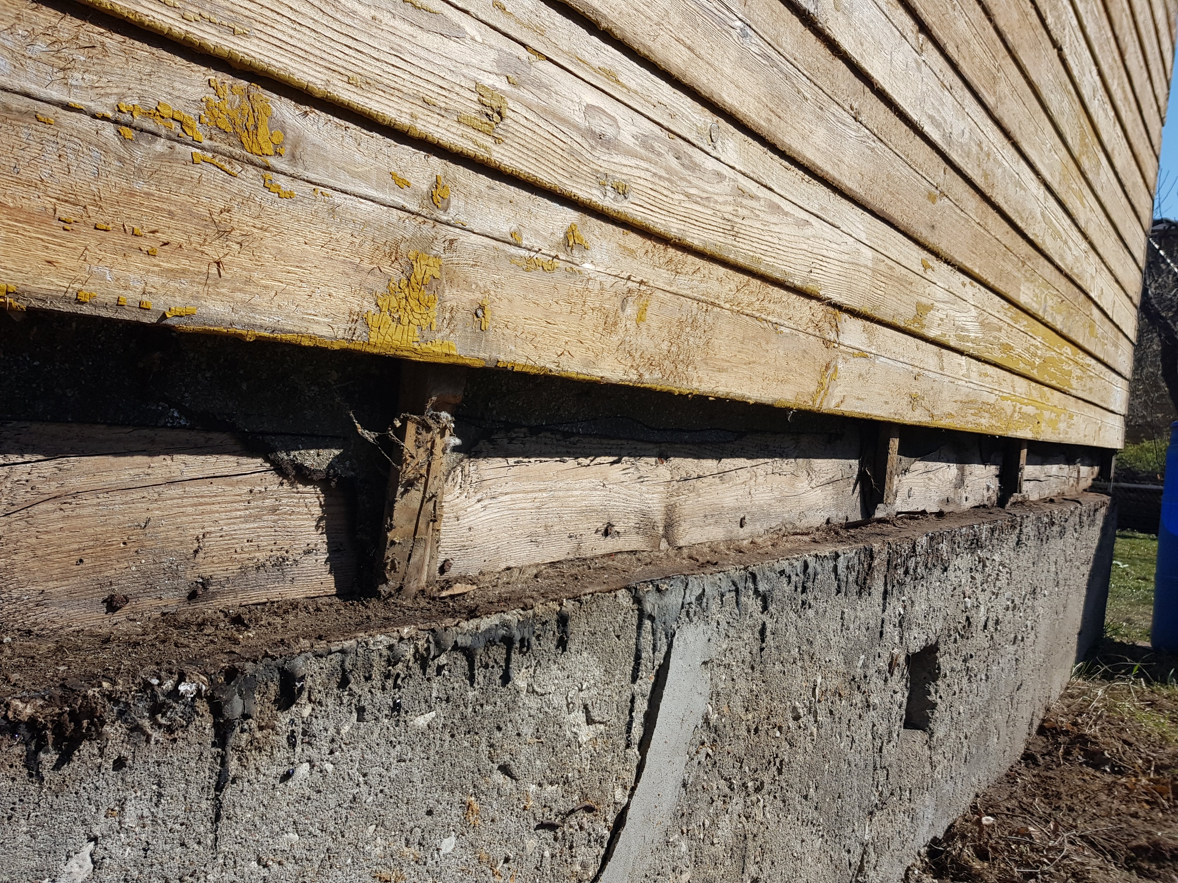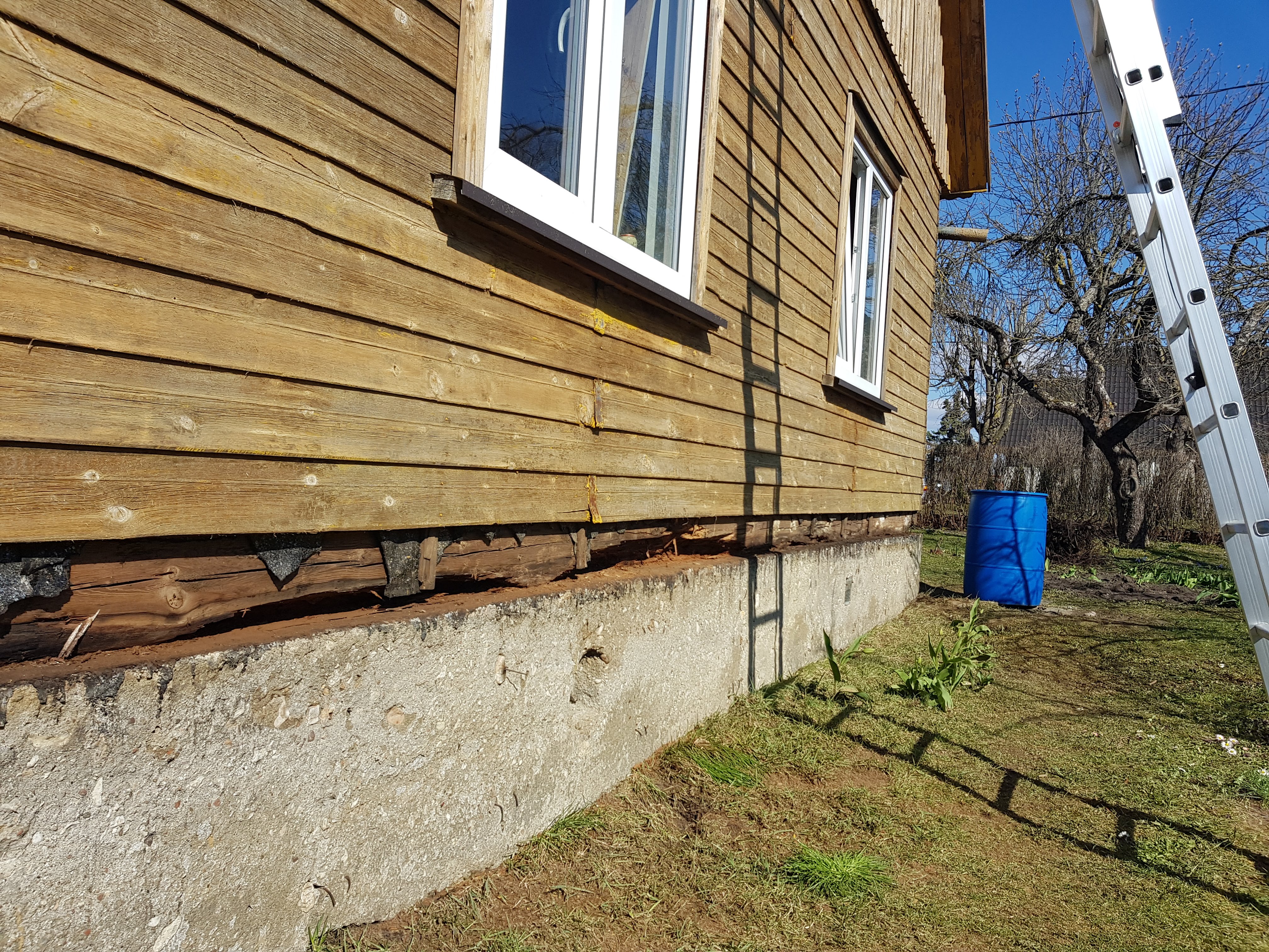 Palgil all kivivundament, maapinnast kõrgus ca 700mm. Eemaldatud on hetkel alumine voodrilaudise laua ring ning veenina (puidust).