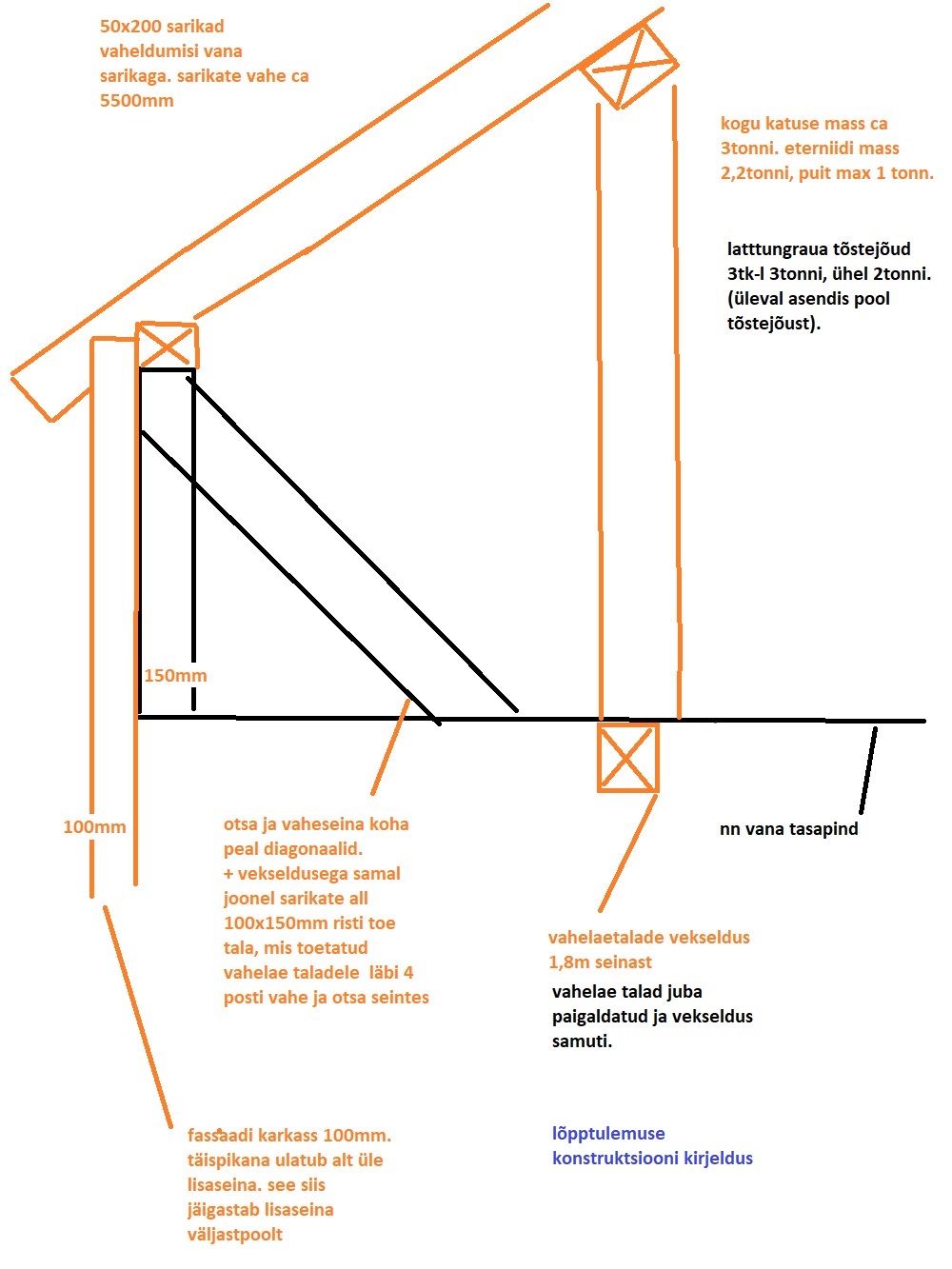 2. Katus ja uus sein toestada tugevdada fasaadi soojustuskarkassiga ja seejärel soojustada Parociga ja paigaldada fassaad (laudvooder). (uus vundament olemas, mille pealt tõsta ja kuhu saab ka fassaadi karkassi toetada)
