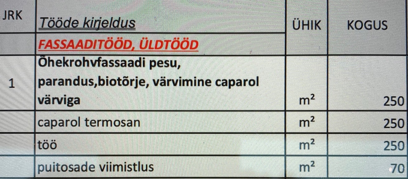 ID 51341 Tööde kirjeldus . Vihmaveerennide eemaldamine, fassaadi pesu survepesuriga ja Caparoli kivipesuainega (tolmu, rasvade ja hallituse eemaldamine), kattetööd (aknad, uksed, vent.avad),parandustööd struktuurkrohviga, fassaadi ja laudise värvimine värvipumbaga ja JetRolleriga, vihmaveerennide tagasi paigaldus ja koristustööd. Lisatud lingid värvi ja pesuaine kohta. http://www.caparol.ee/tooted/varvid/lisatooted/capaclean-fasadvatt?fbclid=IwAR3alQ9HuY79Xubg3tc5zYhg19rs0kVmj2lvHxclqwhdxlwpx3uUBrhcUgg https://www.caparol.ee/tooted/uelevaade |