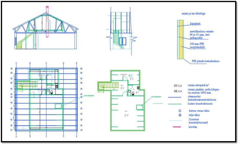 Teise korruse vaheseinad paigaldada vastavalt joonisele. Vaheseinas kasutada 43 mm metallkarkassi, soovitatav on vaheseinad täita kivivillaga, aitab parendada heliisolatsiooni. Vaheuste laius on 800 mm.