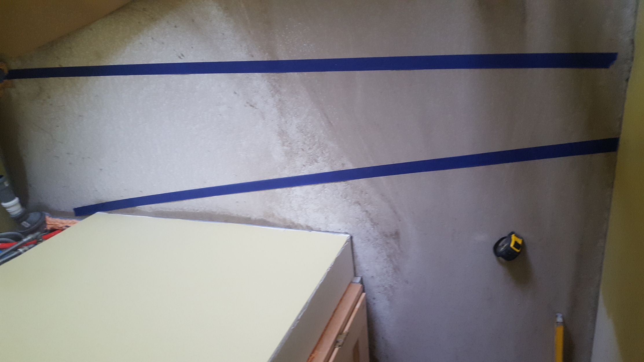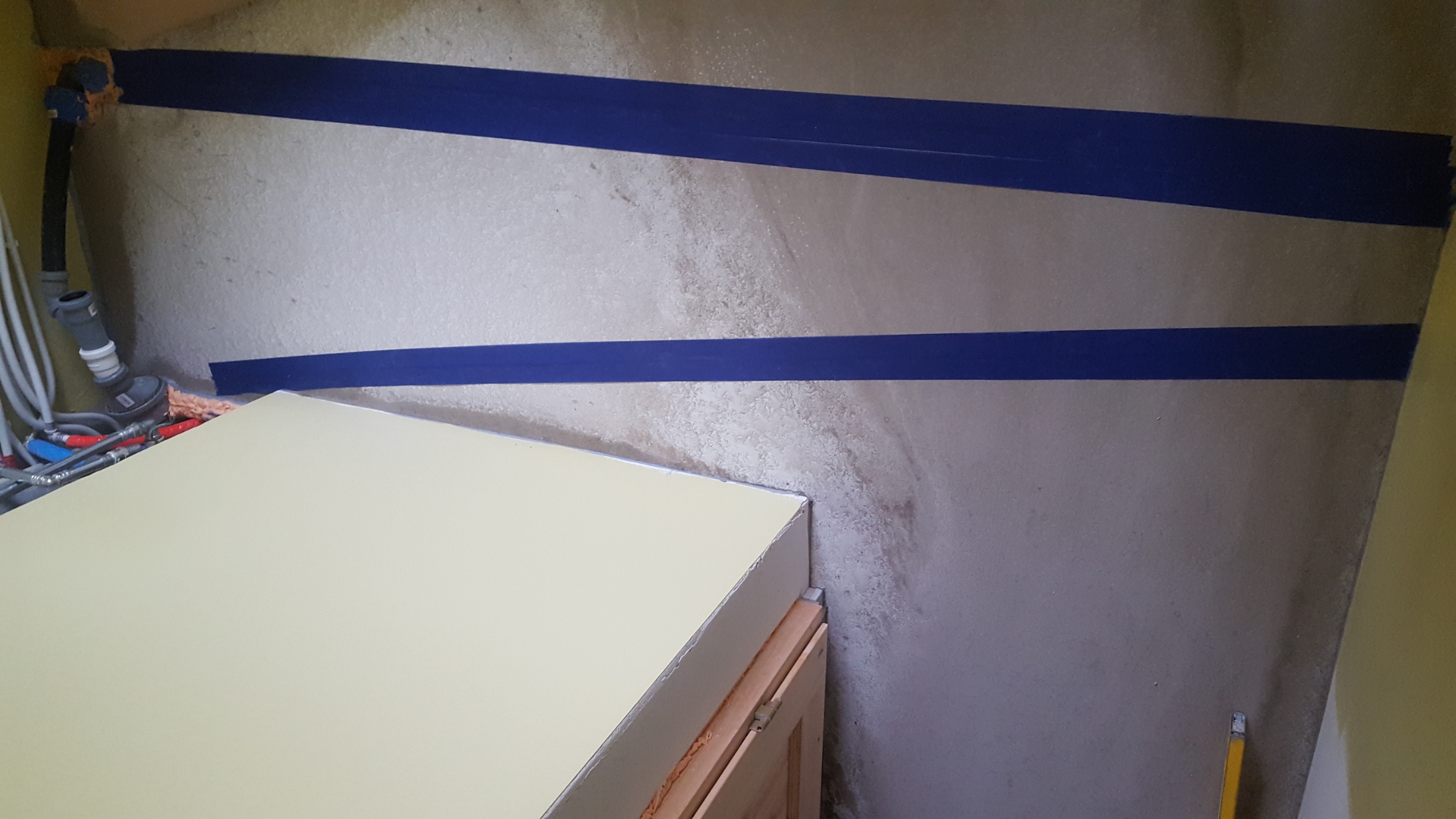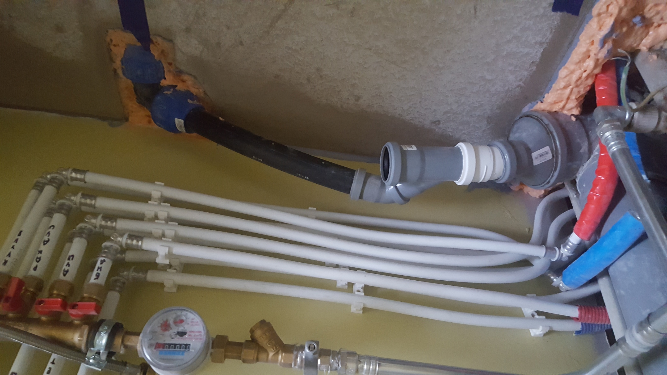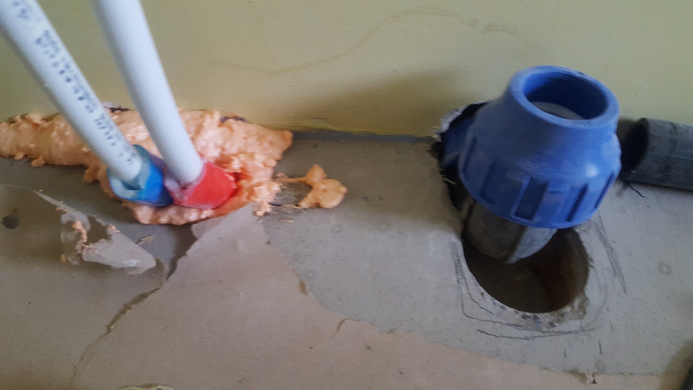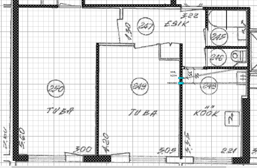 Mustamäe paneelmaja korteris on tehtud torutööd köögi üleviimiseks kõrvalasuvasse elutuppa. Plasttorud (külma ja soe vee torud ning kanalisatsioonitoru) viidi läbi kahe sirge väljalõigatud kanali põranda all, peale valati isetasanduv segu. Ühenduskohtades on kasutatud ehitusvahtu. Torudel kallet ei ole, reovee eemaldamiseks hakatakse kasutama pumpa.