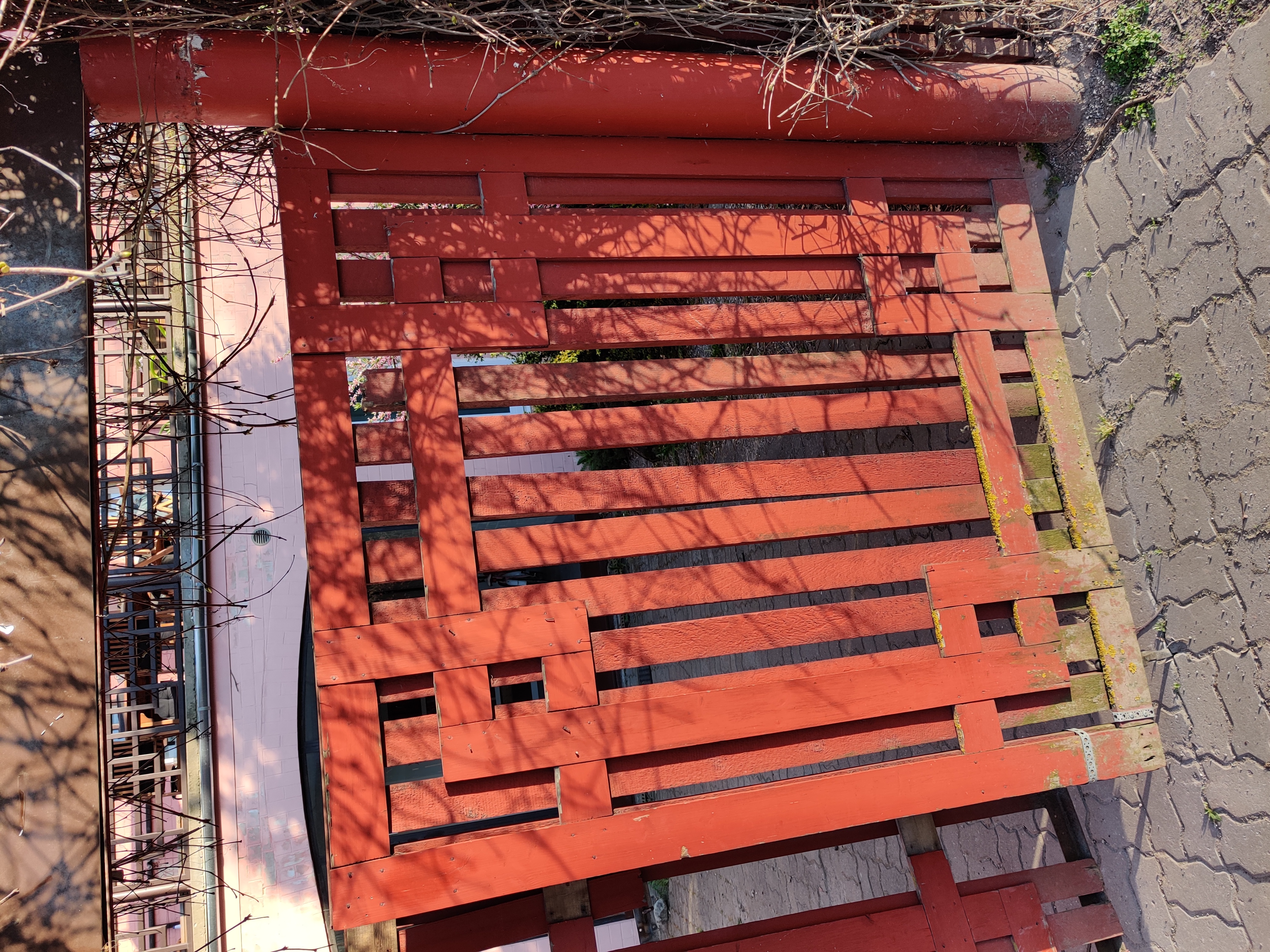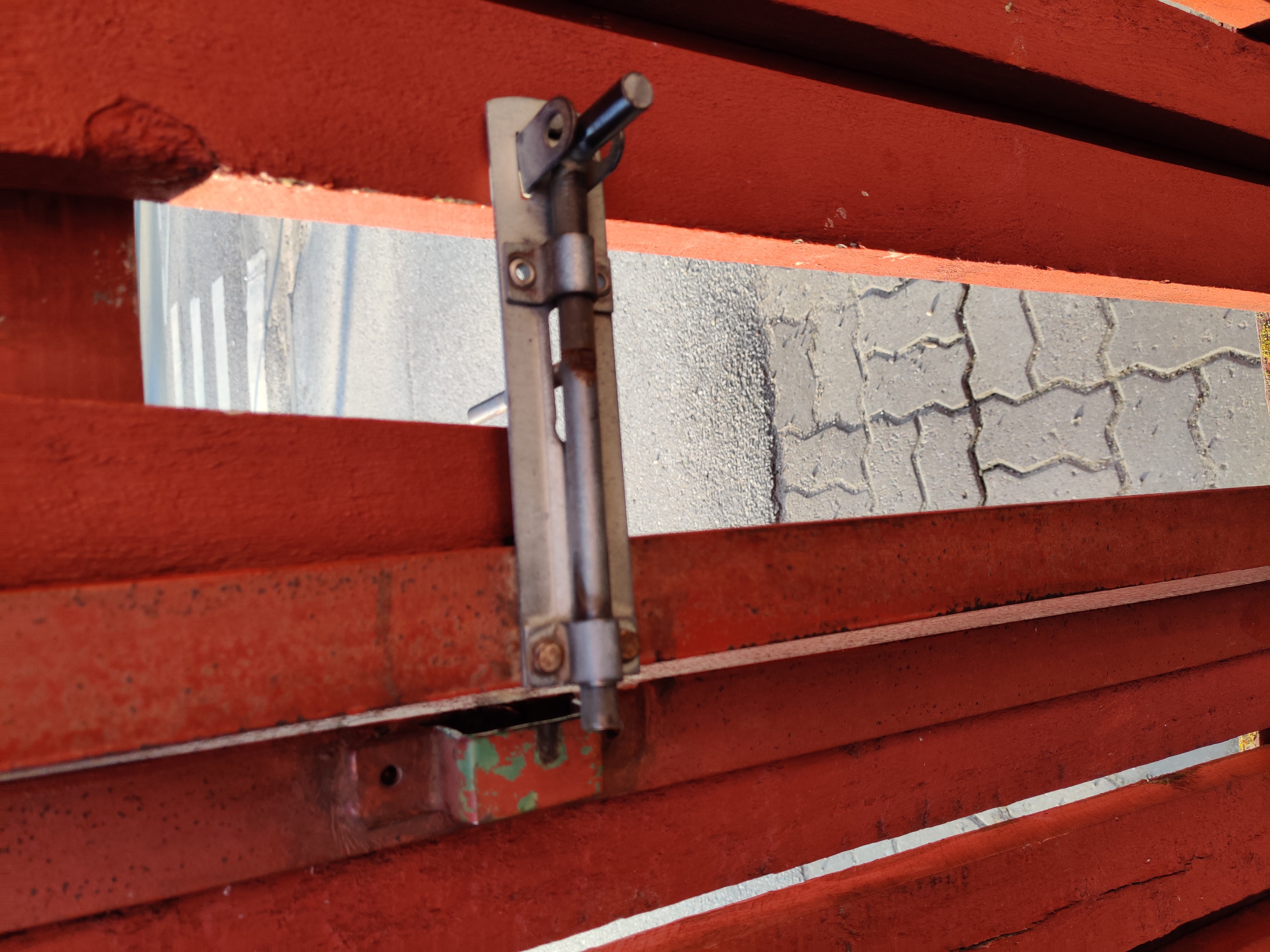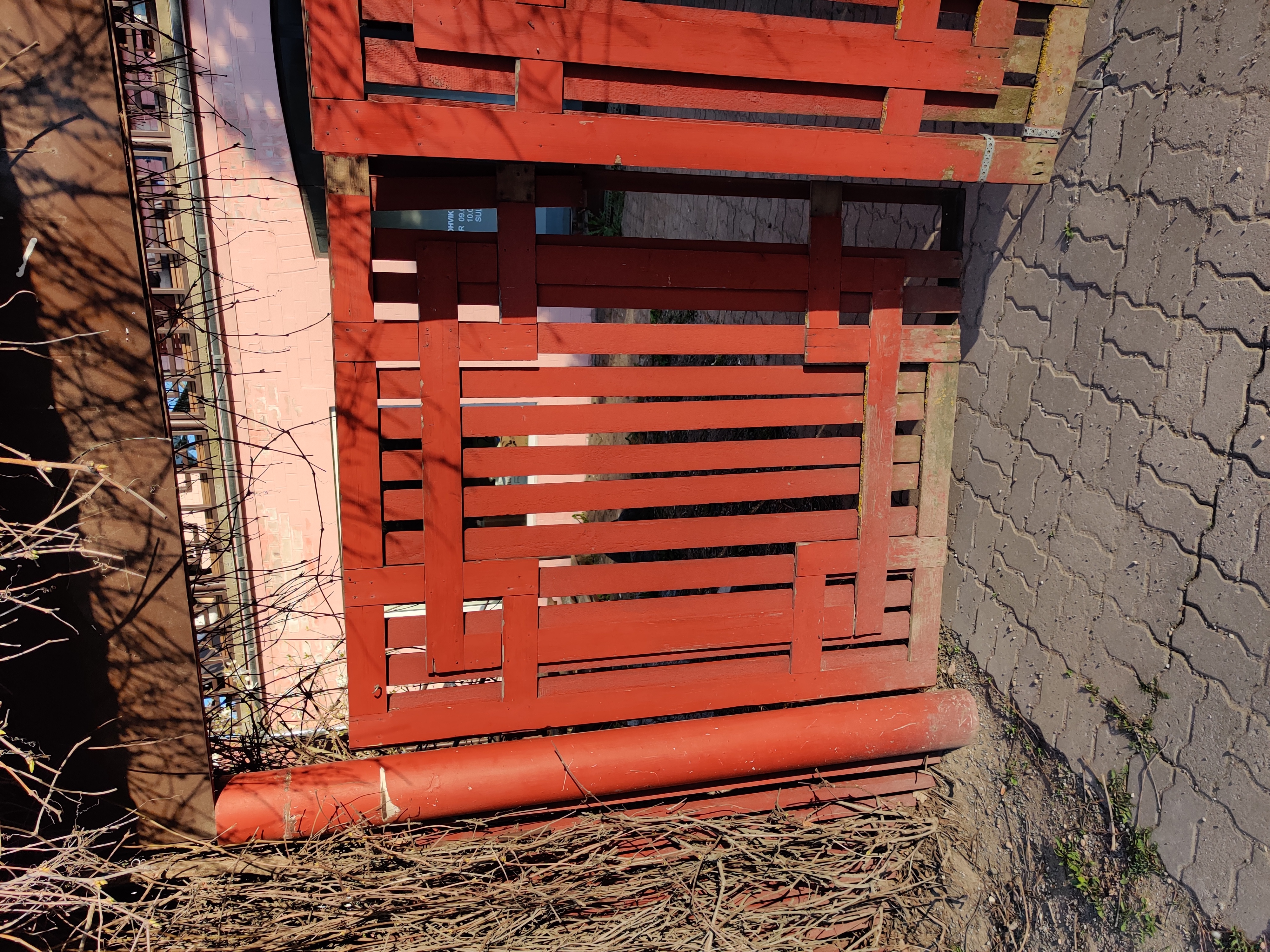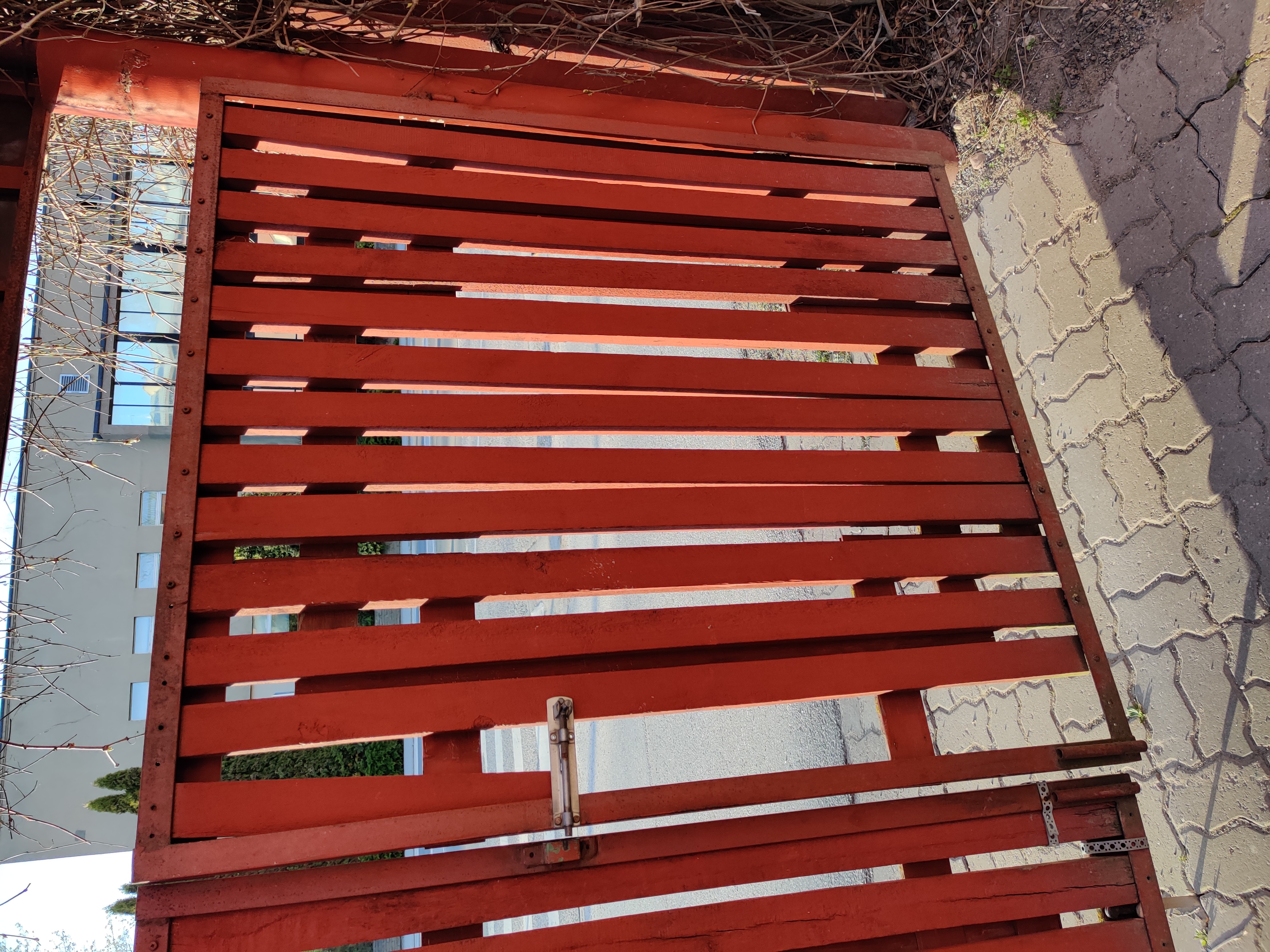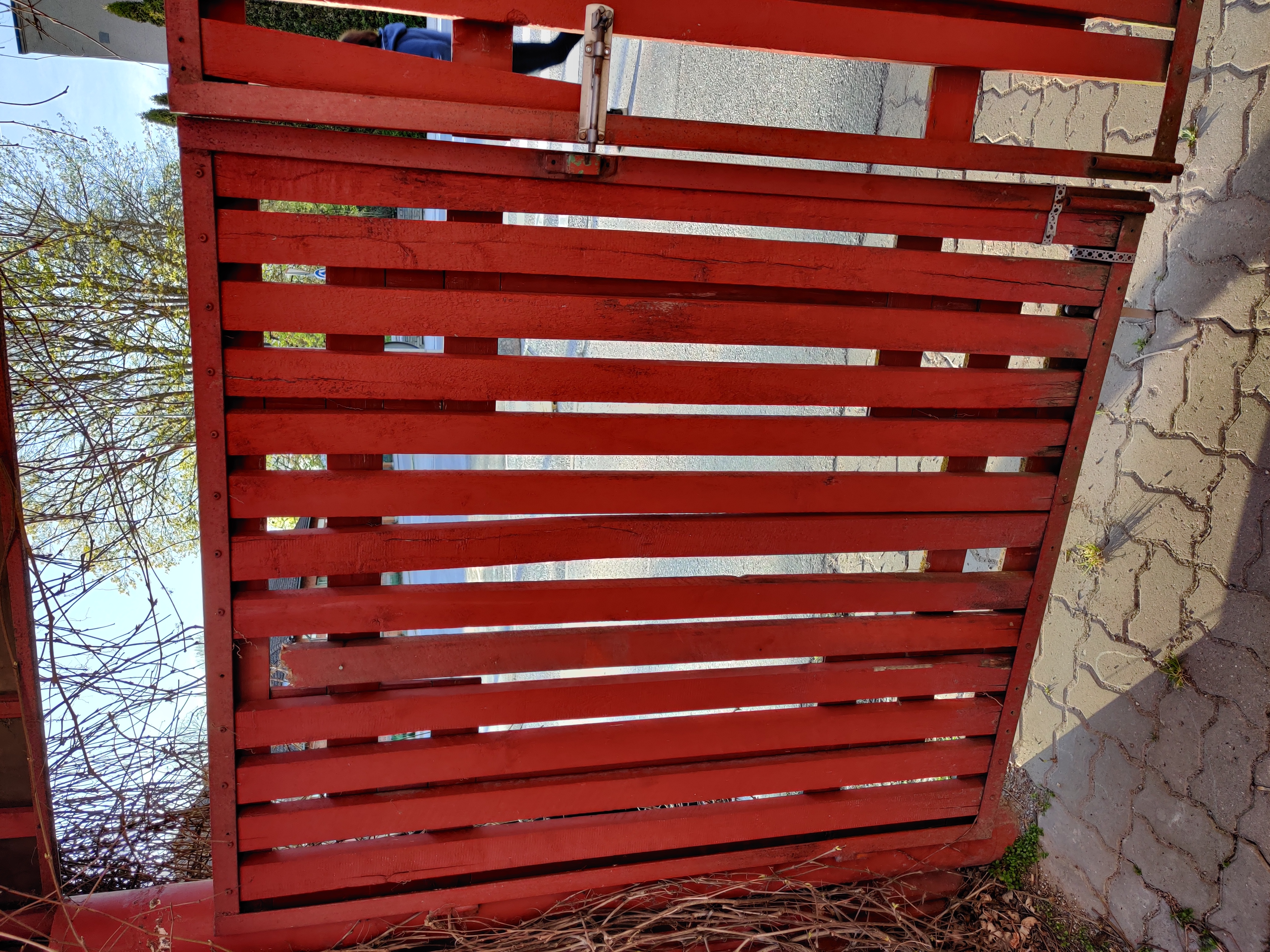 Uuendamist vajab ka värav. Jällegi lihtsustab tööd, et uut raami ei ole vaja teha - sama metallraami võib ära kasutada - lihtsalt raami värv uuendada. Lauad paigutada nii, nagu varasemalt ja välisküljele tagasi ka muster, mida pildil näha. Lisaks panna tagasi riiv (siin võib pakkuda ka natuke toekamat/uuemat lahendust, et oleks mugav nii seest kui väljast riivi avada). Praegu on kadunud ka pulk, mis värava ühte poolt fikseeriks - selle peaks ka lisama.